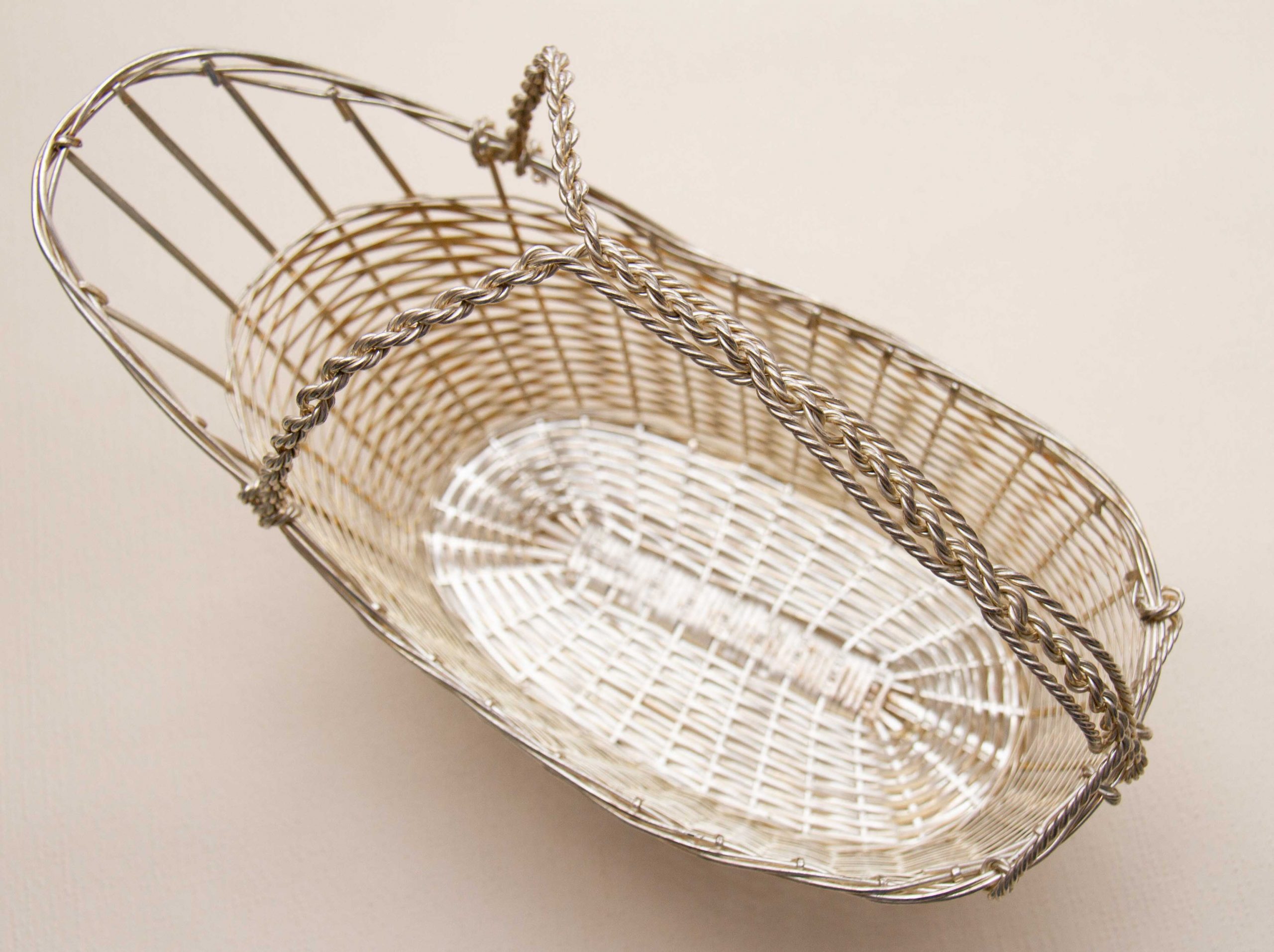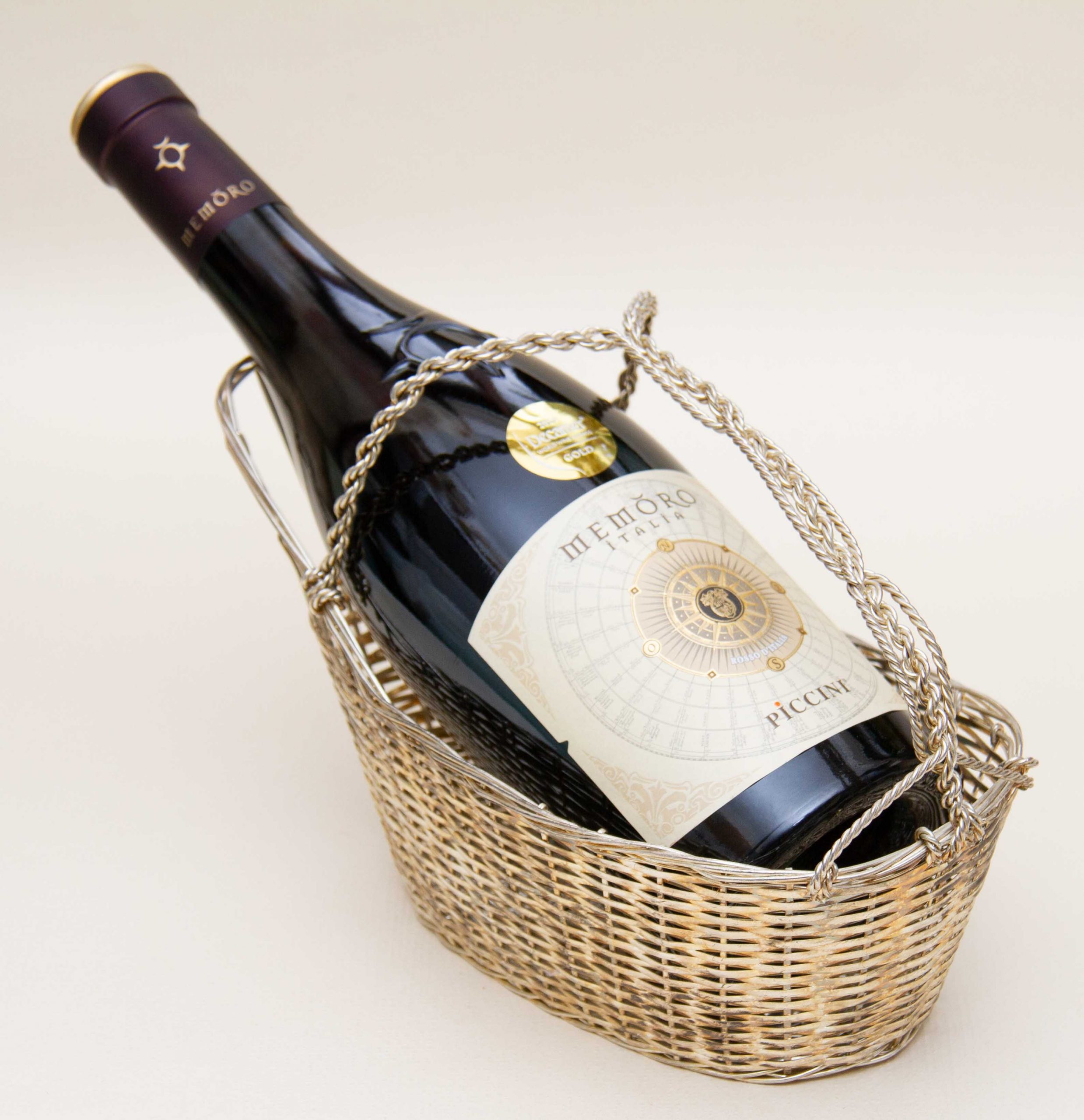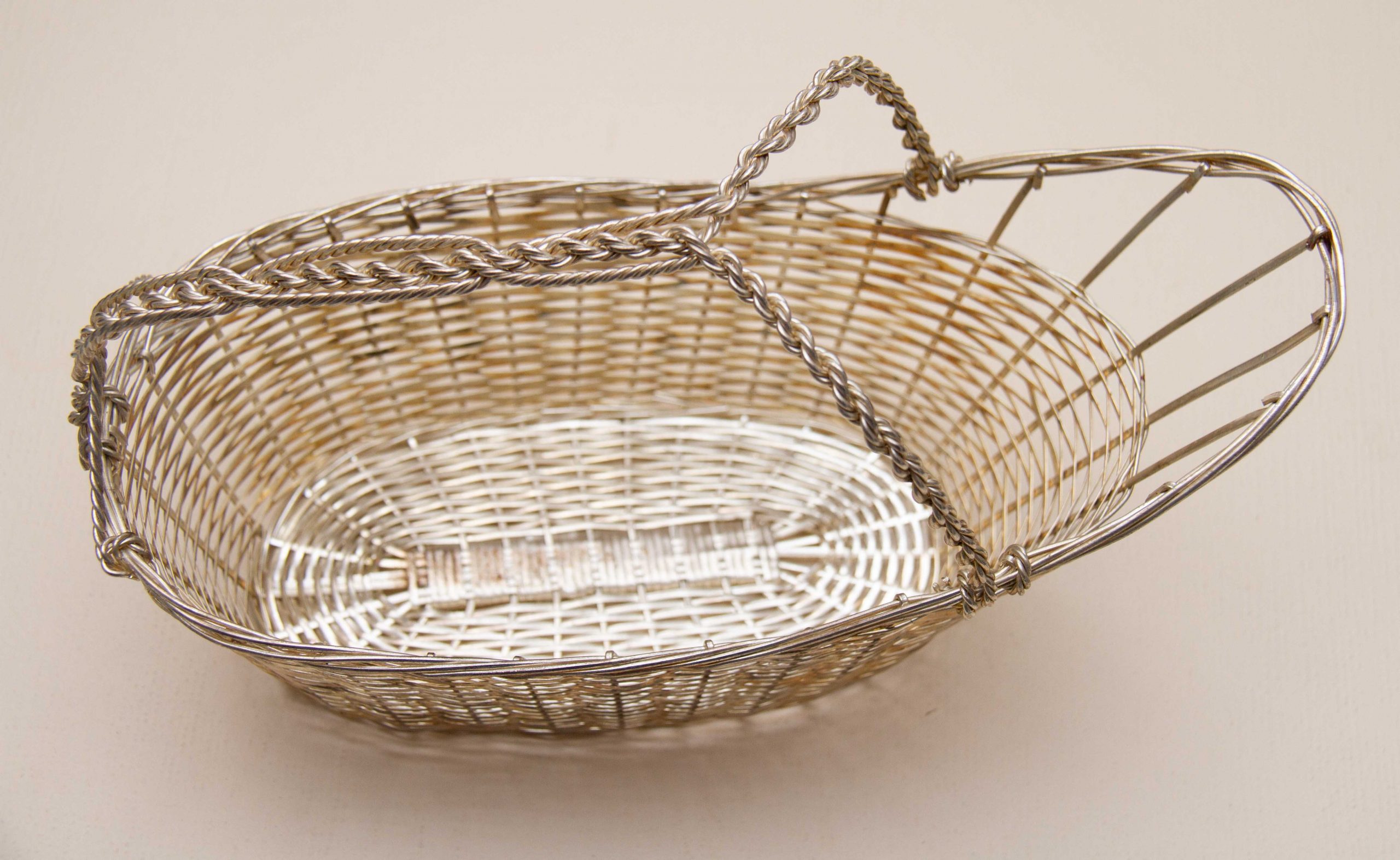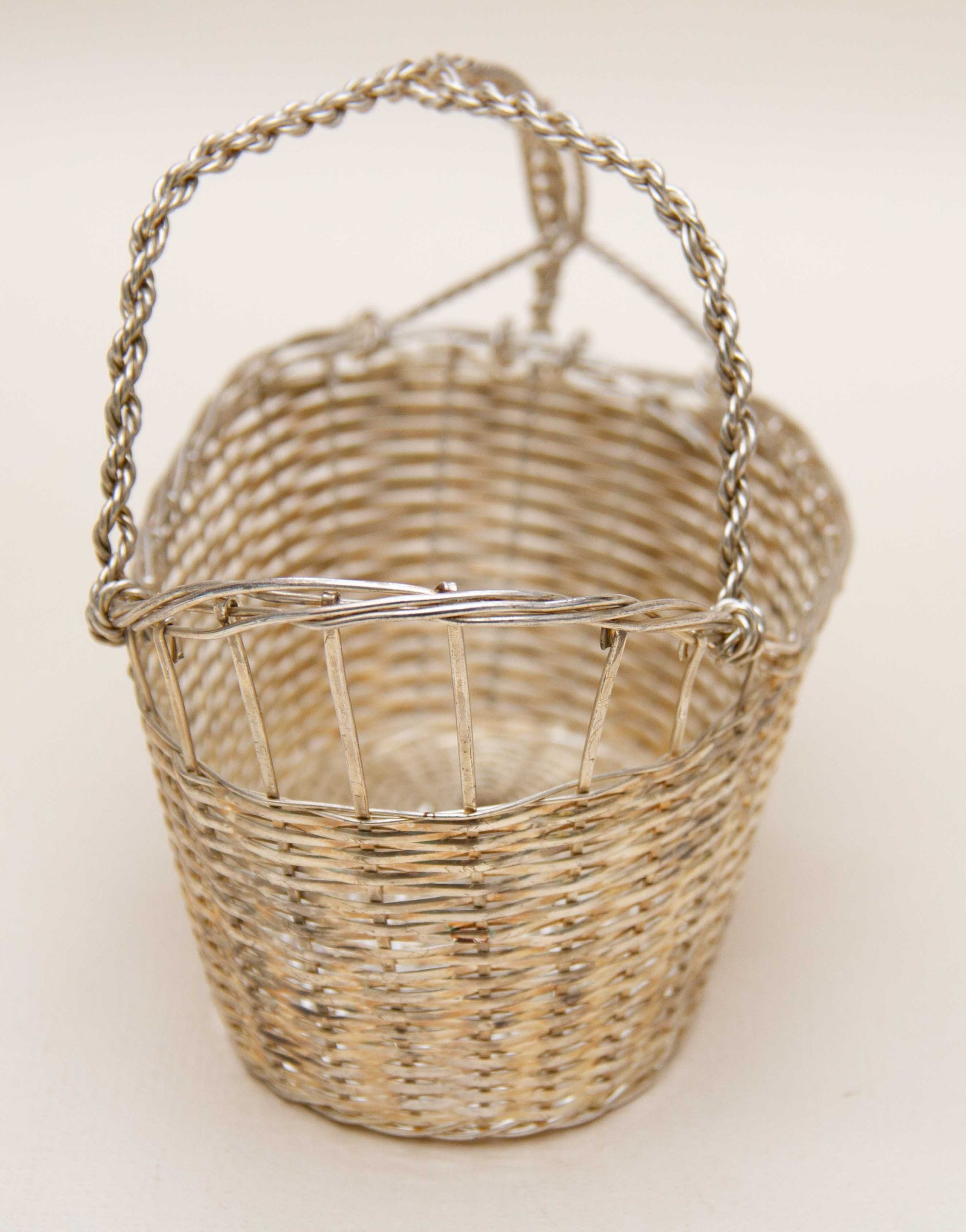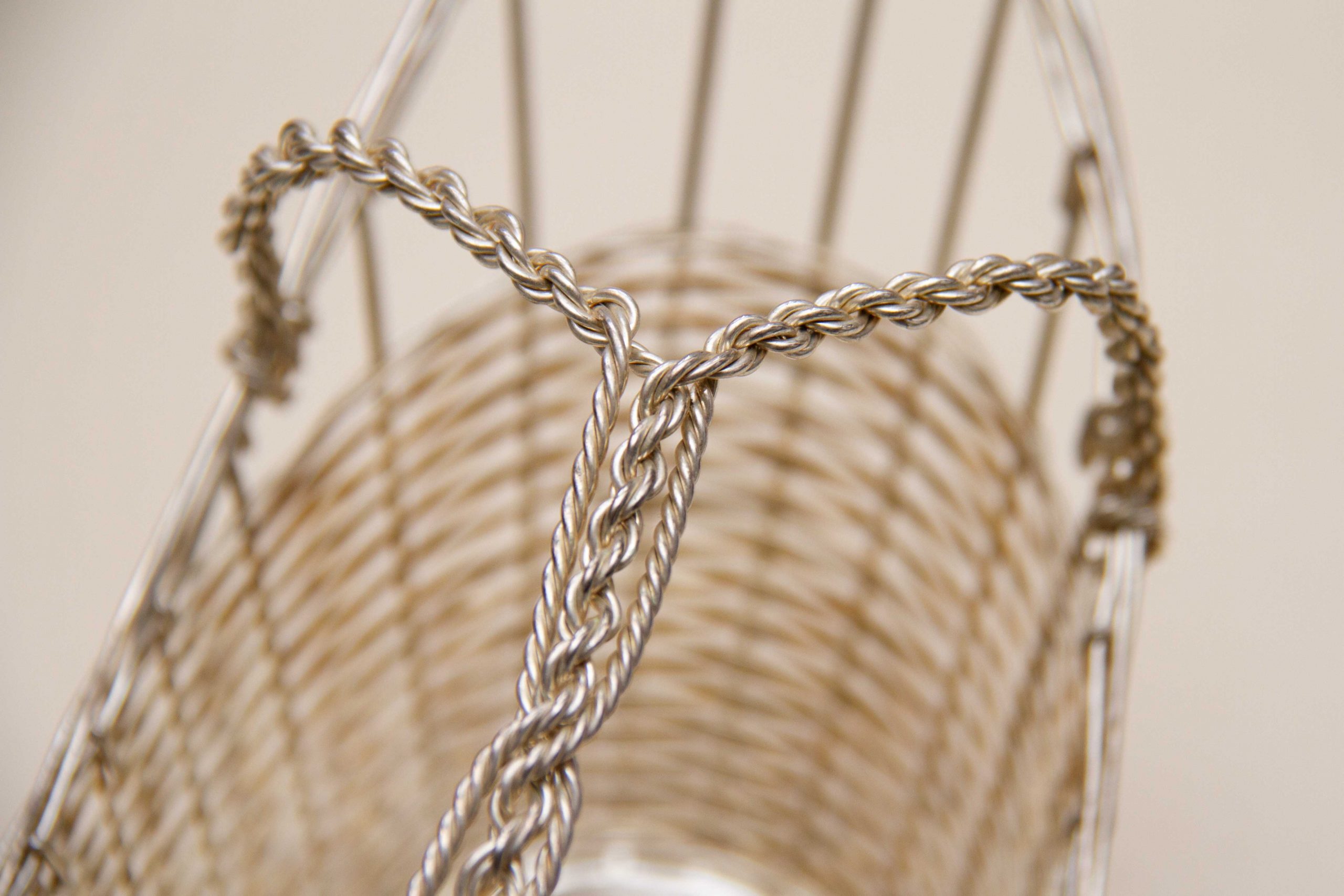 A vintage silver plated woven basket wine bottle pourer and holder with a handle. Perfect for displaying and presenting a special bottle of wine.