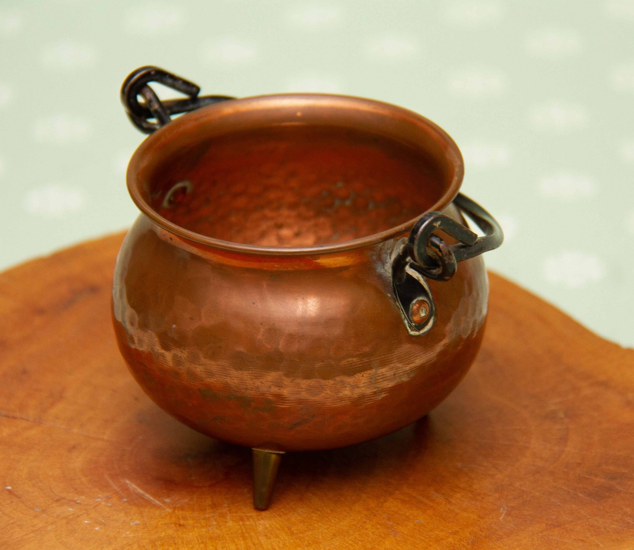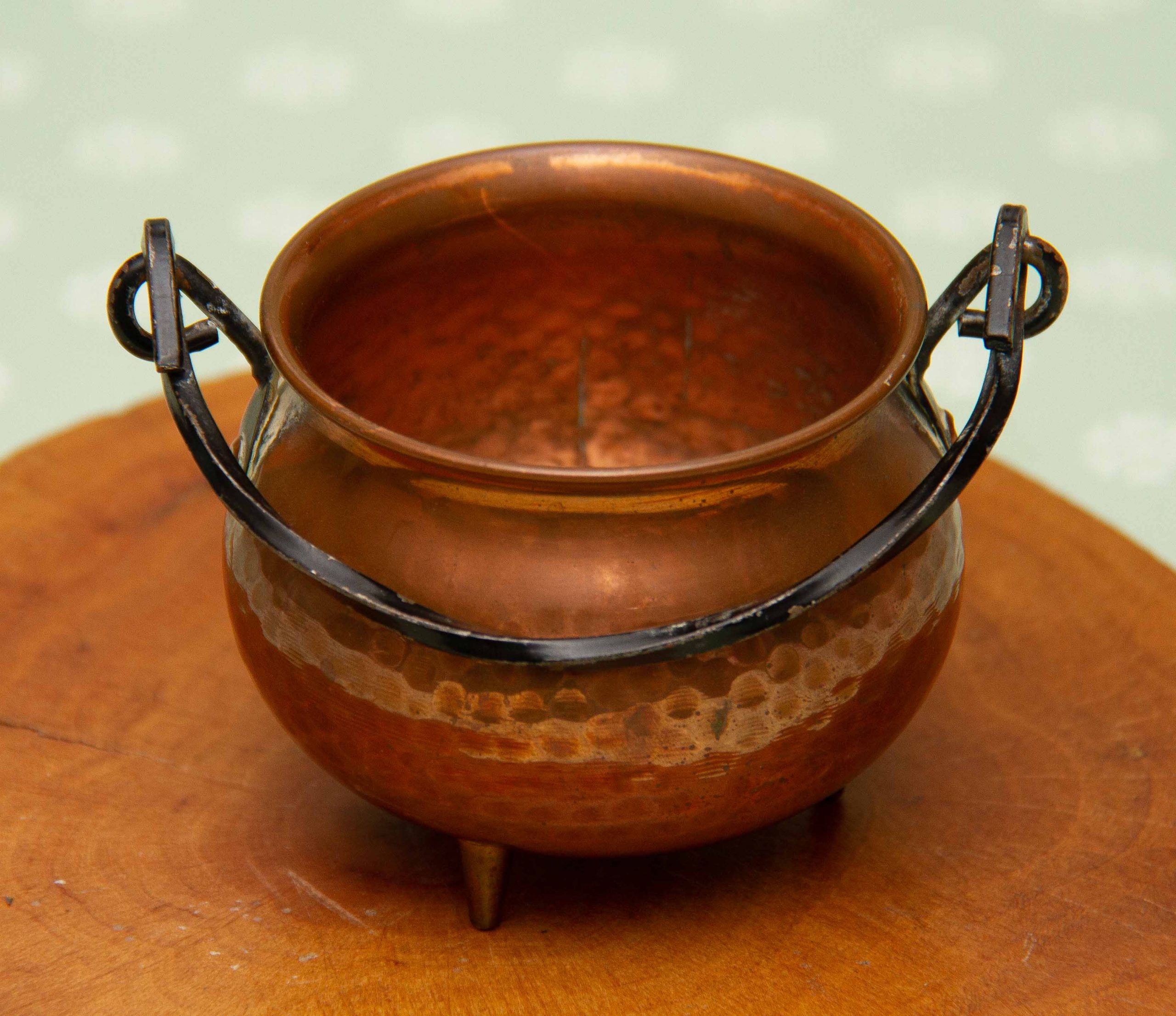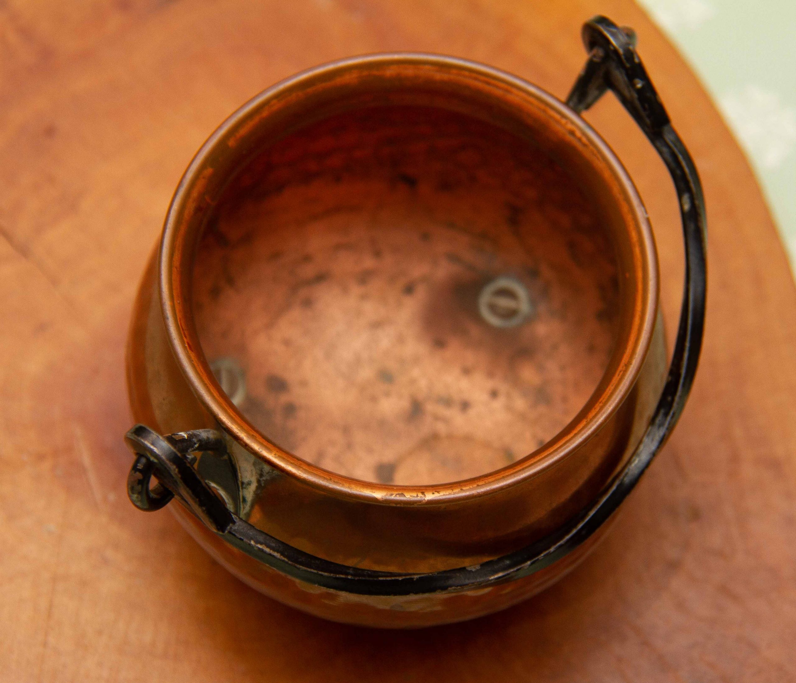 A small vintage hand beaten copper cauldron with a twisted black wrought iron handle. Just the right size for holding a tea light candle.