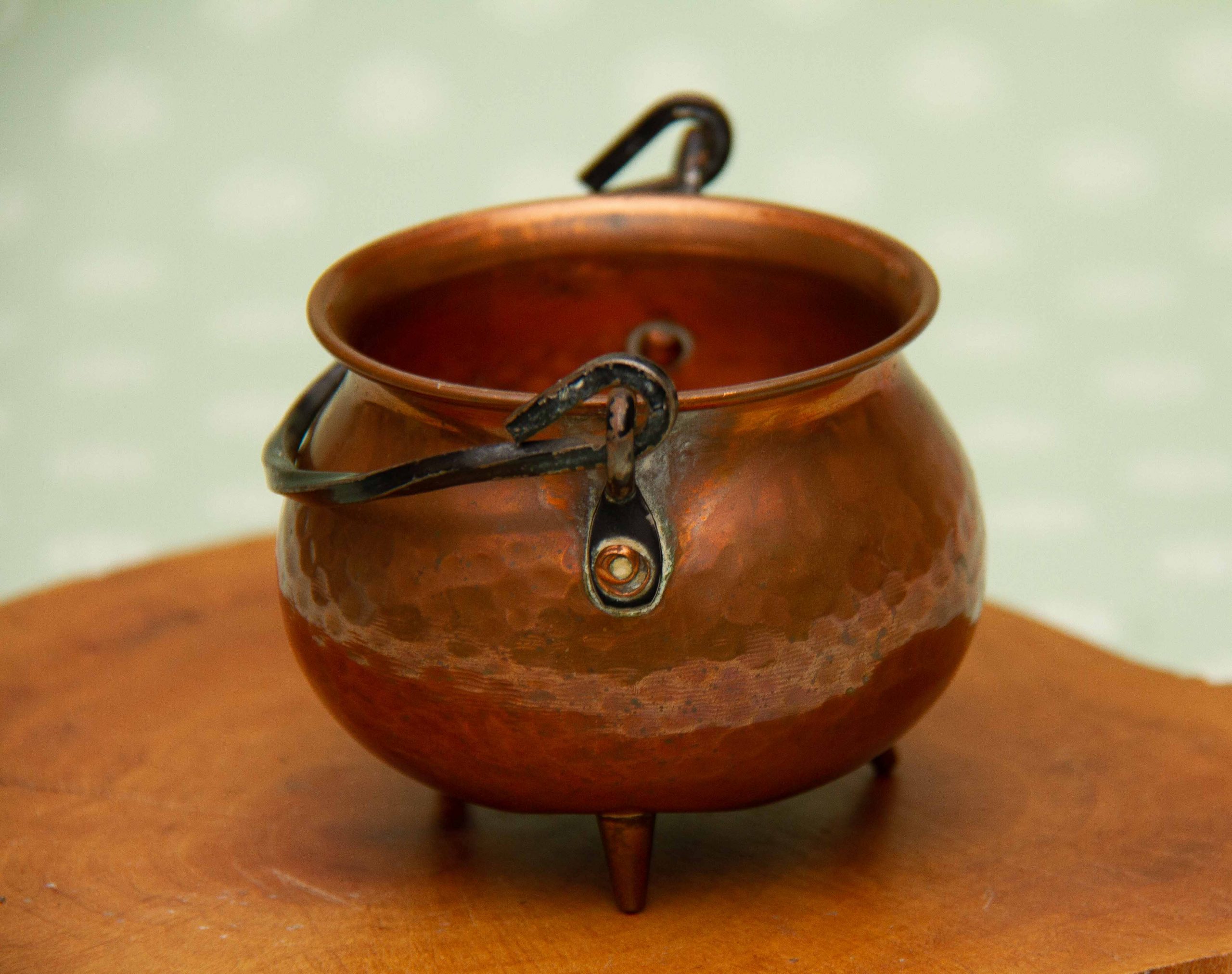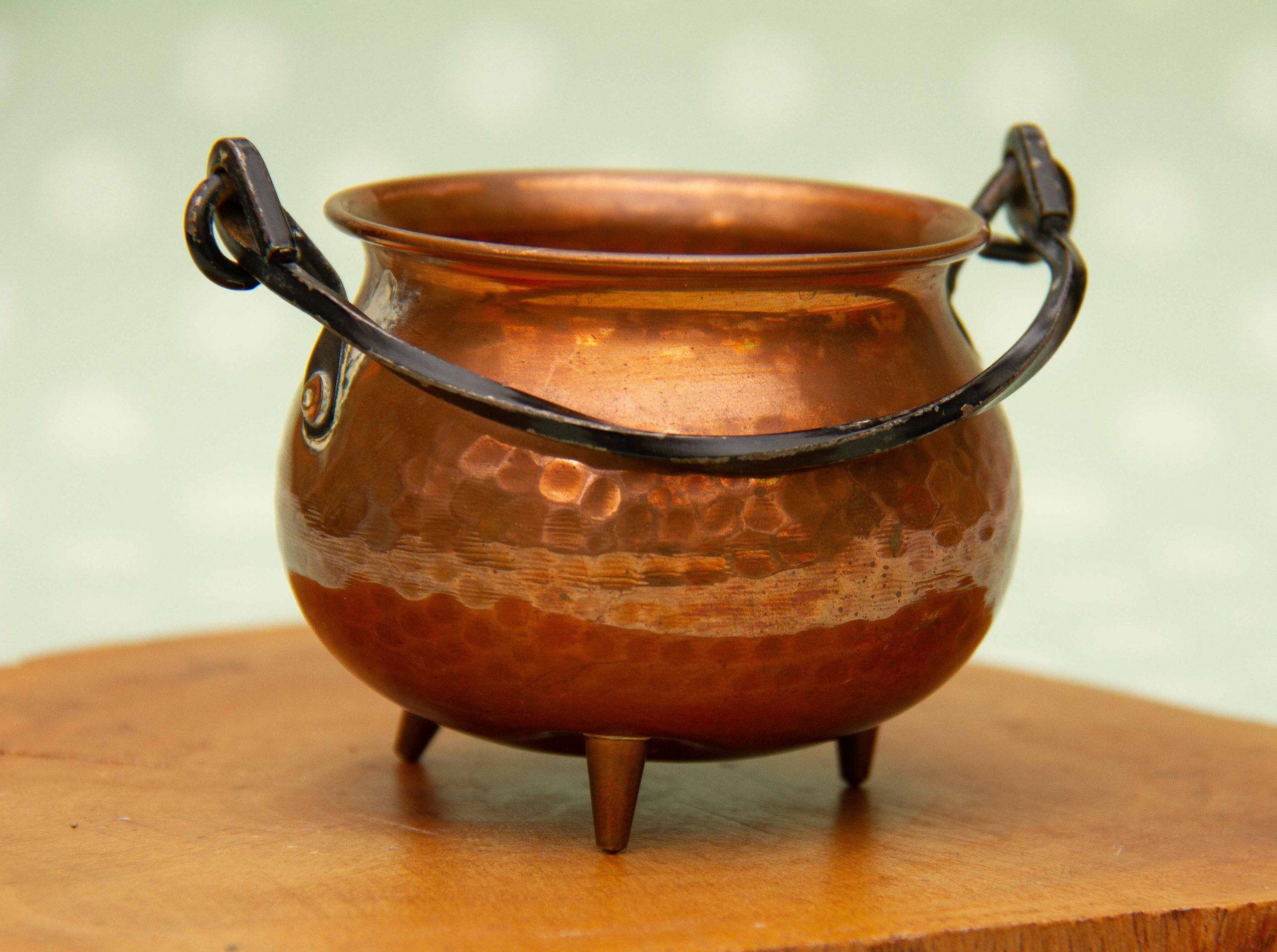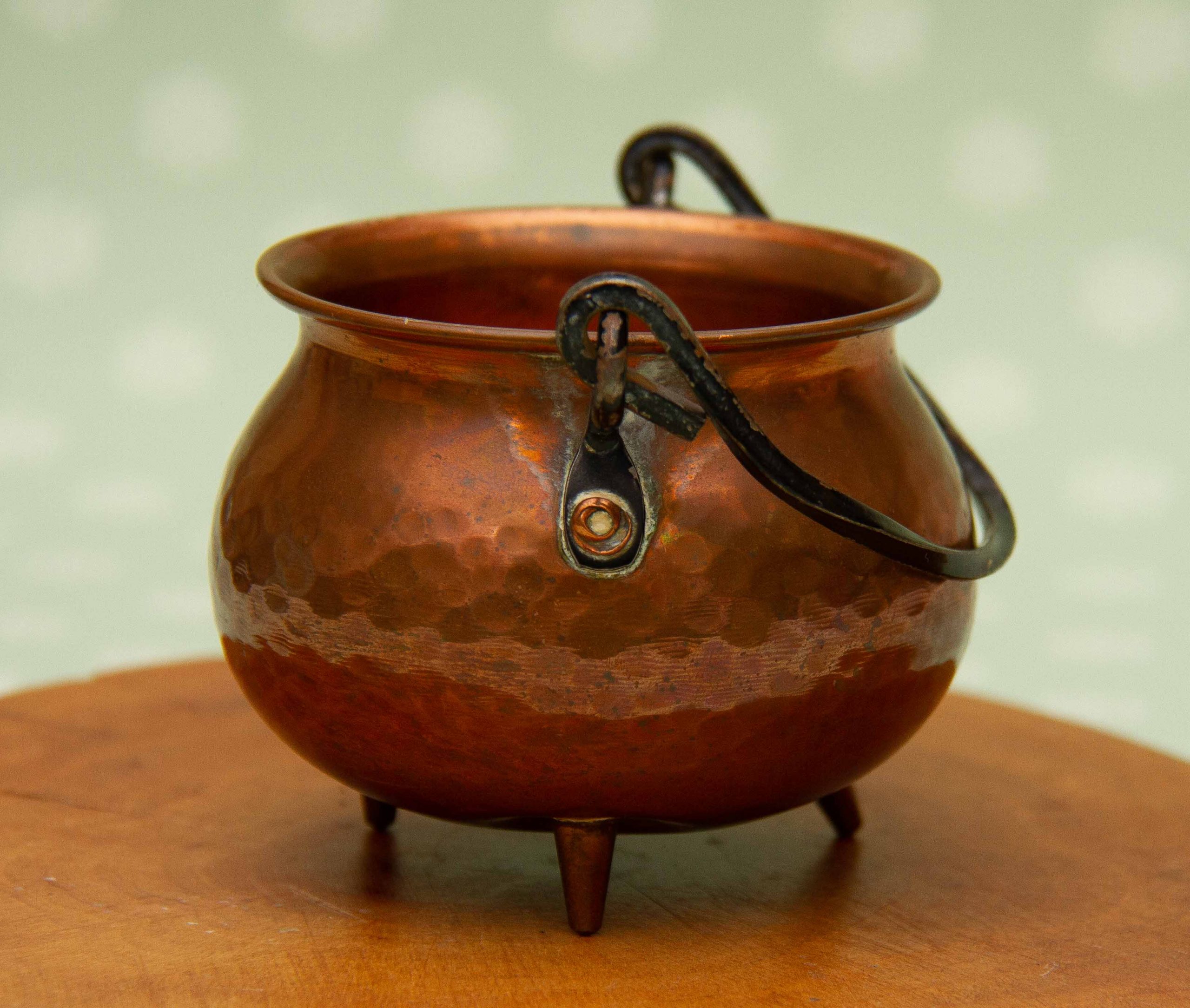A small vintage hand beaten copper cauldron with a twisted black wrought iron handle. Just the right size for holding a tea light candle.