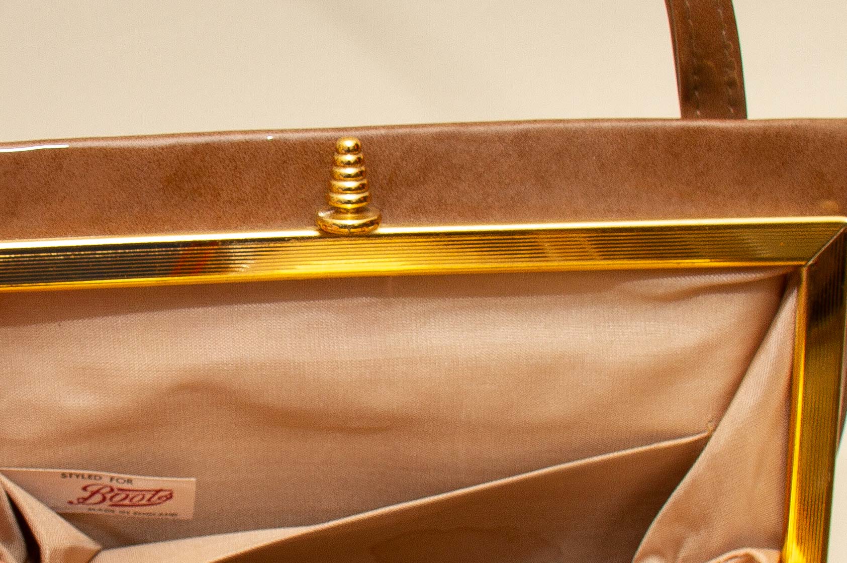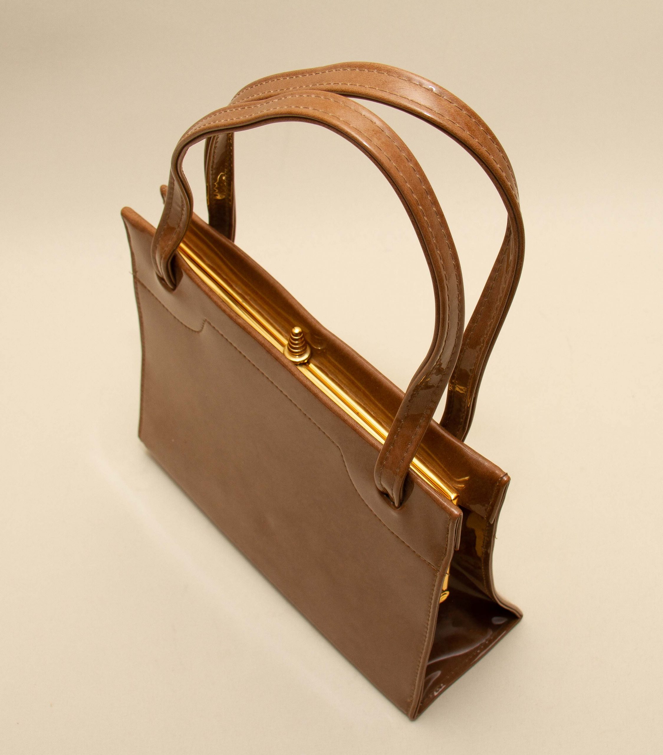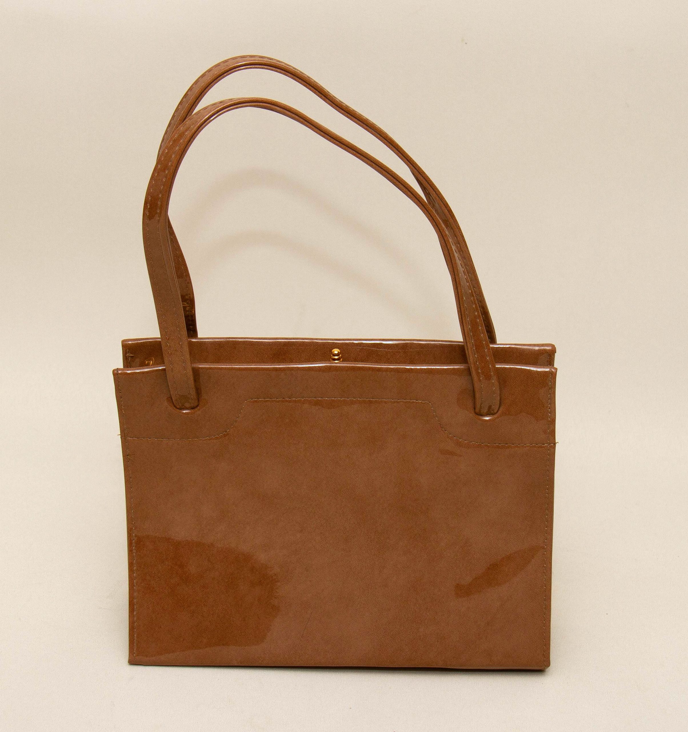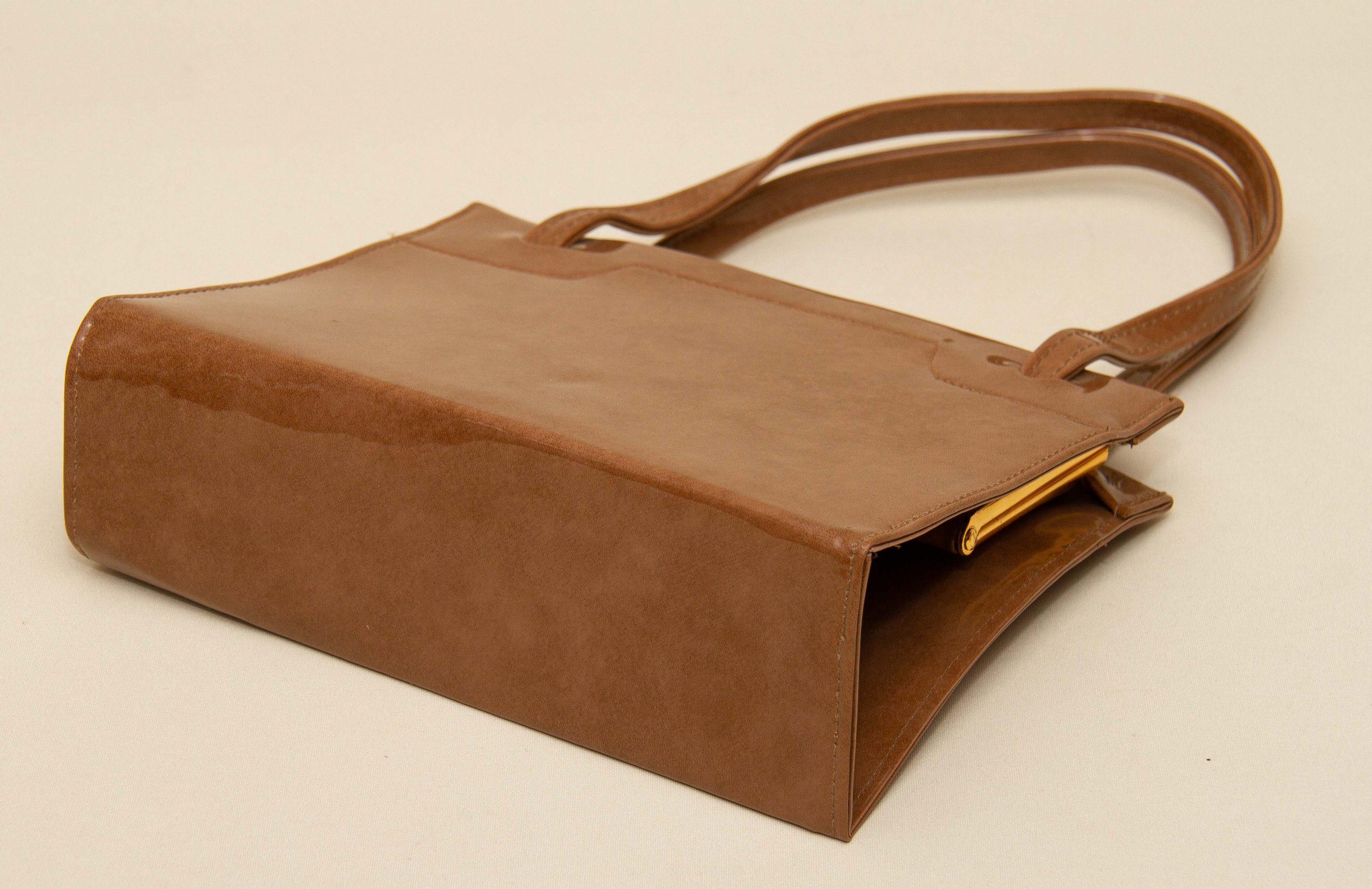 A small vintage patent Kelly handbag styled for Boots, in a light caramel brown colour.