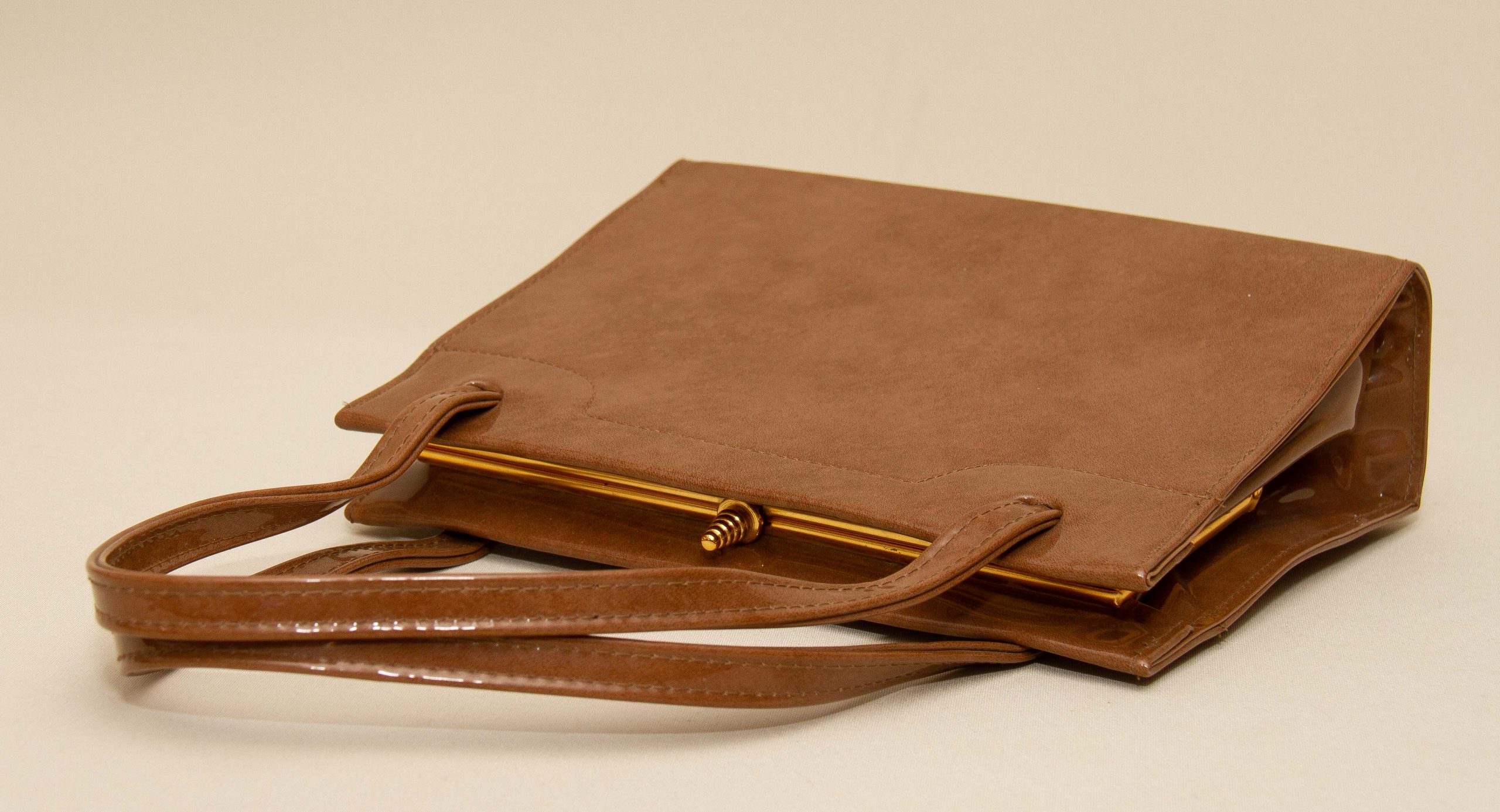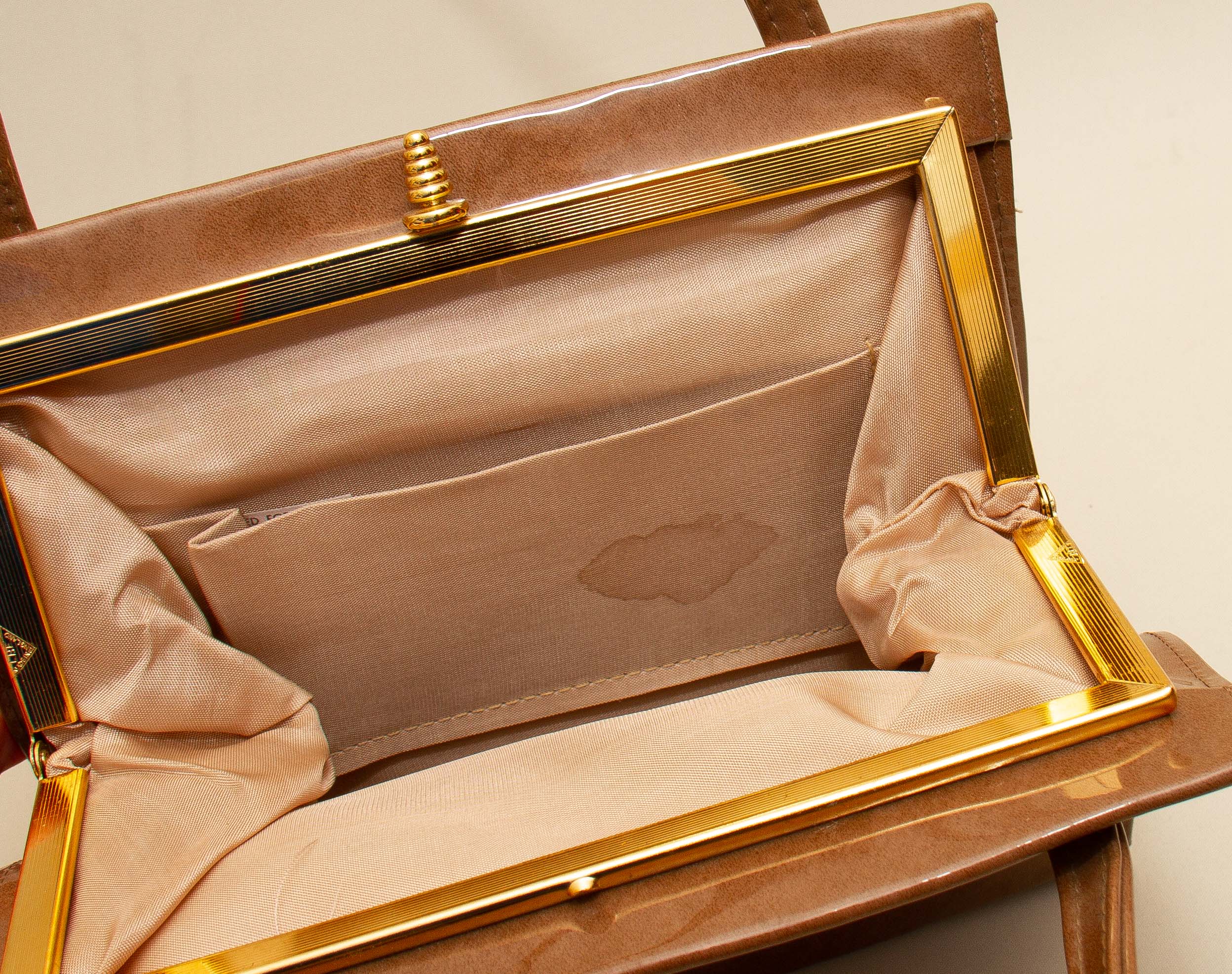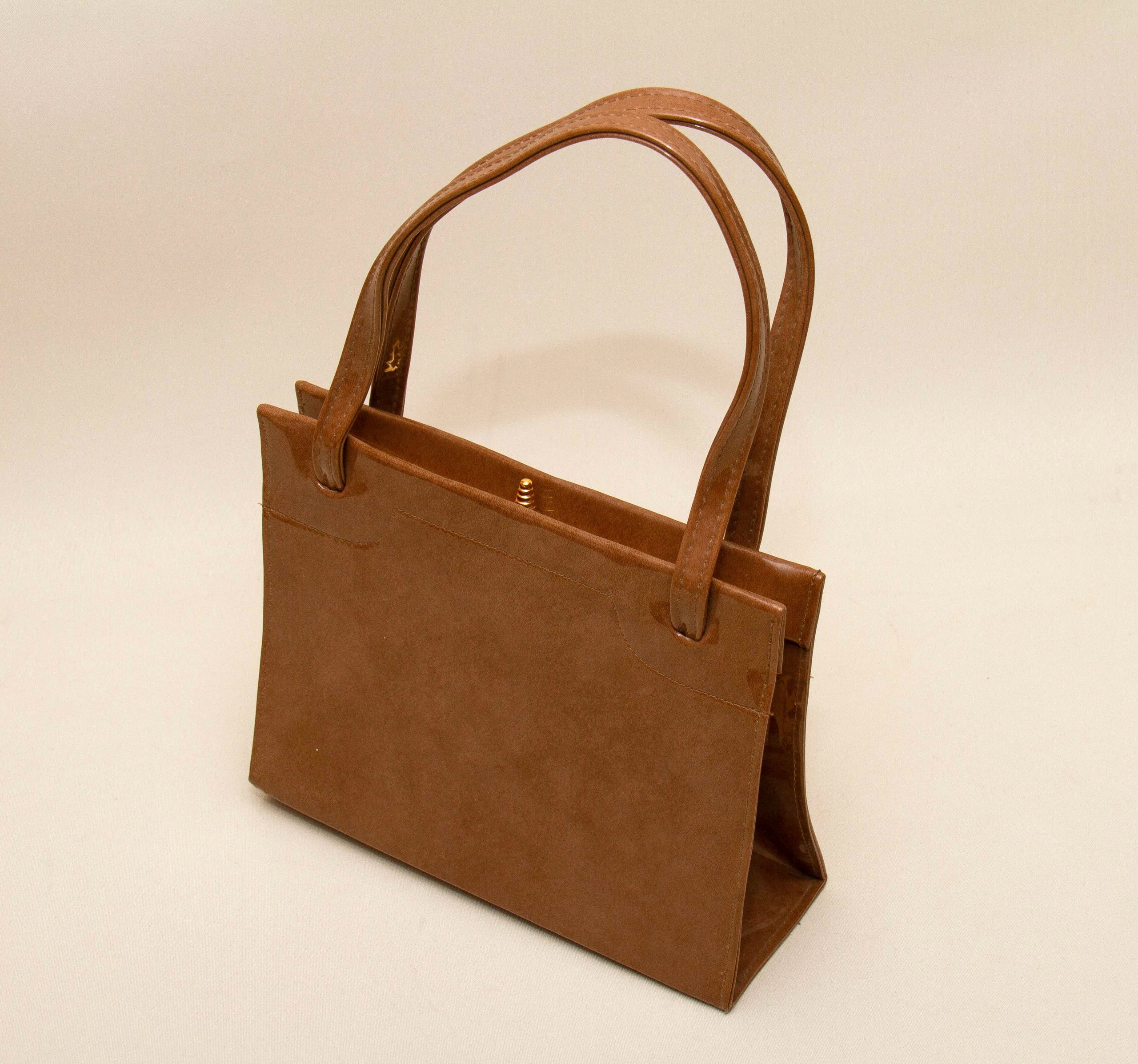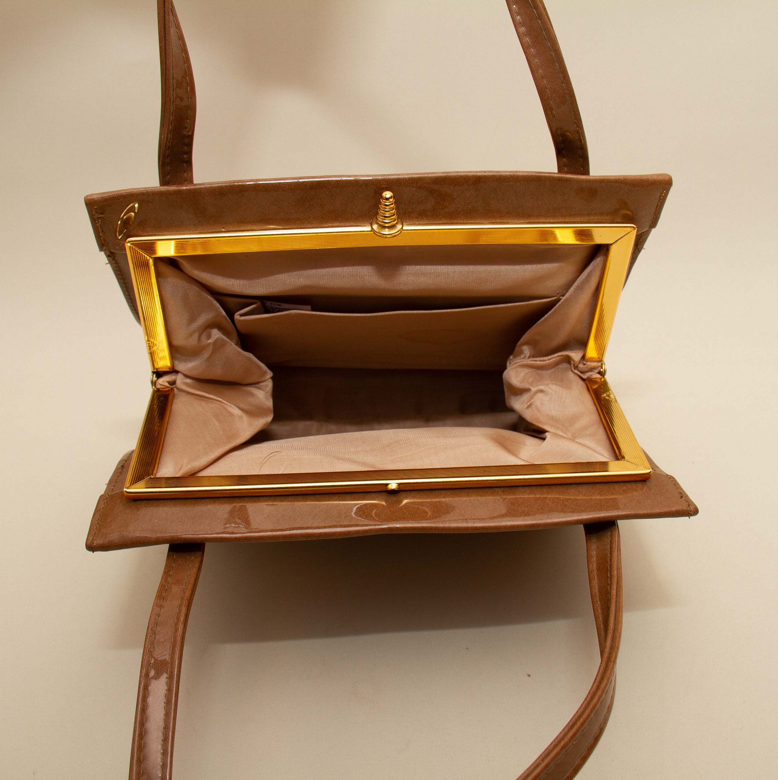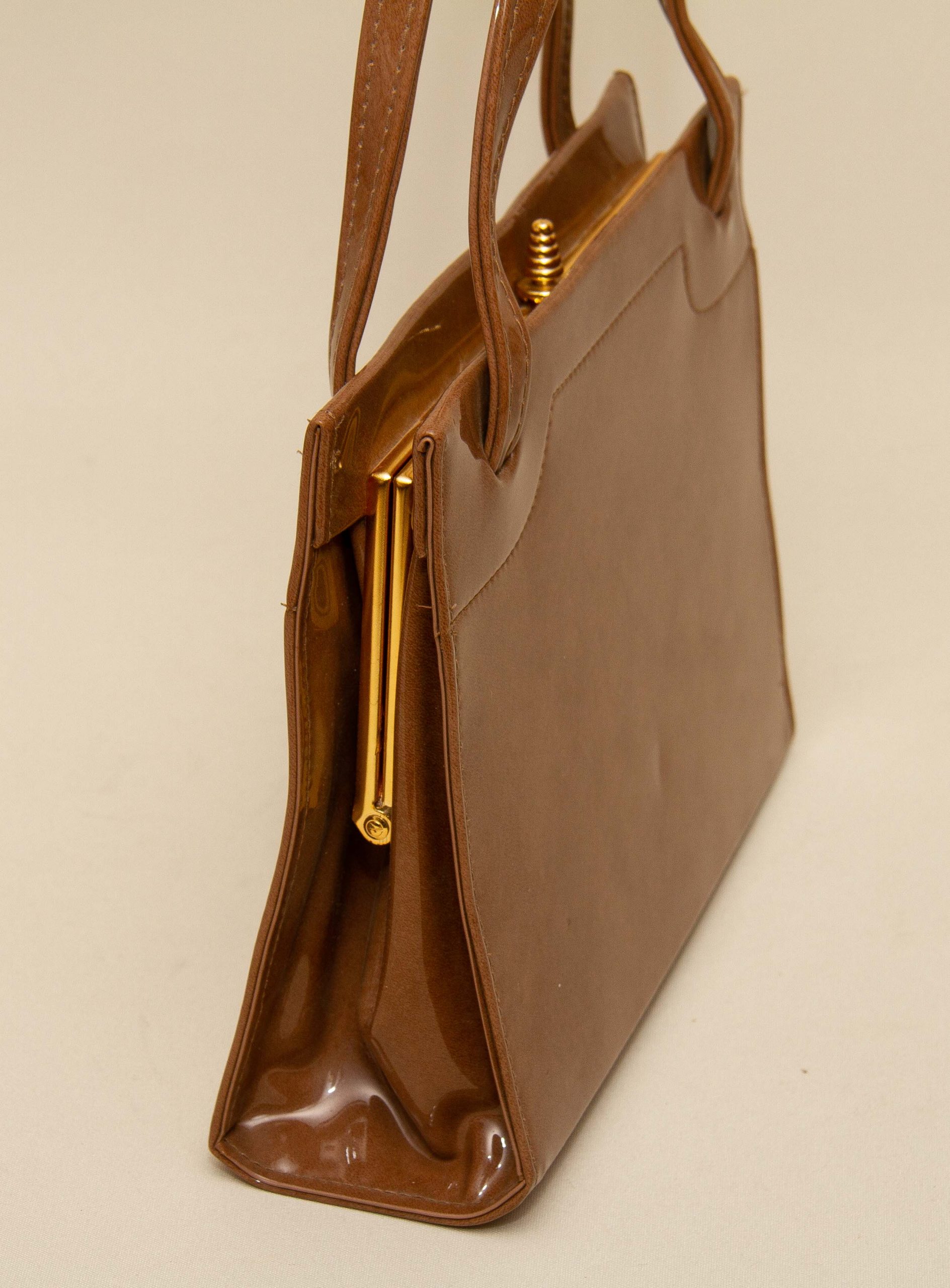 A small vintage patent Kelly handbag styled for Boots, in a light caramel brown colour.