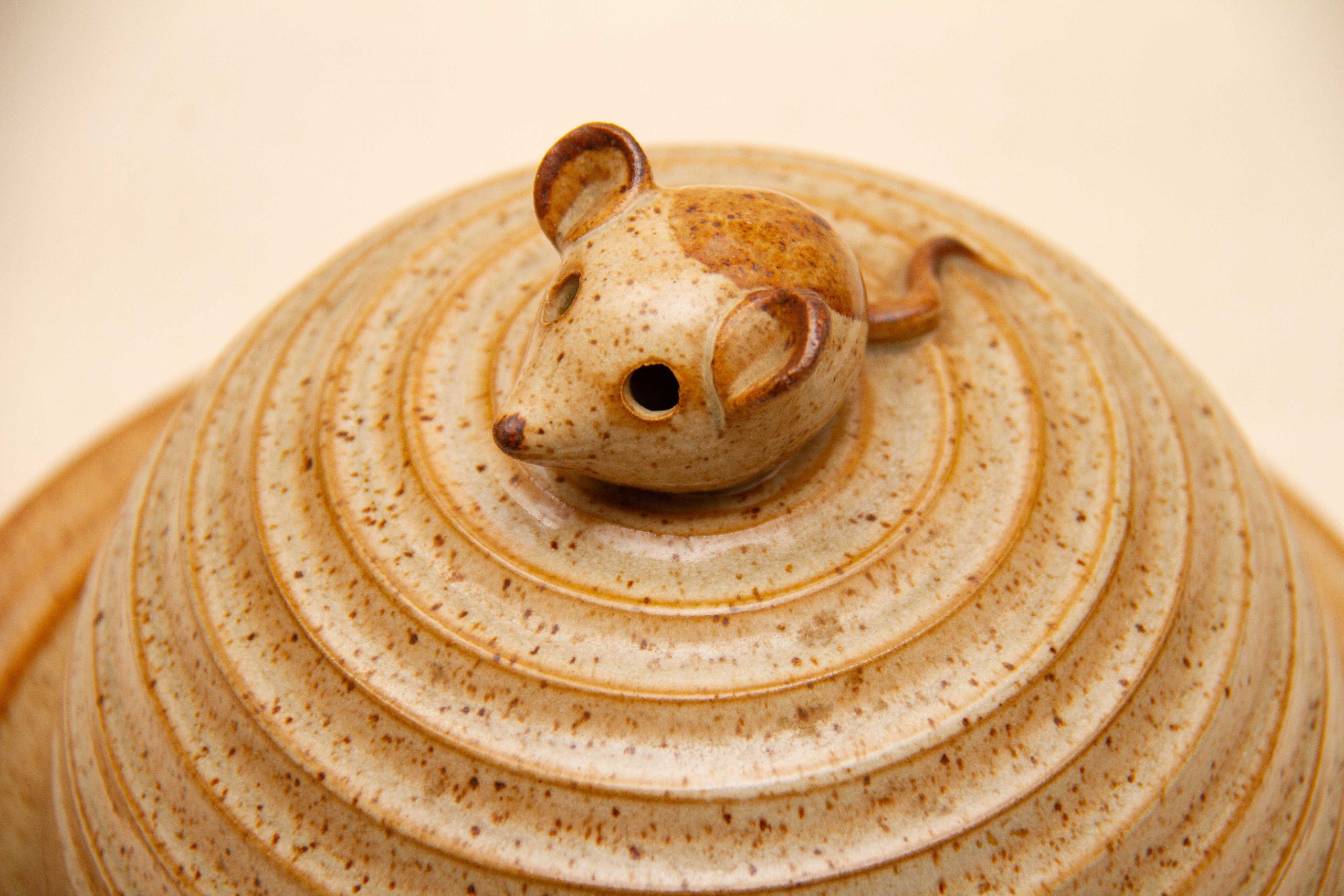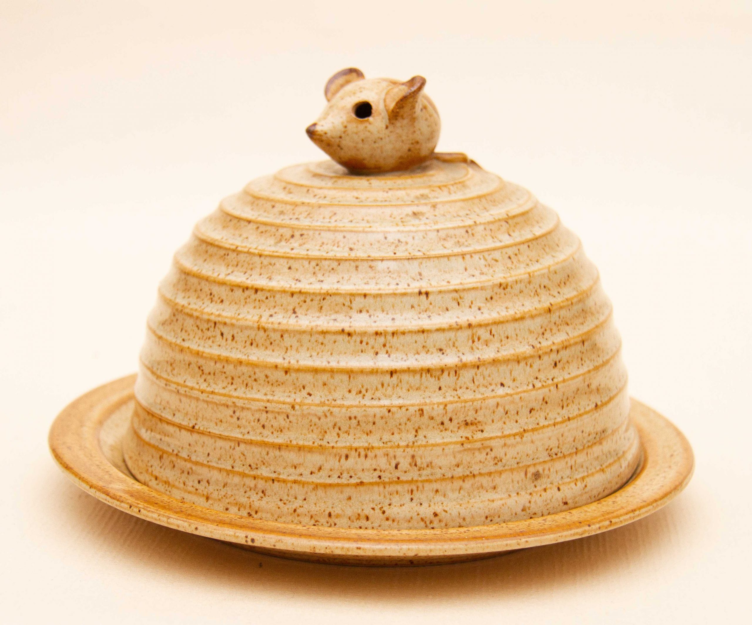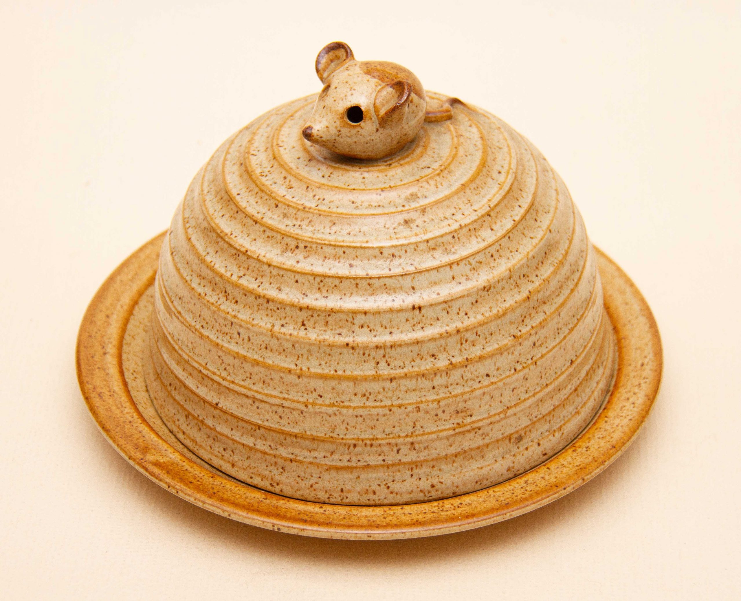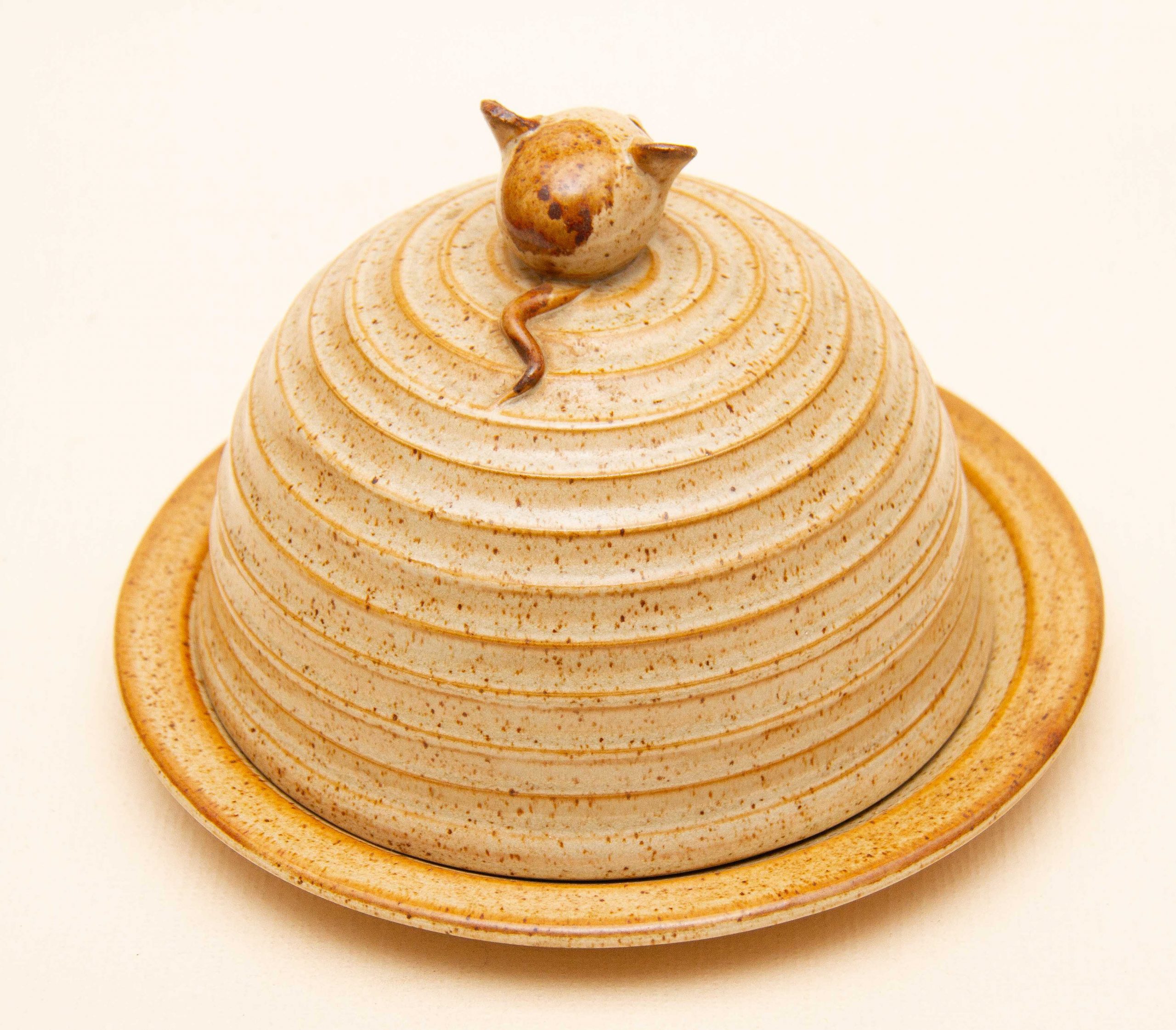 A speckled brown glaze stoneware cheese dome with a mouse sat on top of the dome.