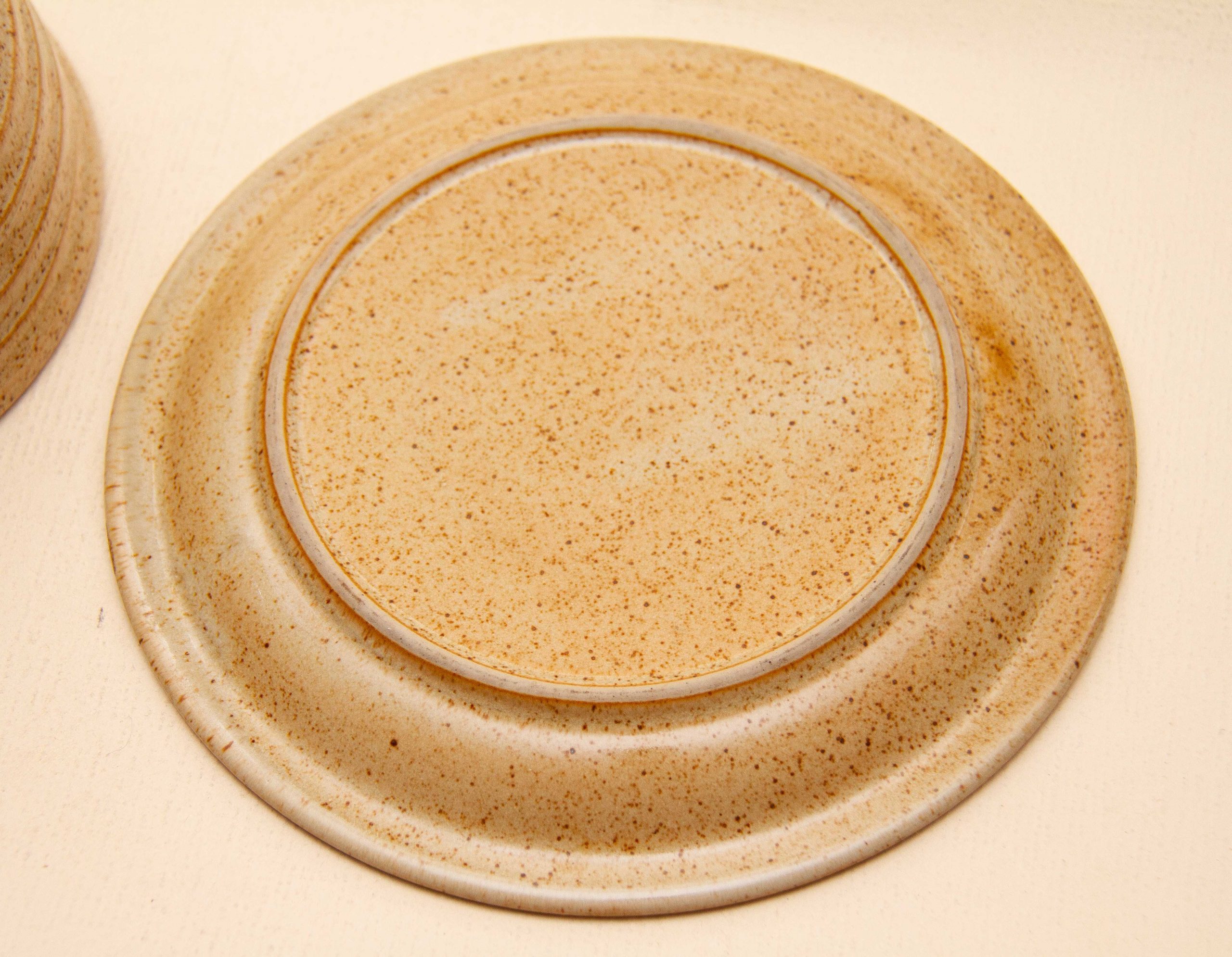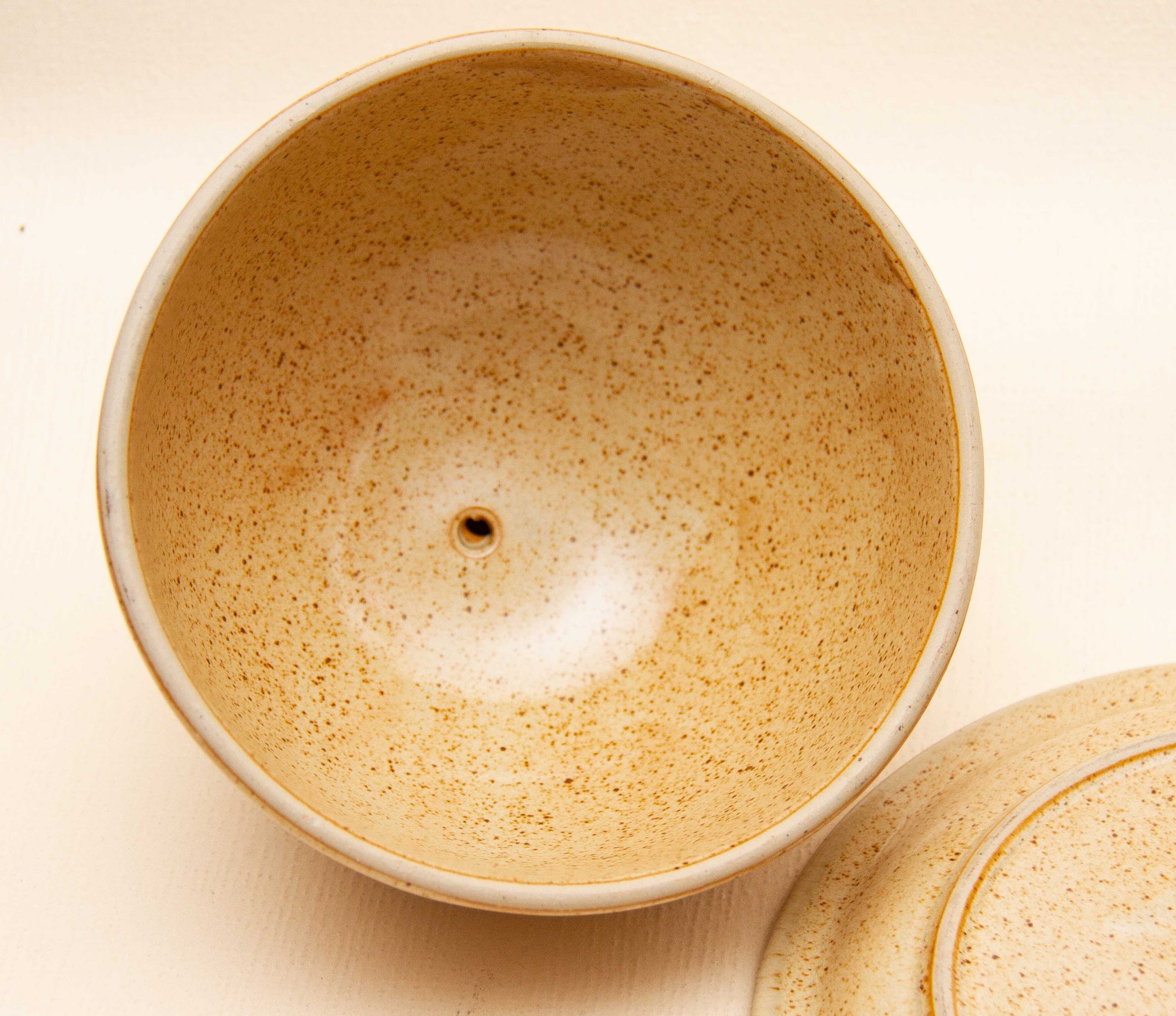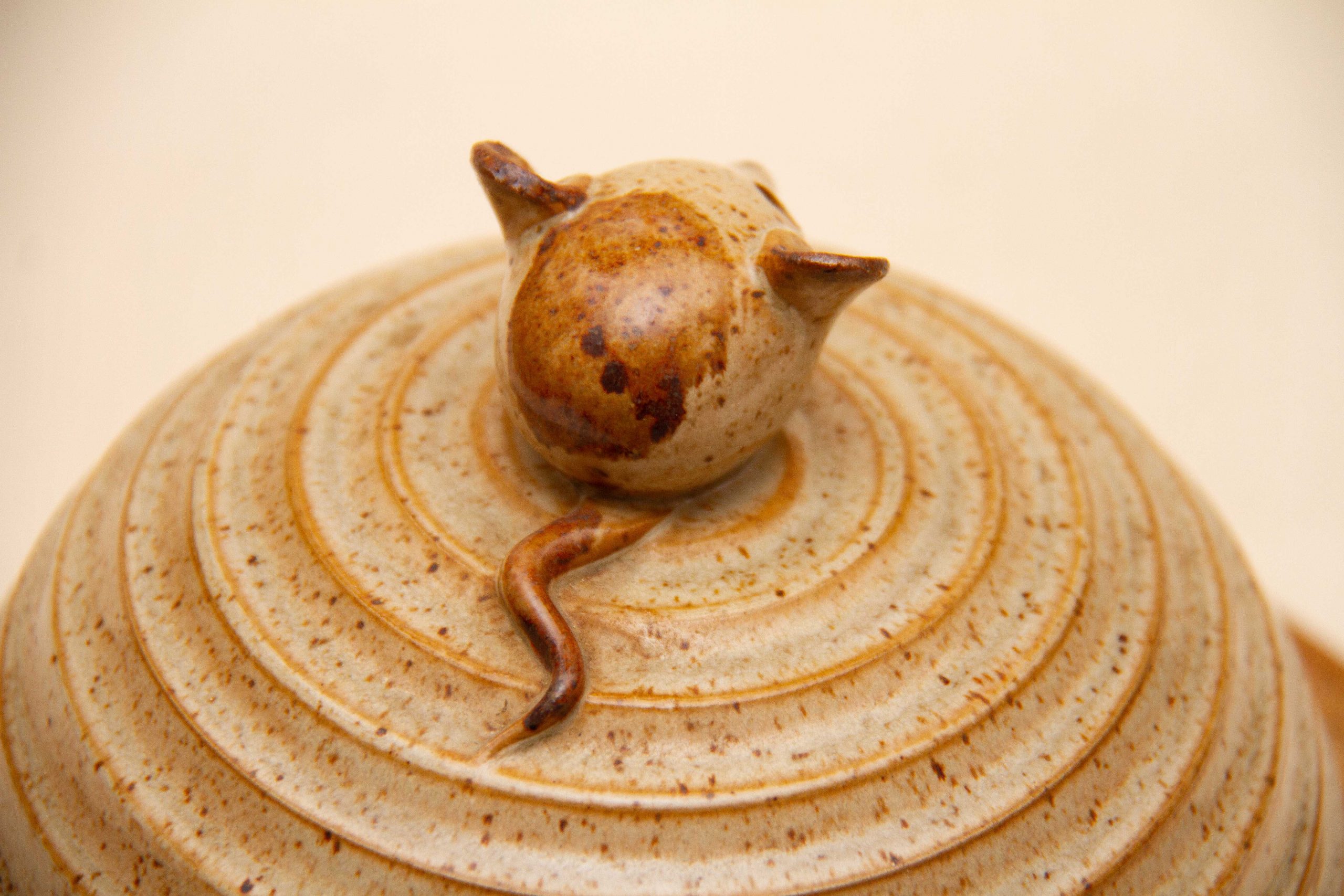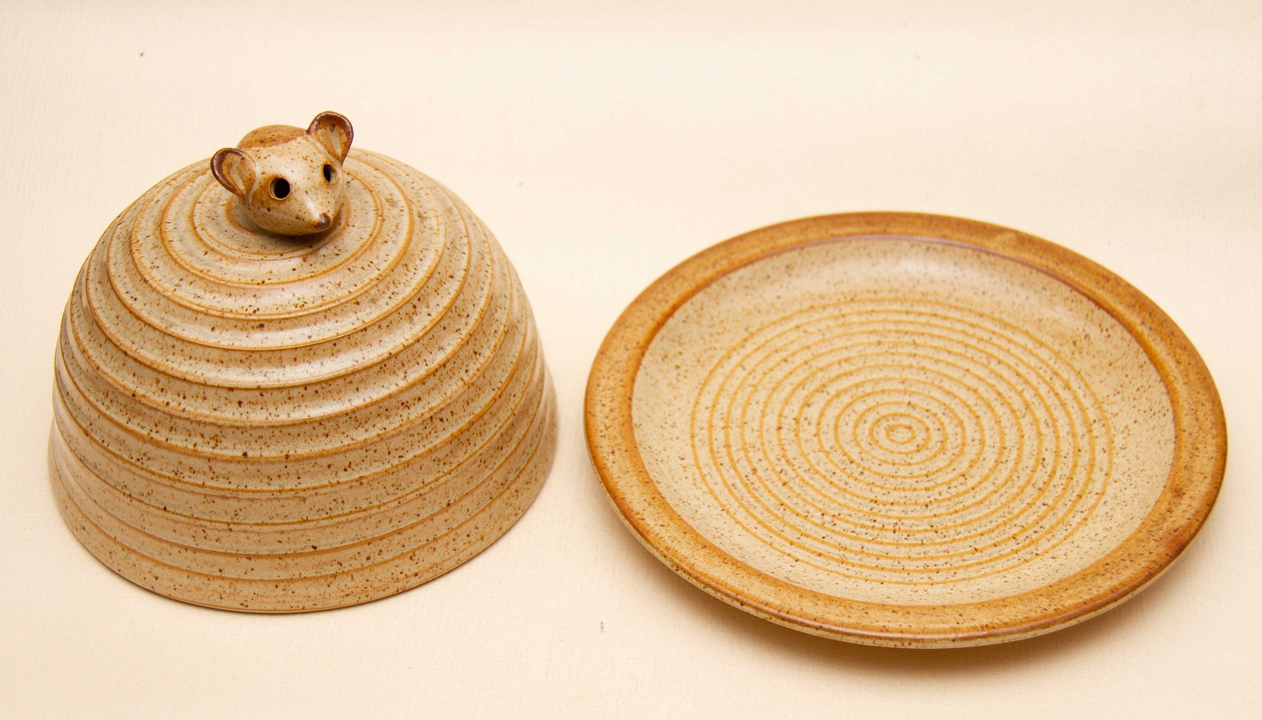 A speckled brown glaze stoneware cheese dome with a mouse sat on top of the dome.