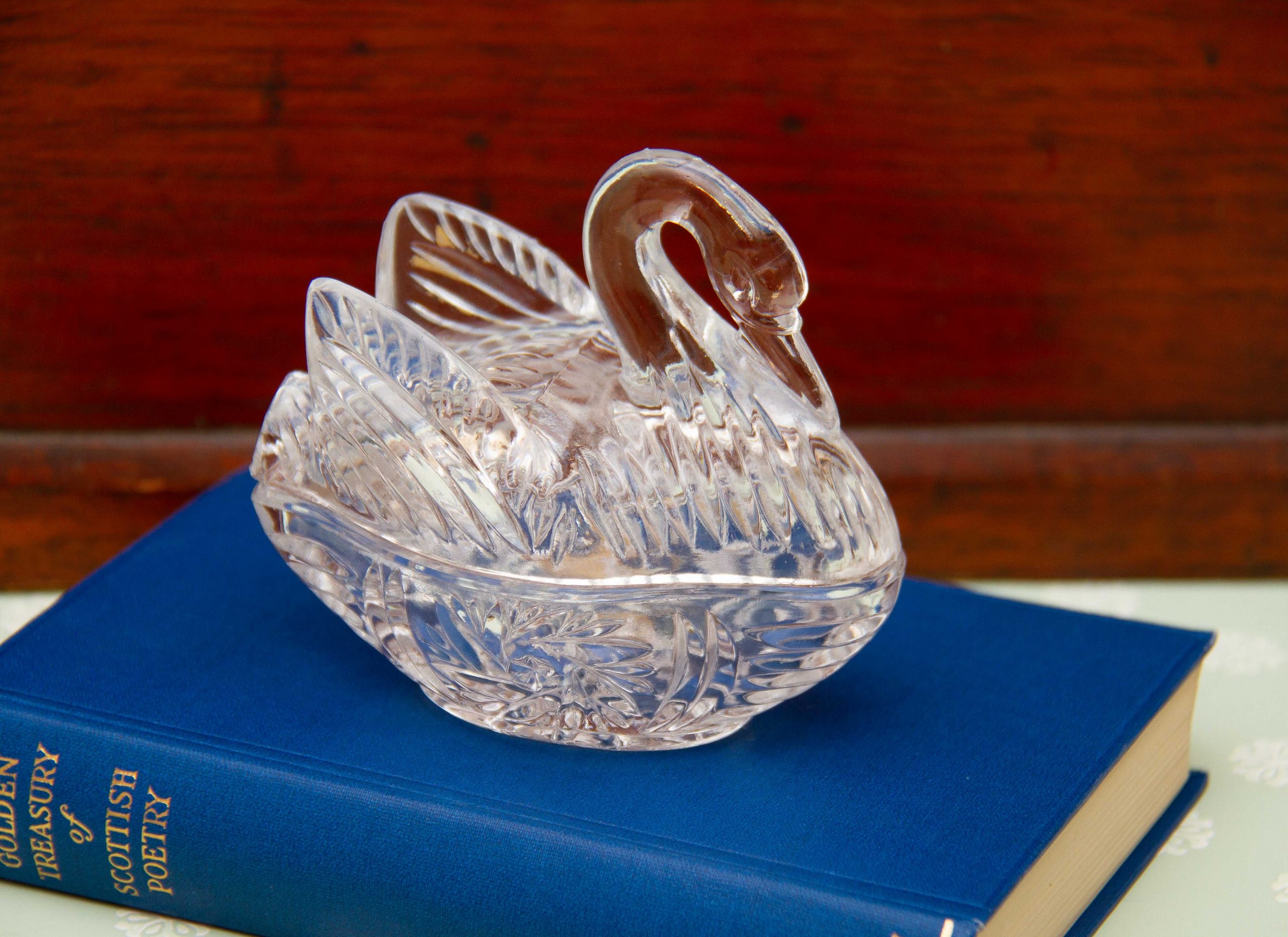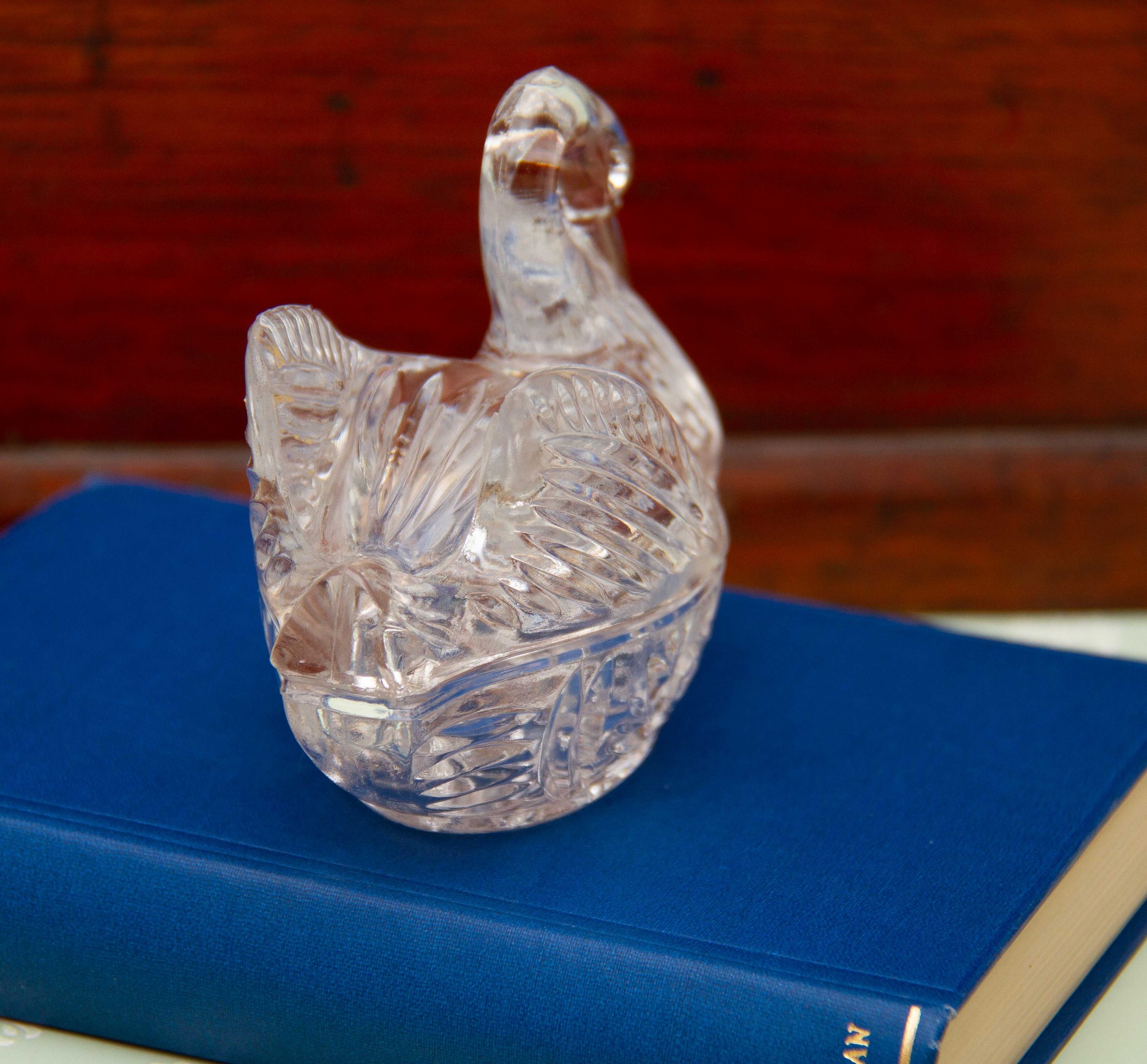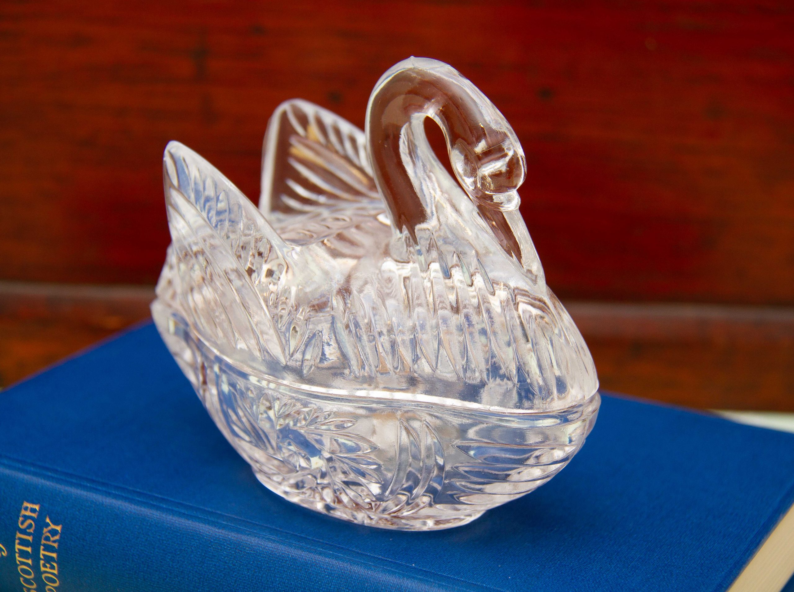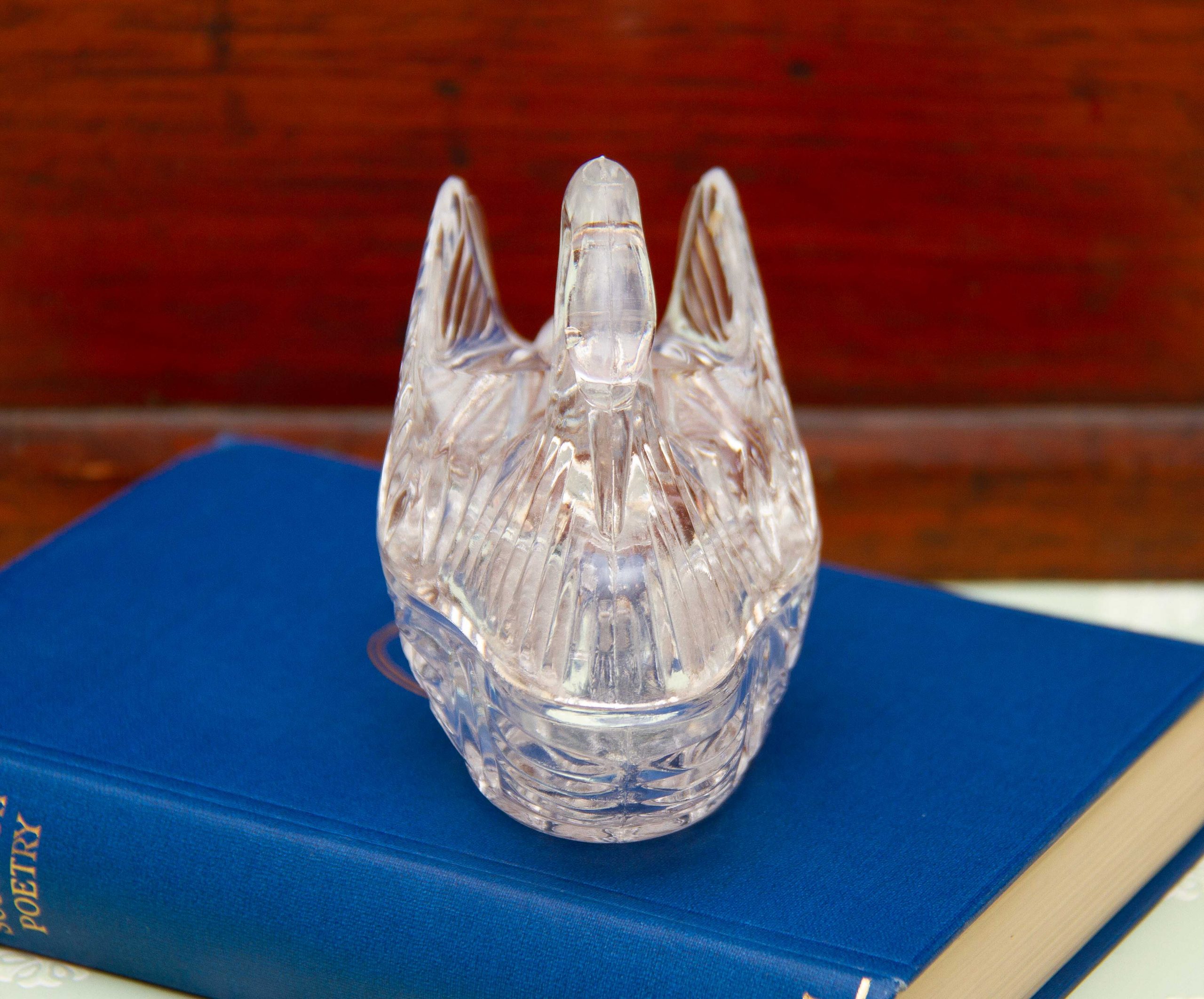 A swan shaped clear glass vintage salt cellar, with a lid, could be used as a dip or trinket dish.