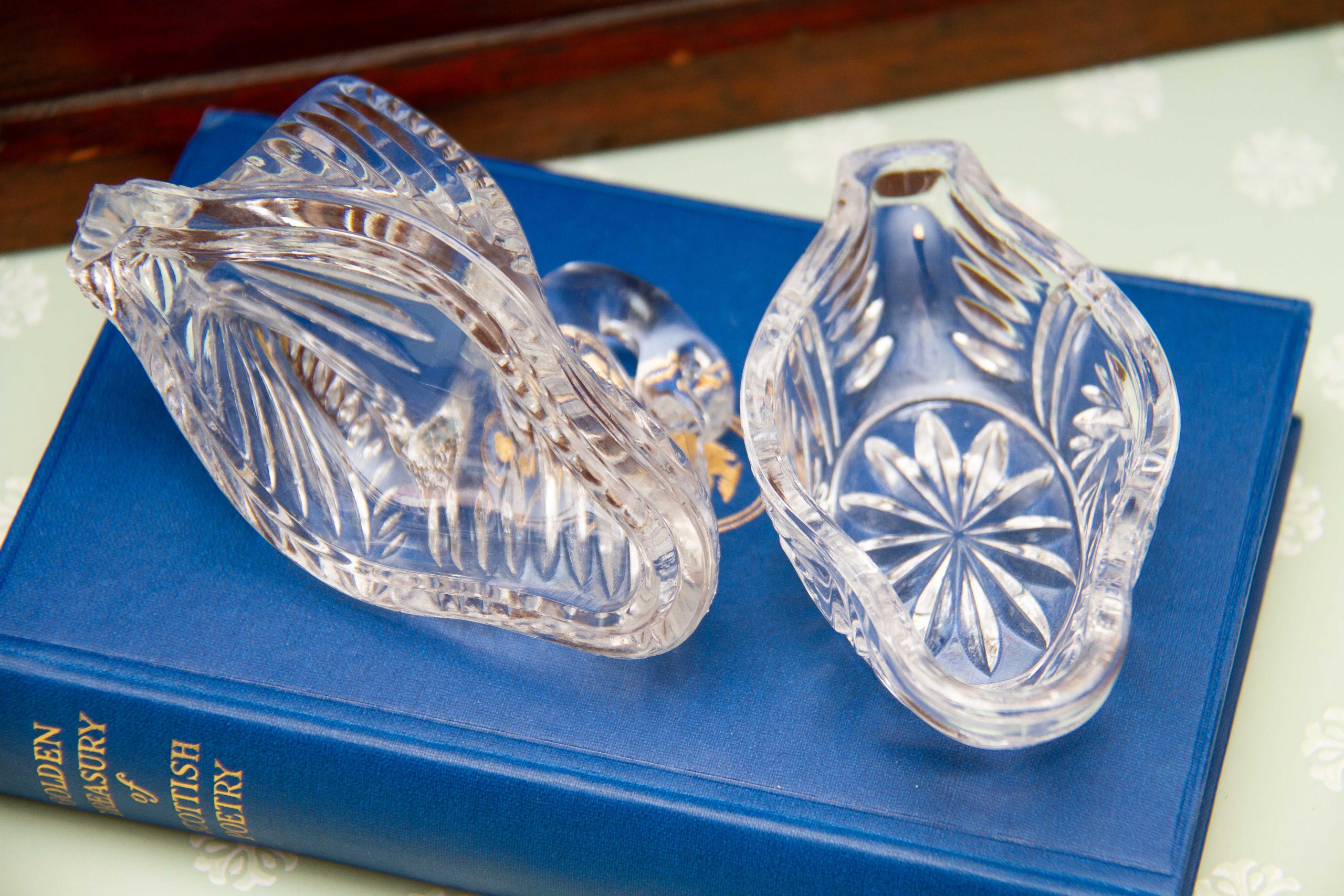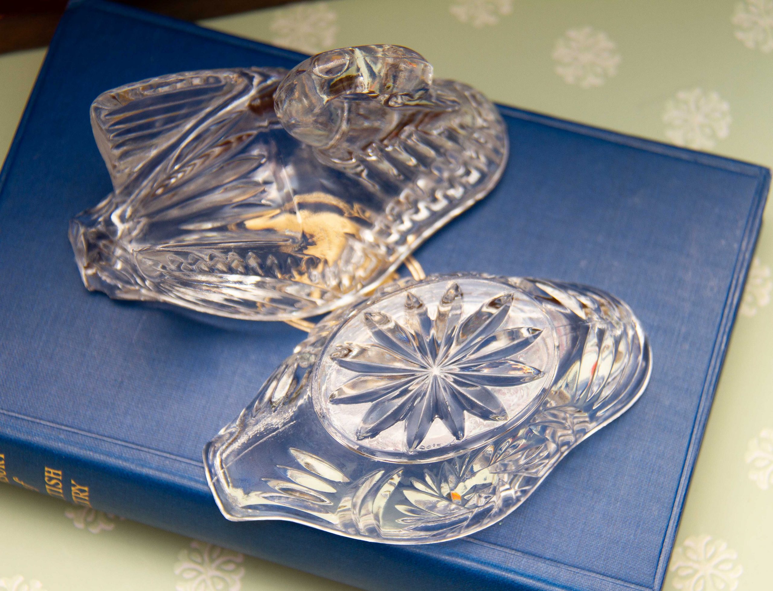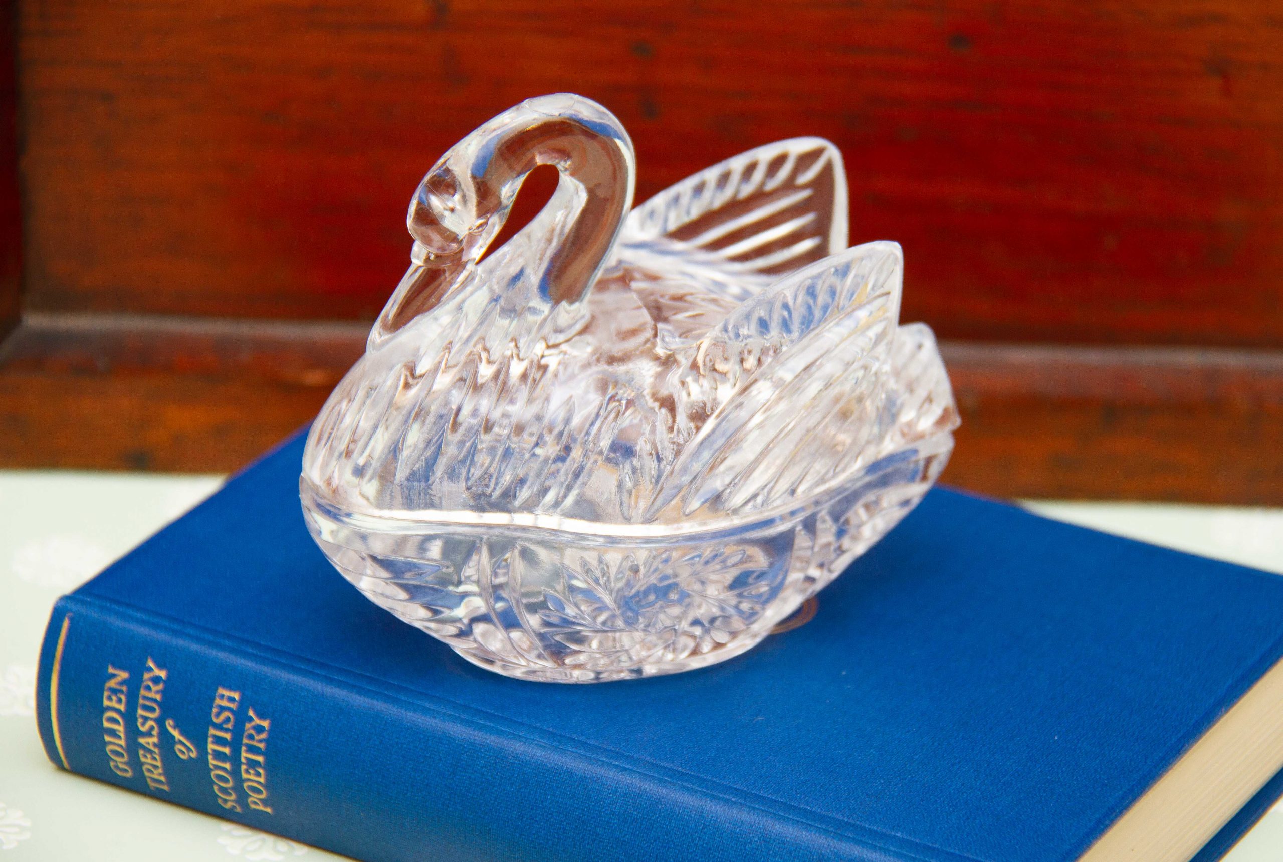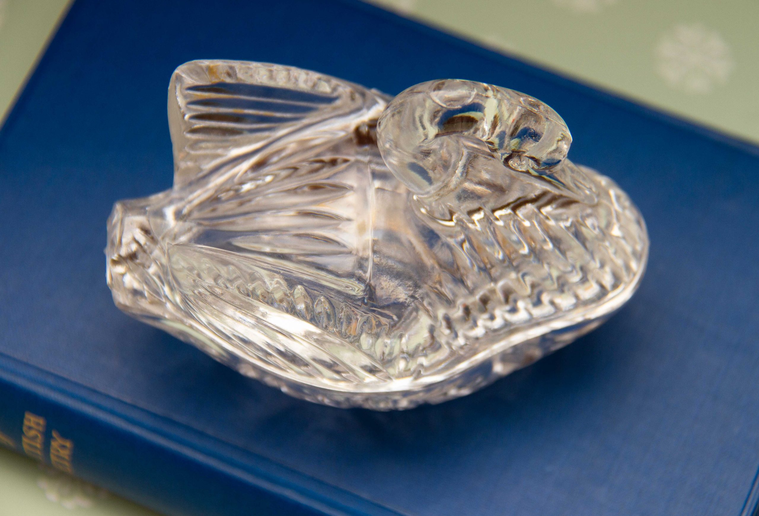 A swan shaped clear glass vintage salt cellar, with a lid, could be used as a dip or trinket dish.