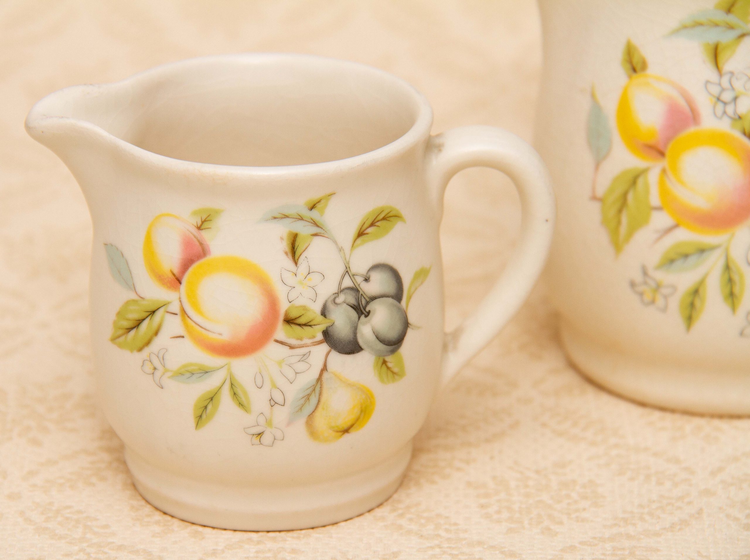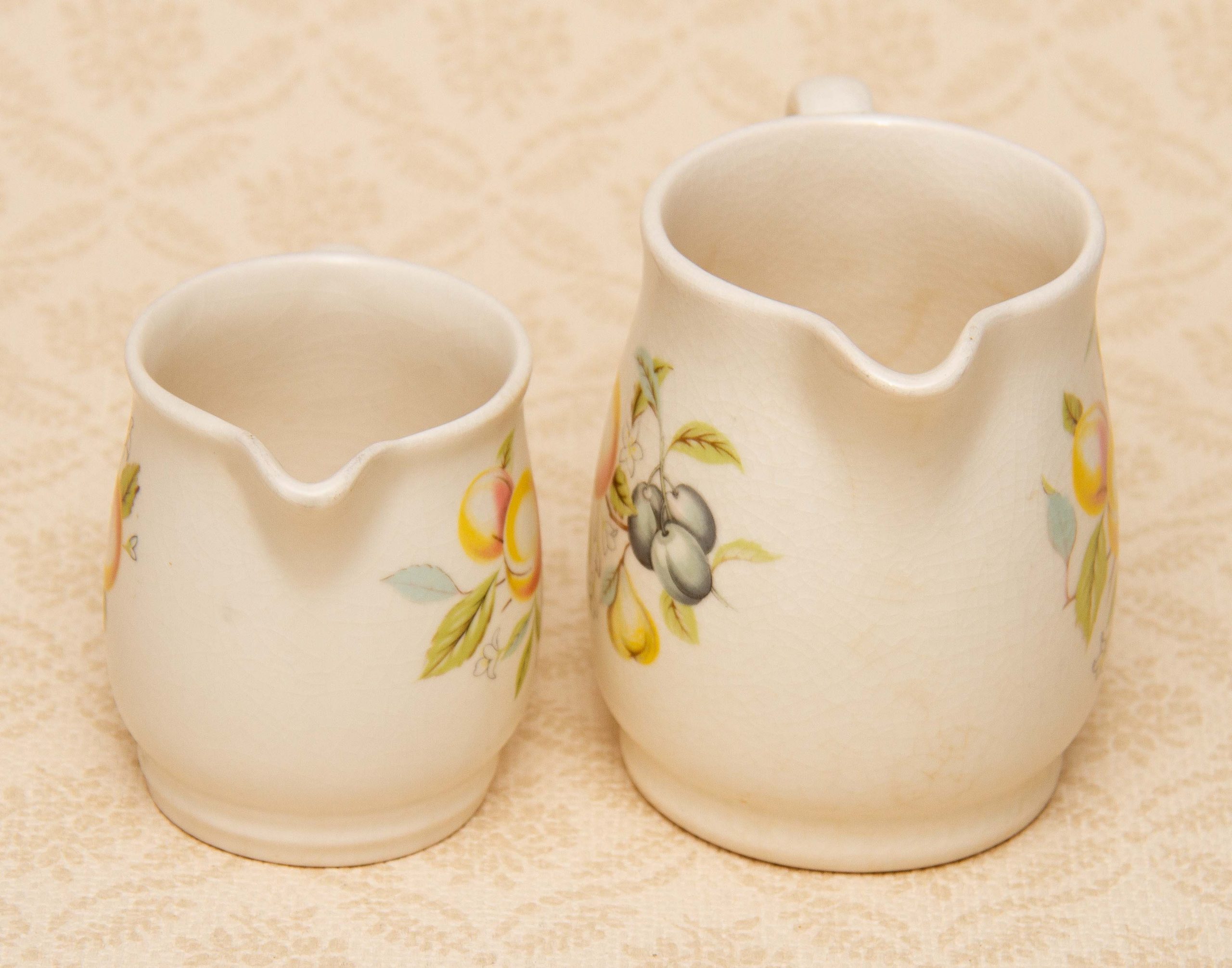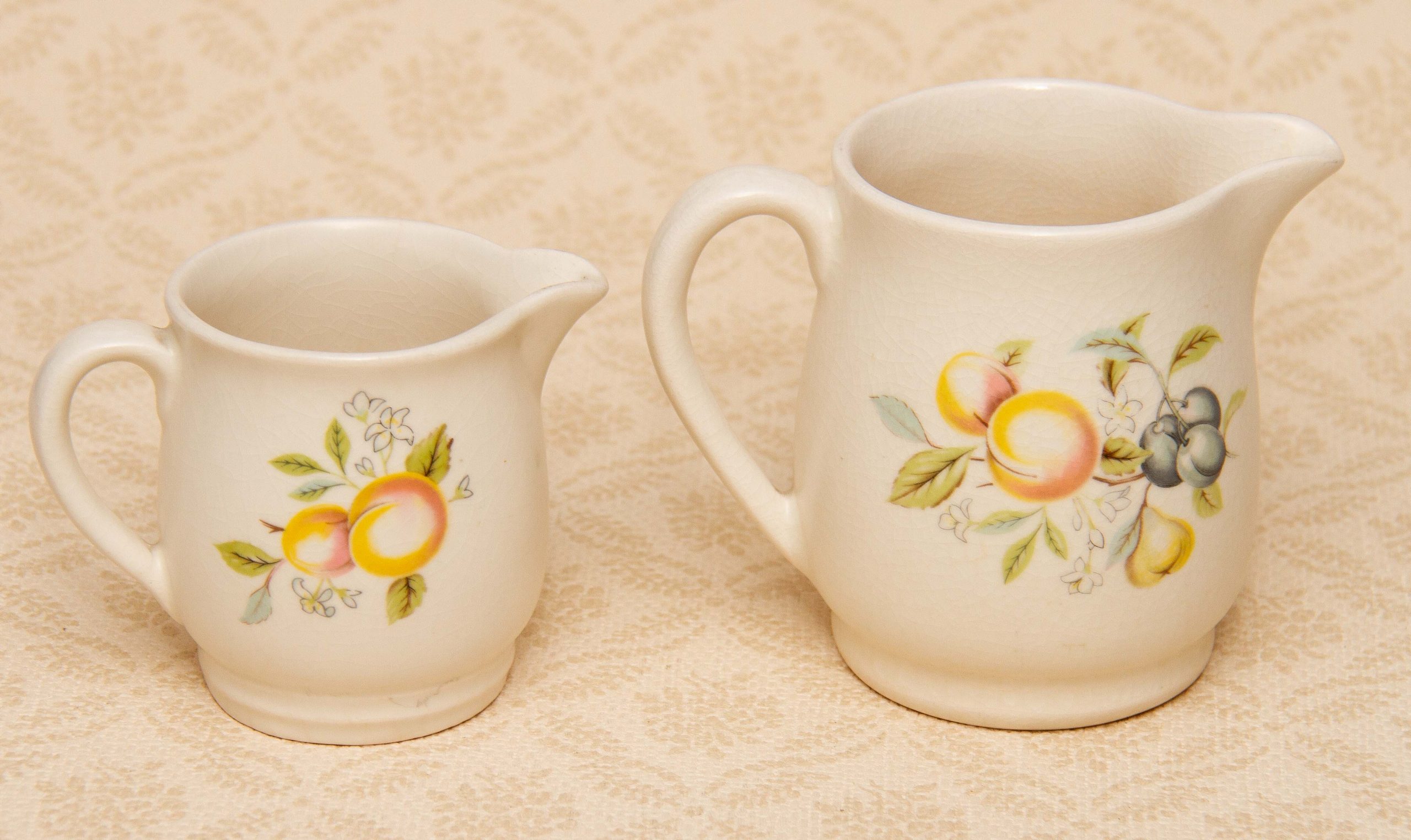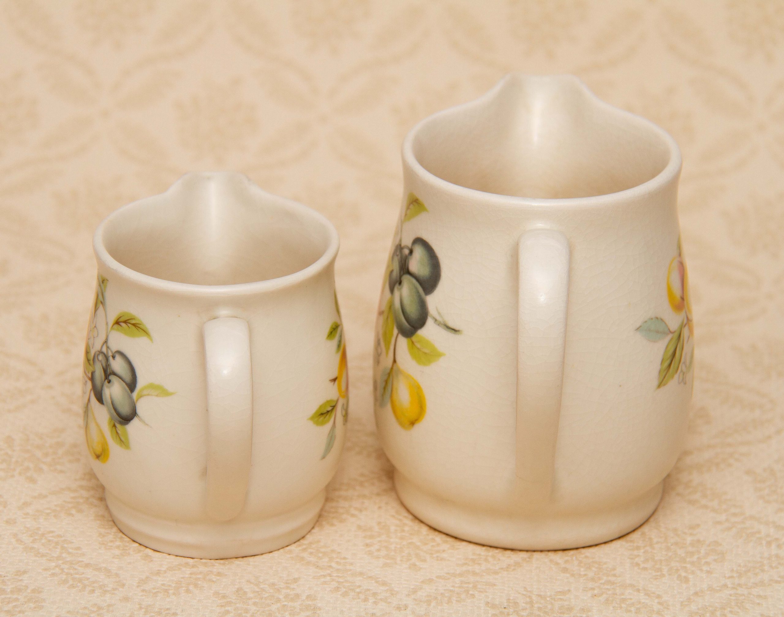 A pair of Sylvac Ware jugs with a fruit pattern on.