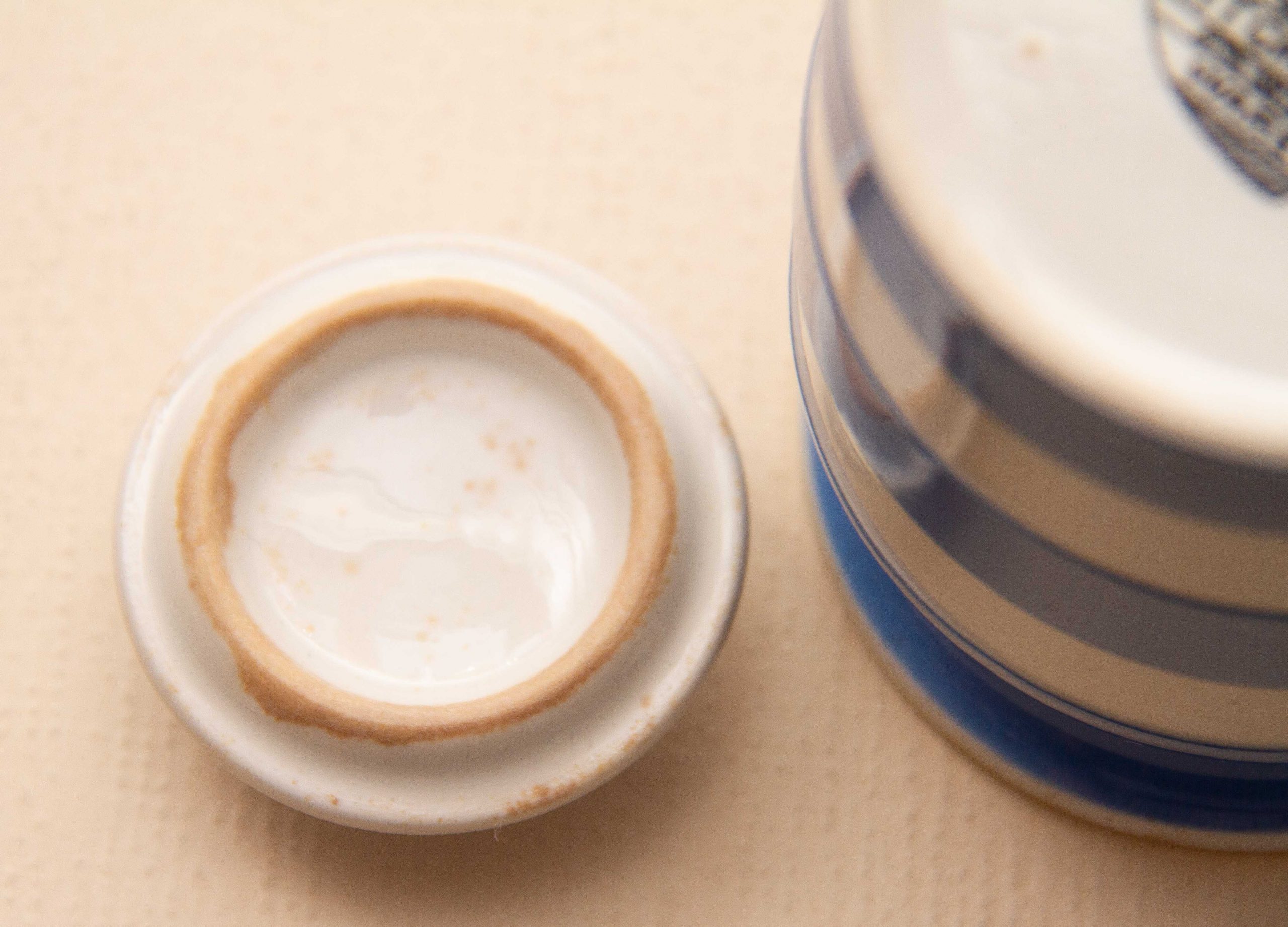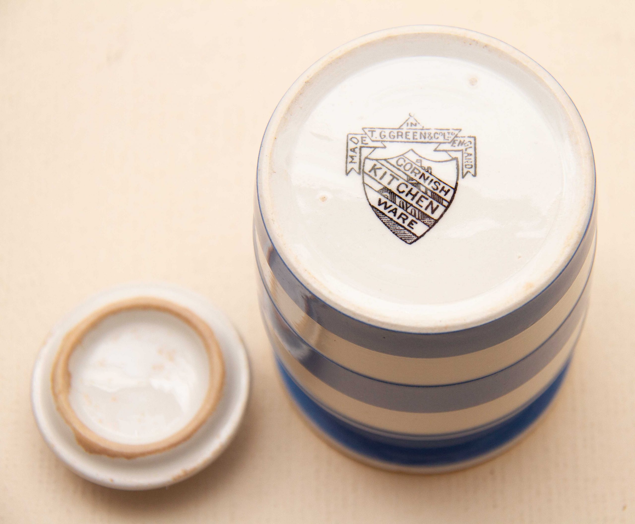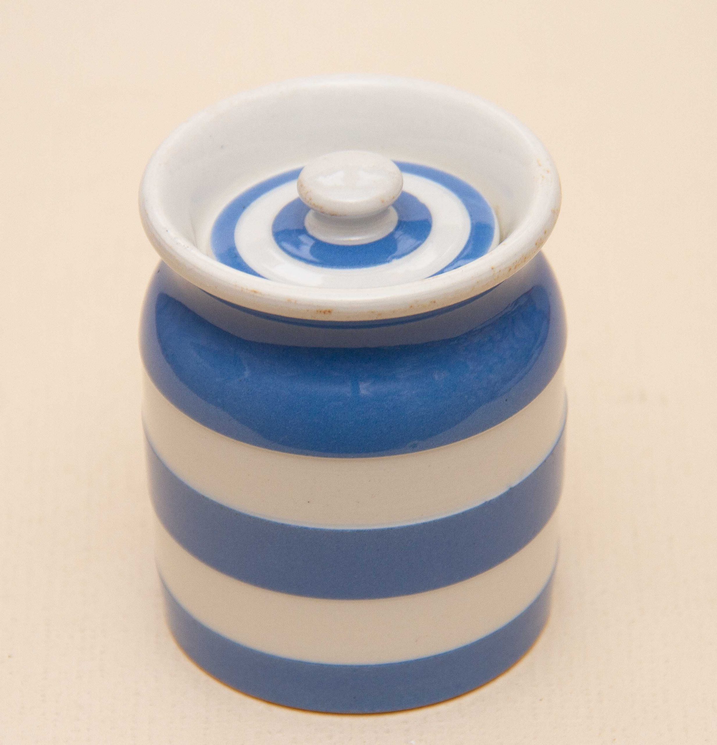 A T. G. Green Cornish Ware blue and white Baking Powder jar with lid. With the black shield back stamp on the base. Dating from the 1930’s