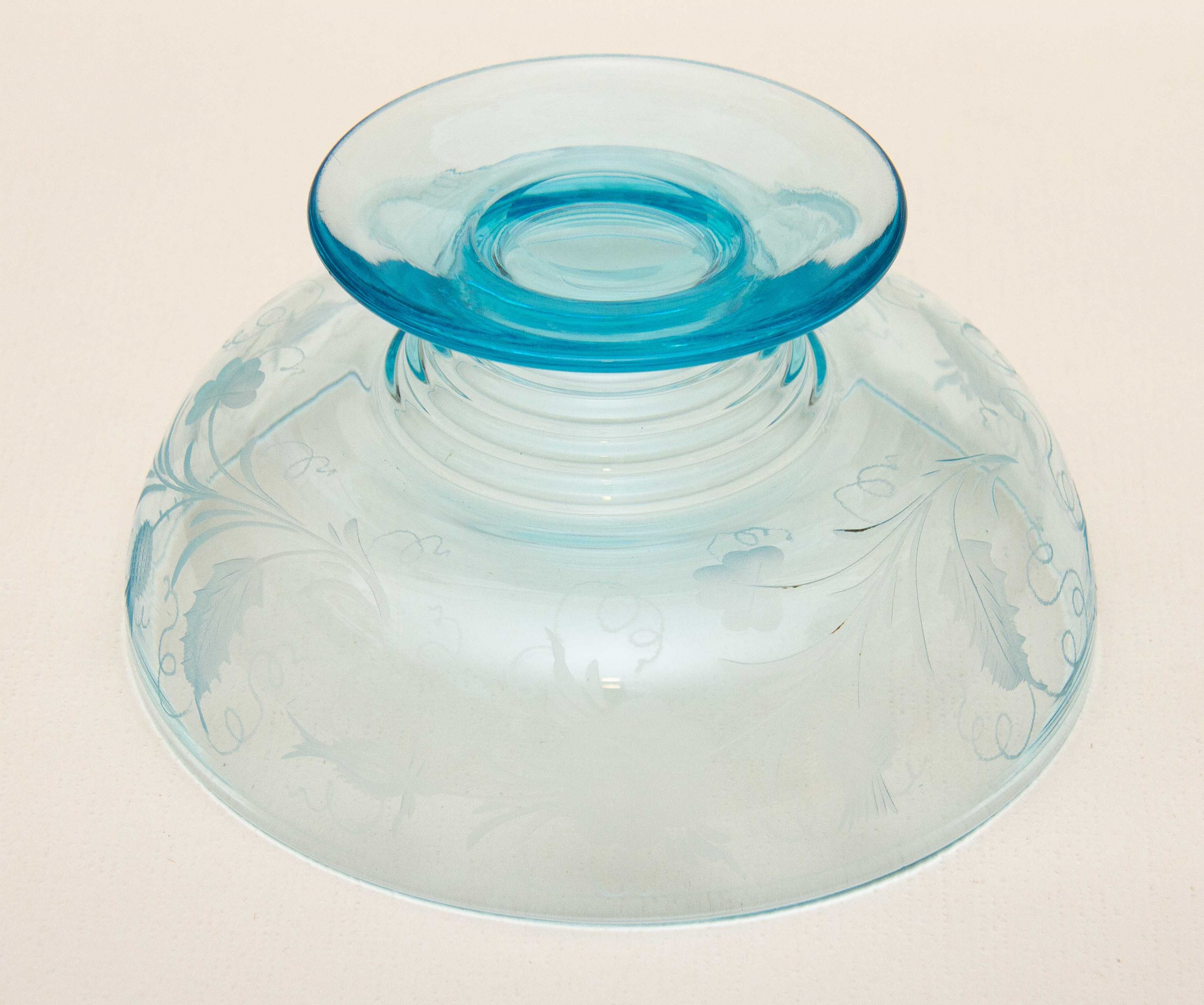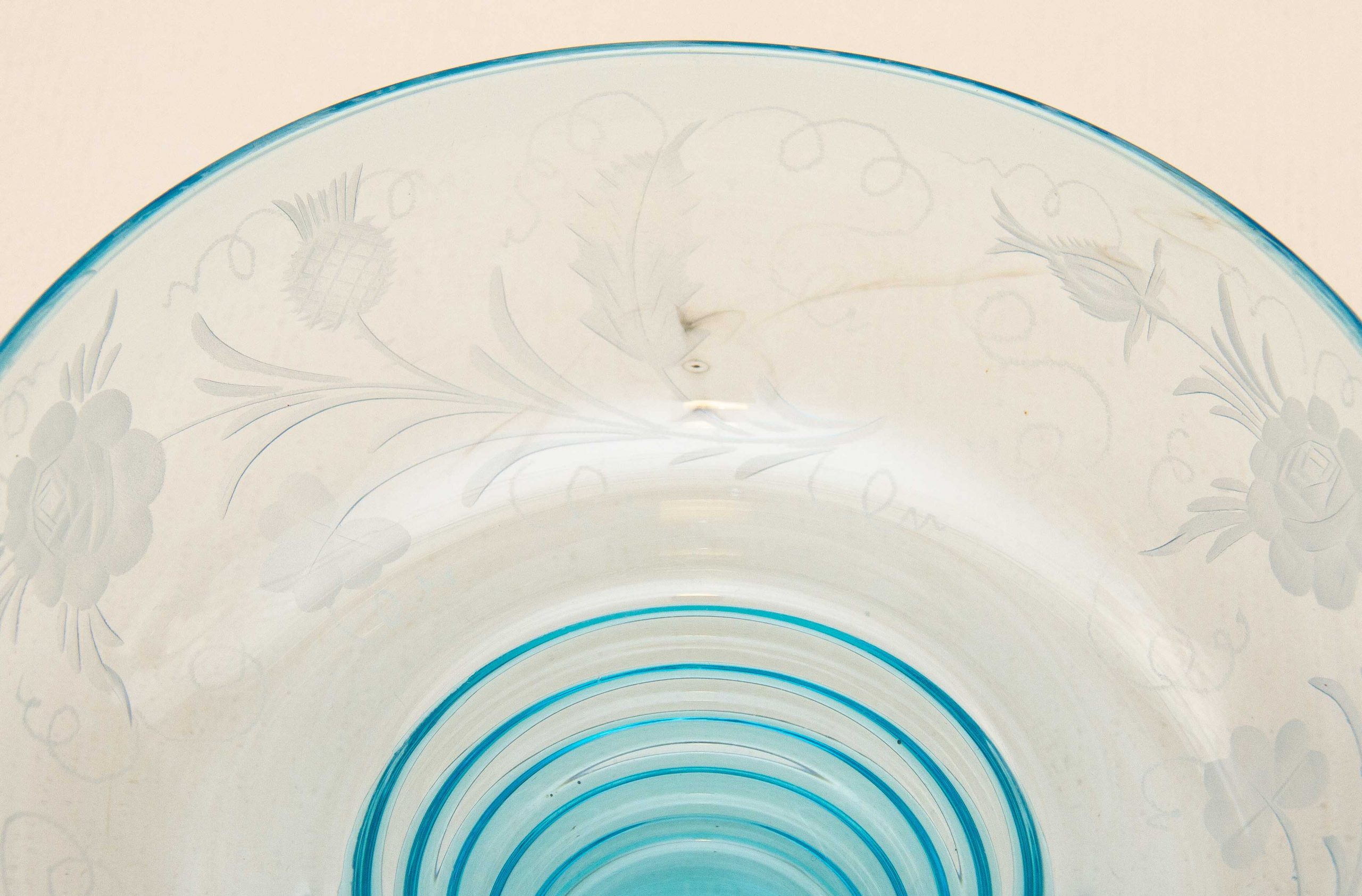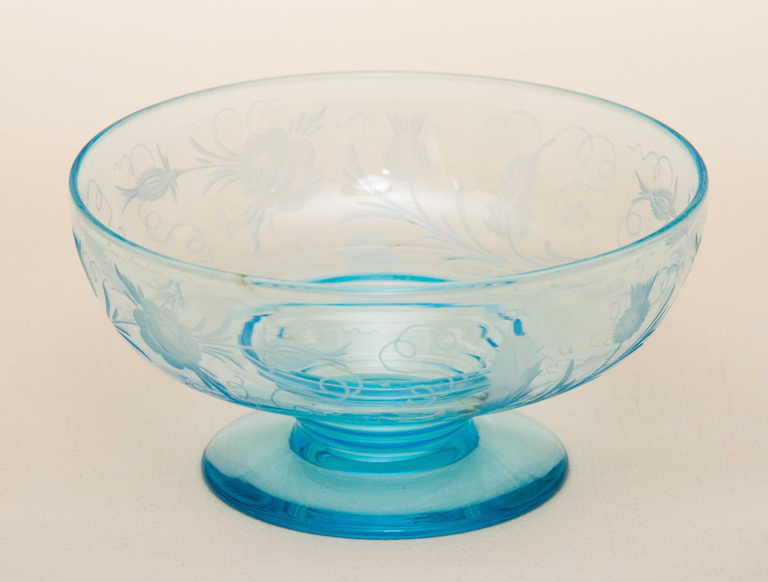 A vintage turquoise blue glass footed bowl with an etched pattern featuring thistles and roses.