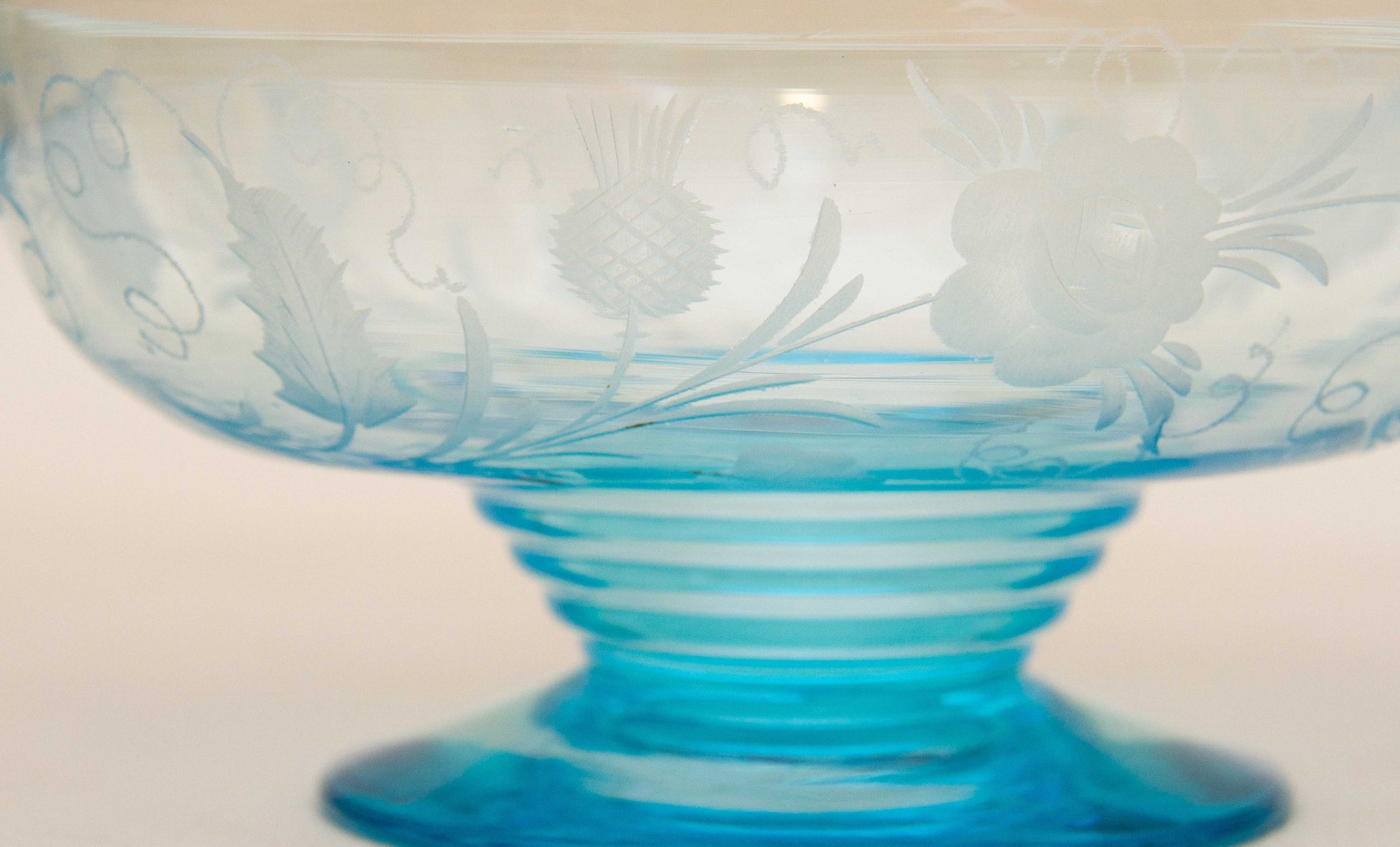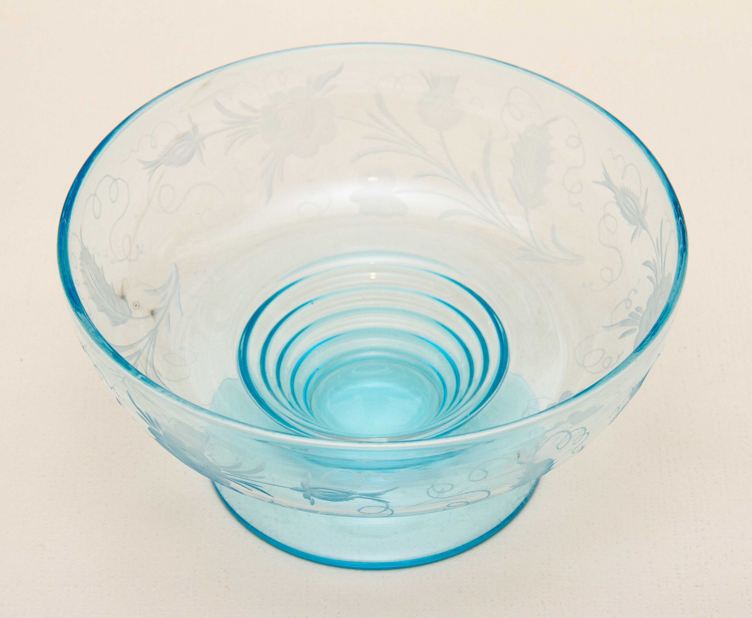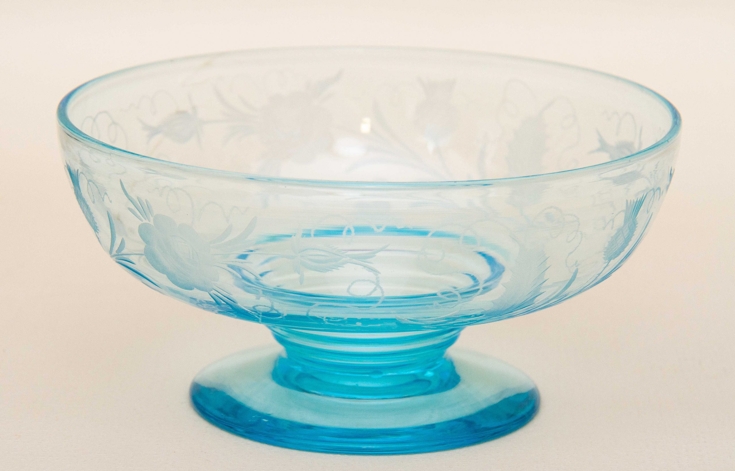 A vintage turquoise blue glass footed bowl with an etched pattern featuring thistles and roses.