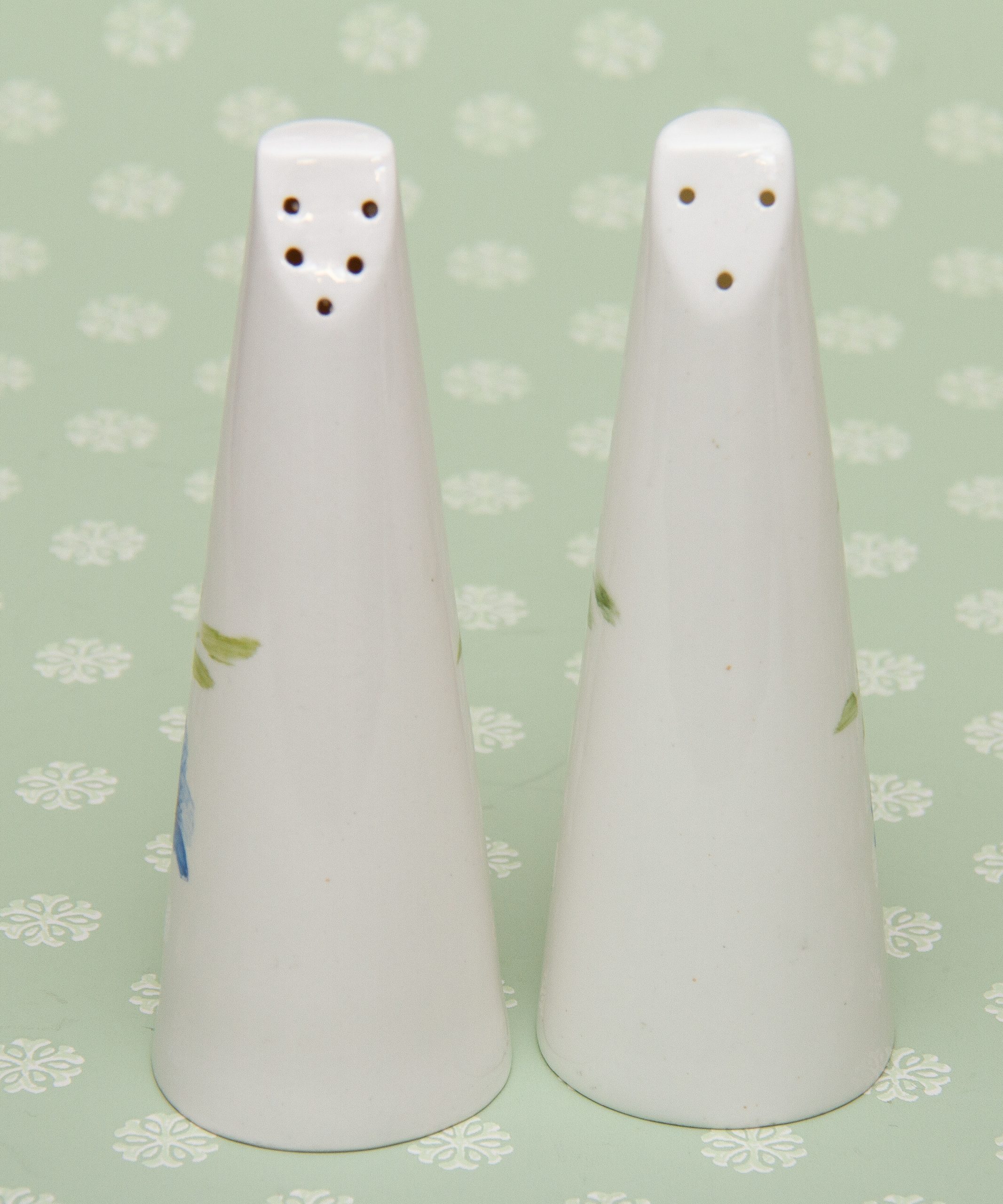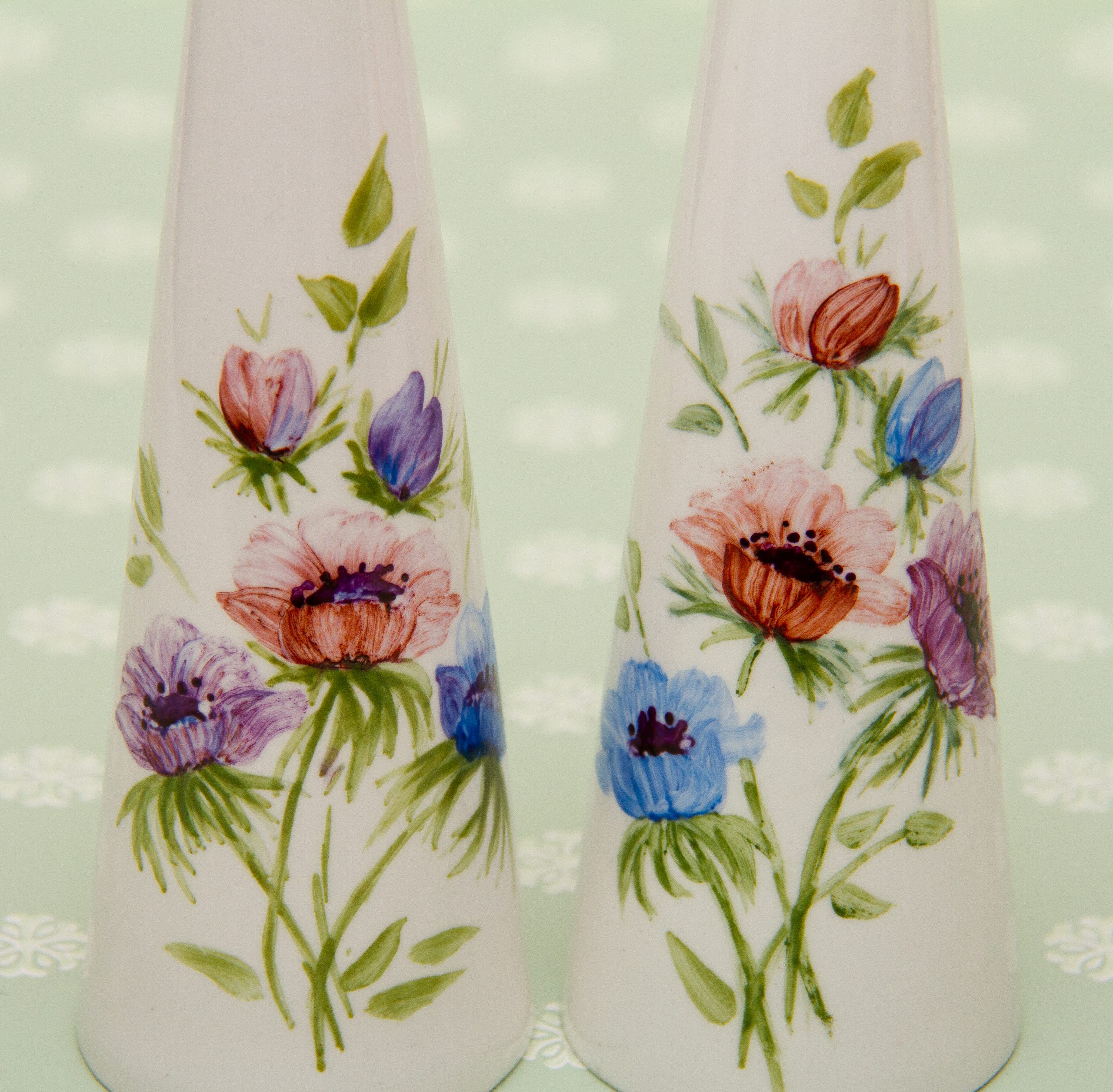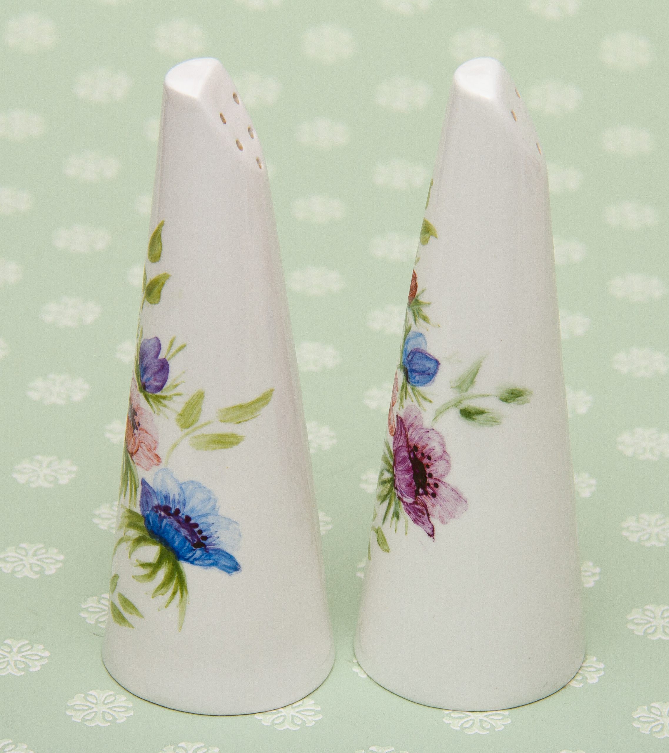 A pair of unusual cone shaped salt and pepper pots. Hand painted with flowers, signed on the base.