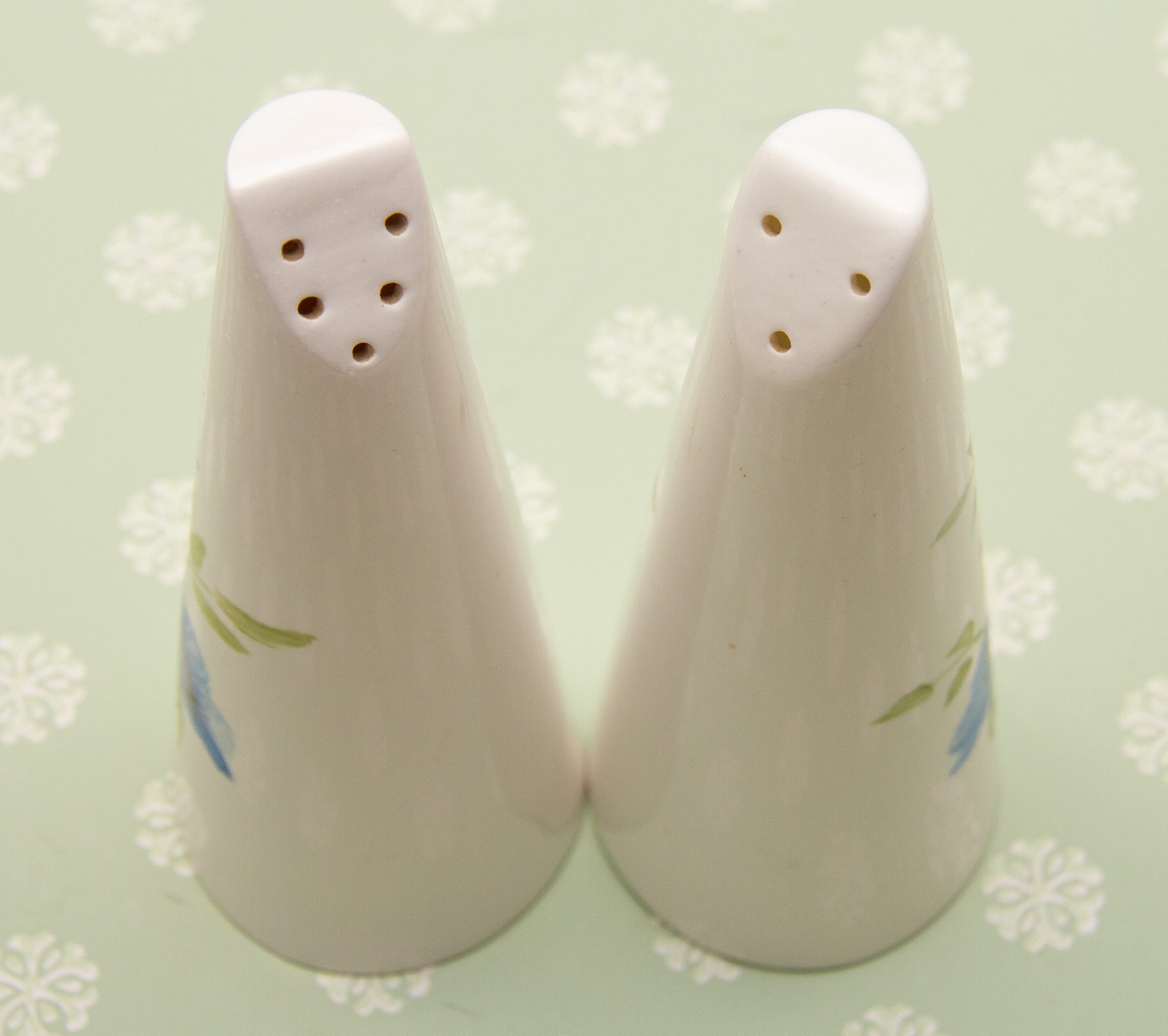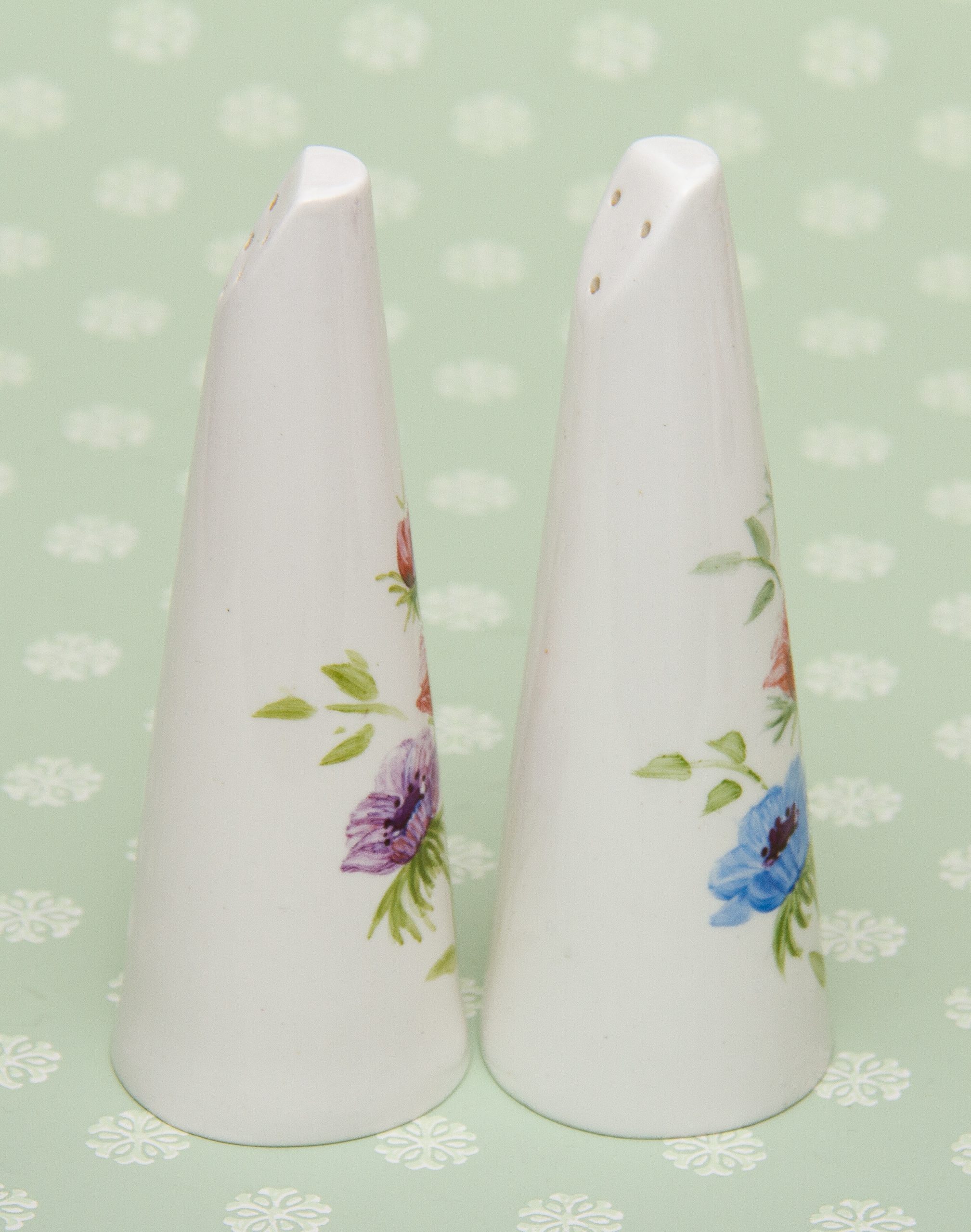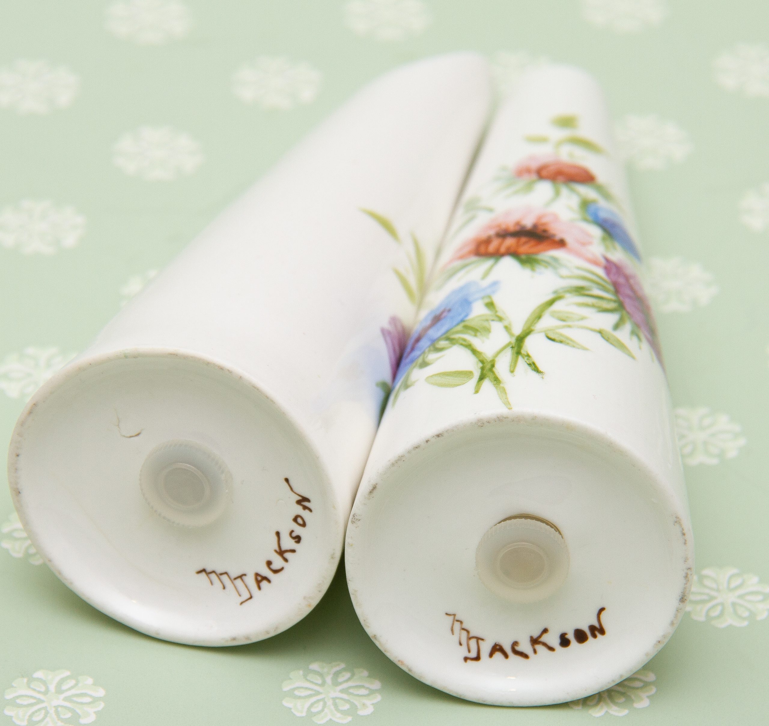 A pair of unusual cone shaped salt and pepper pots. Hand painted with flowers, signed on the base.
