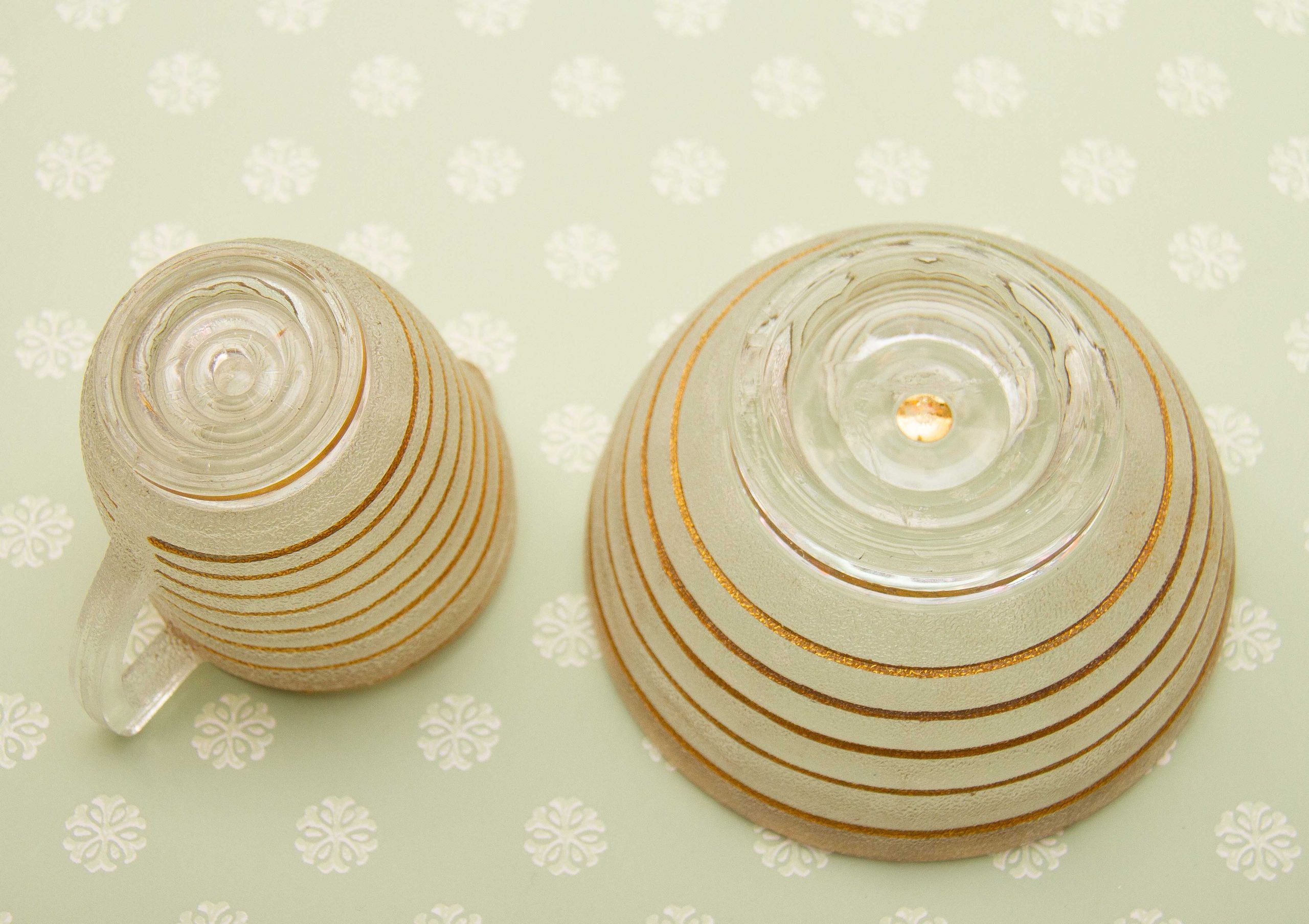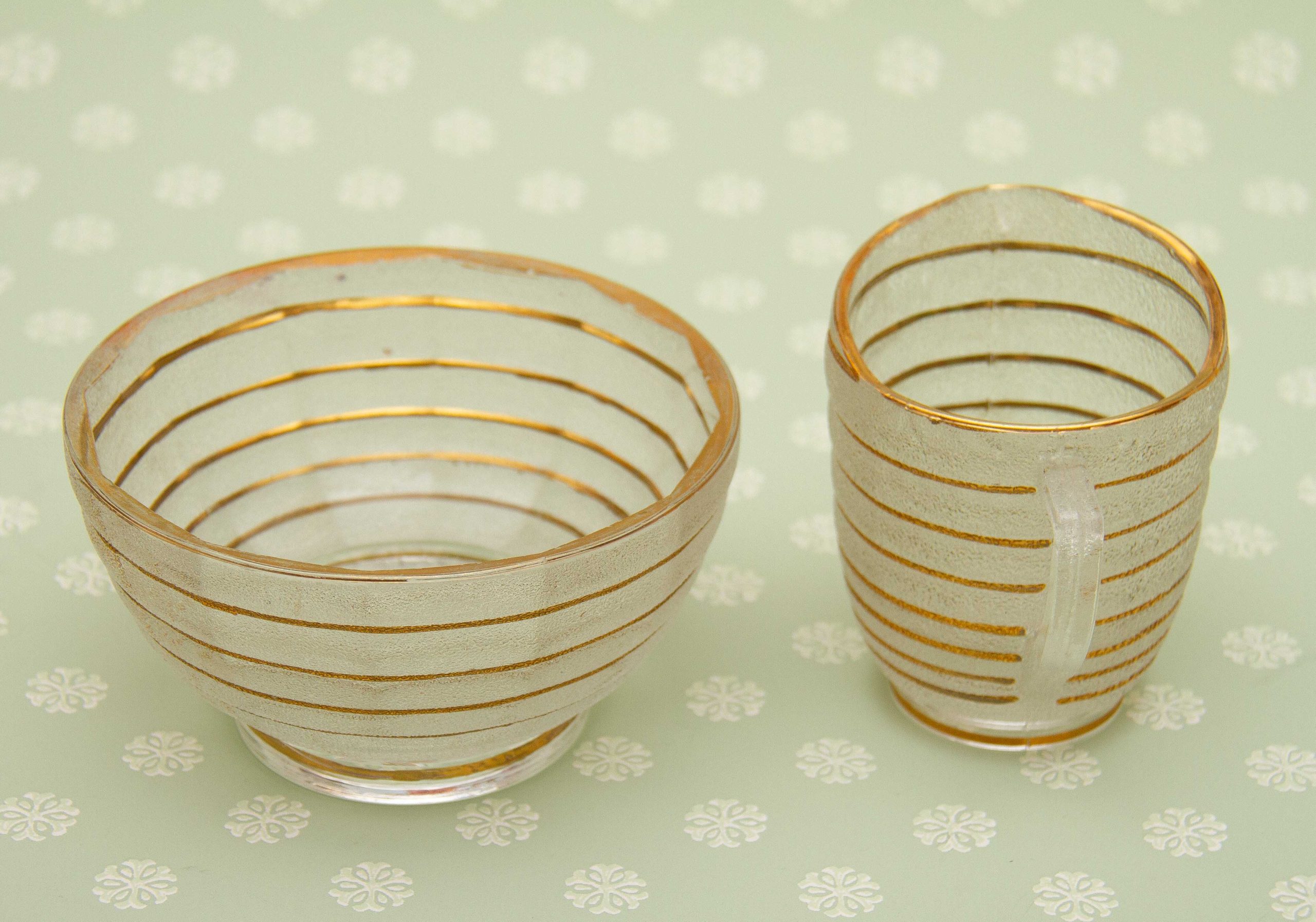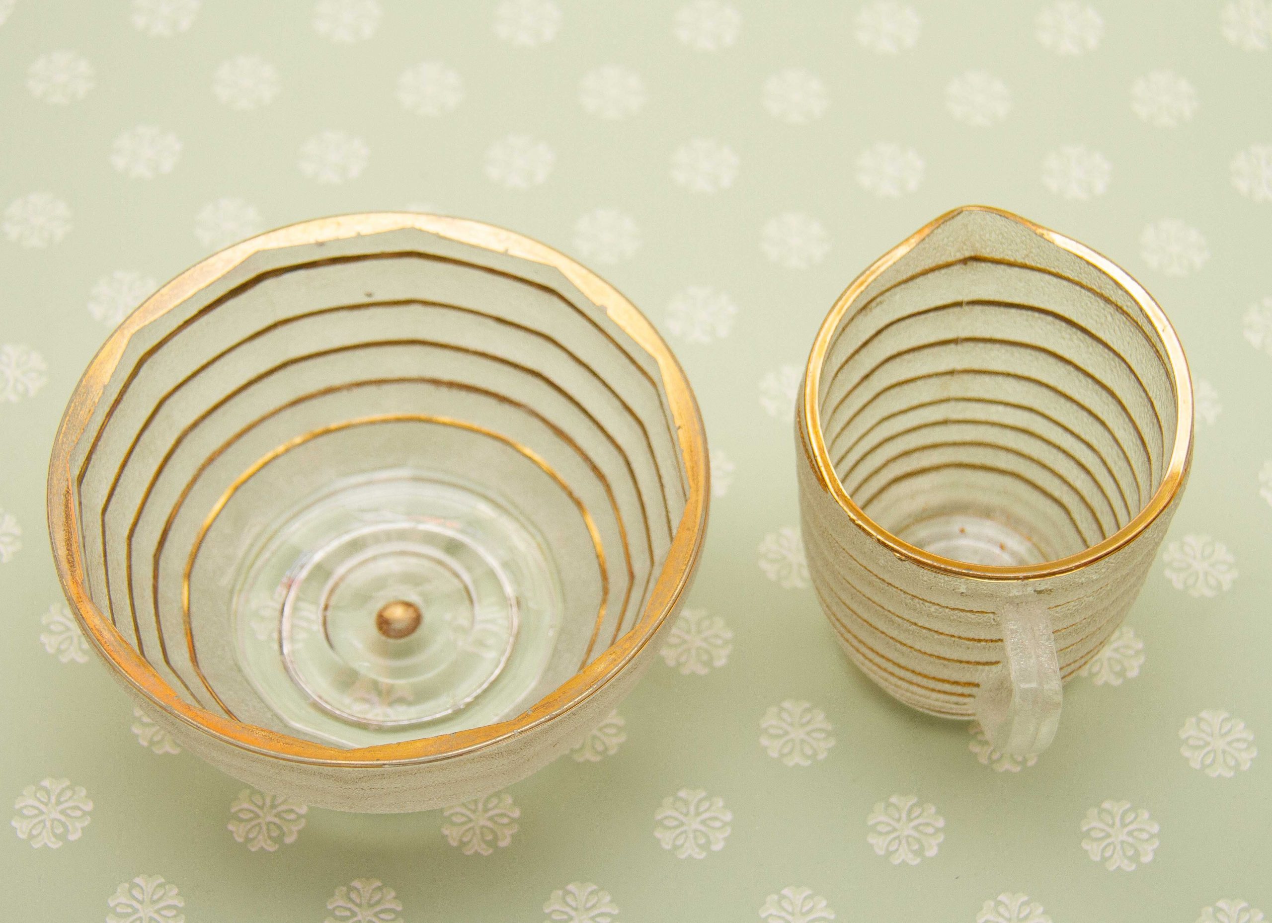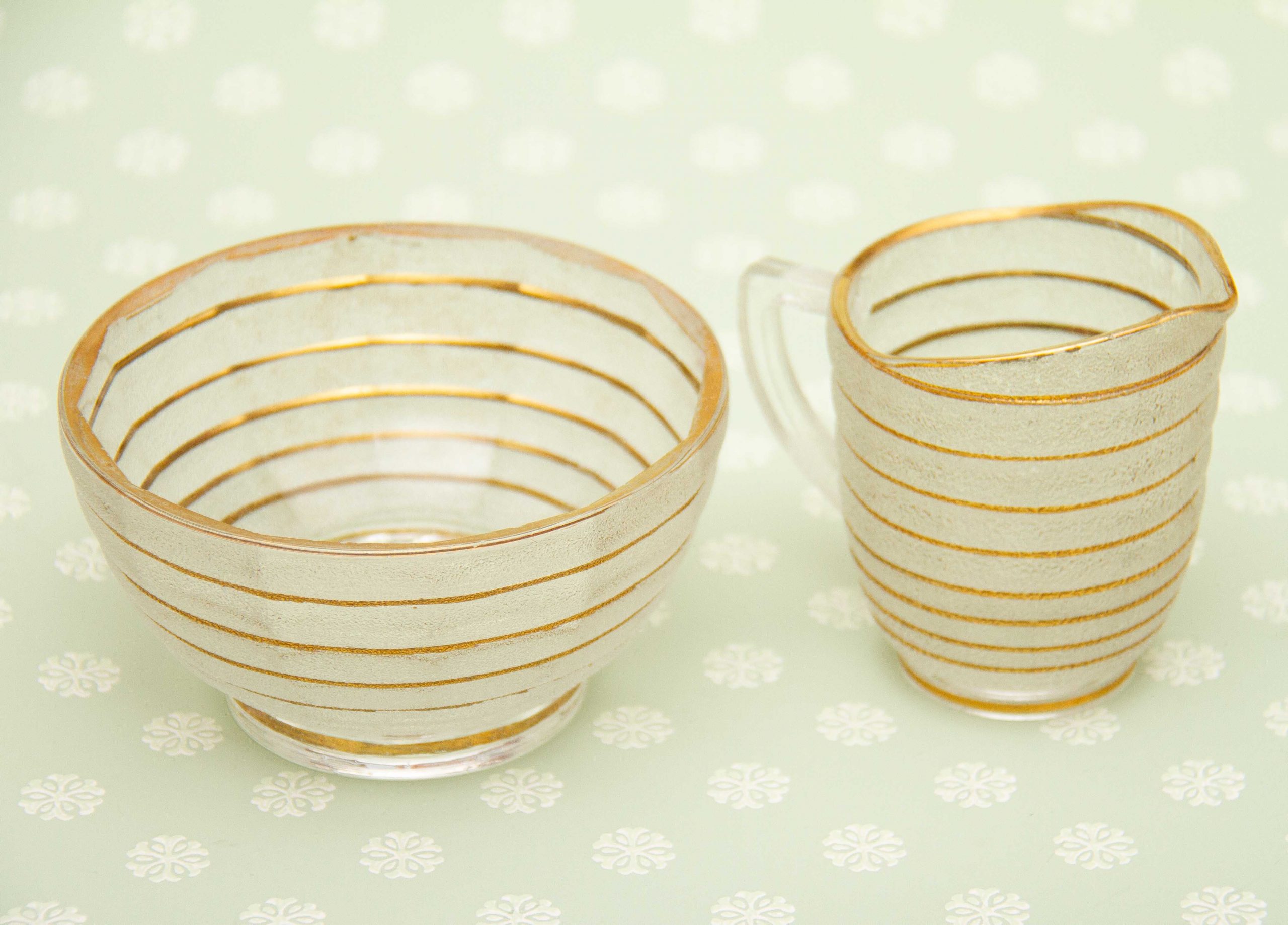 A vintage 1960’s frosted glass sugar bowl and milk jug set. With a gold band design.