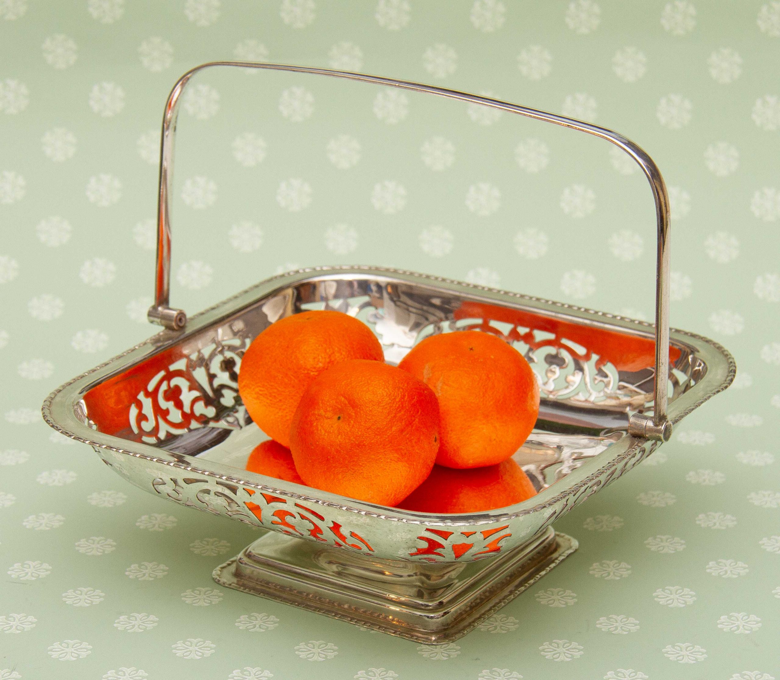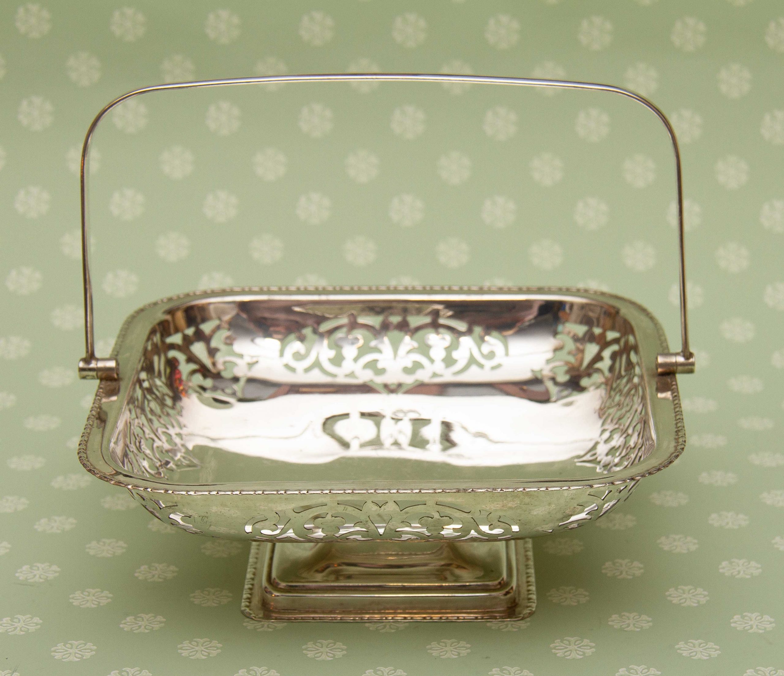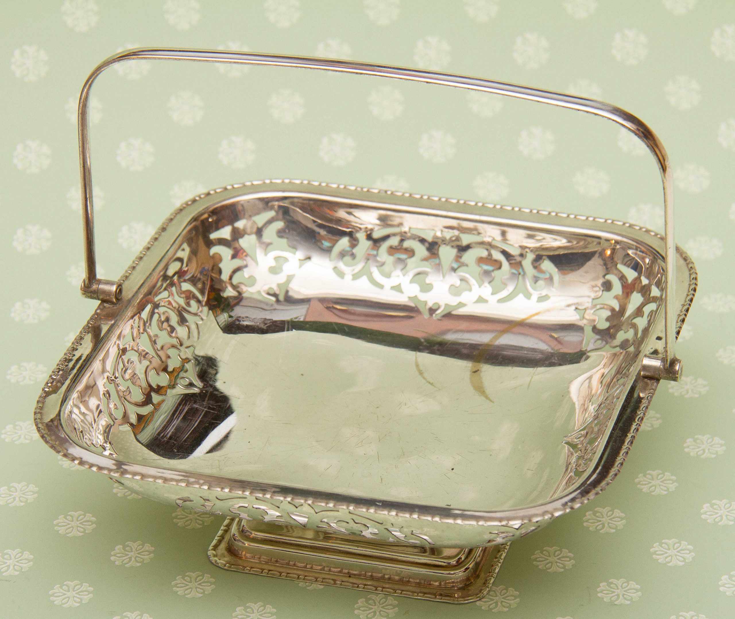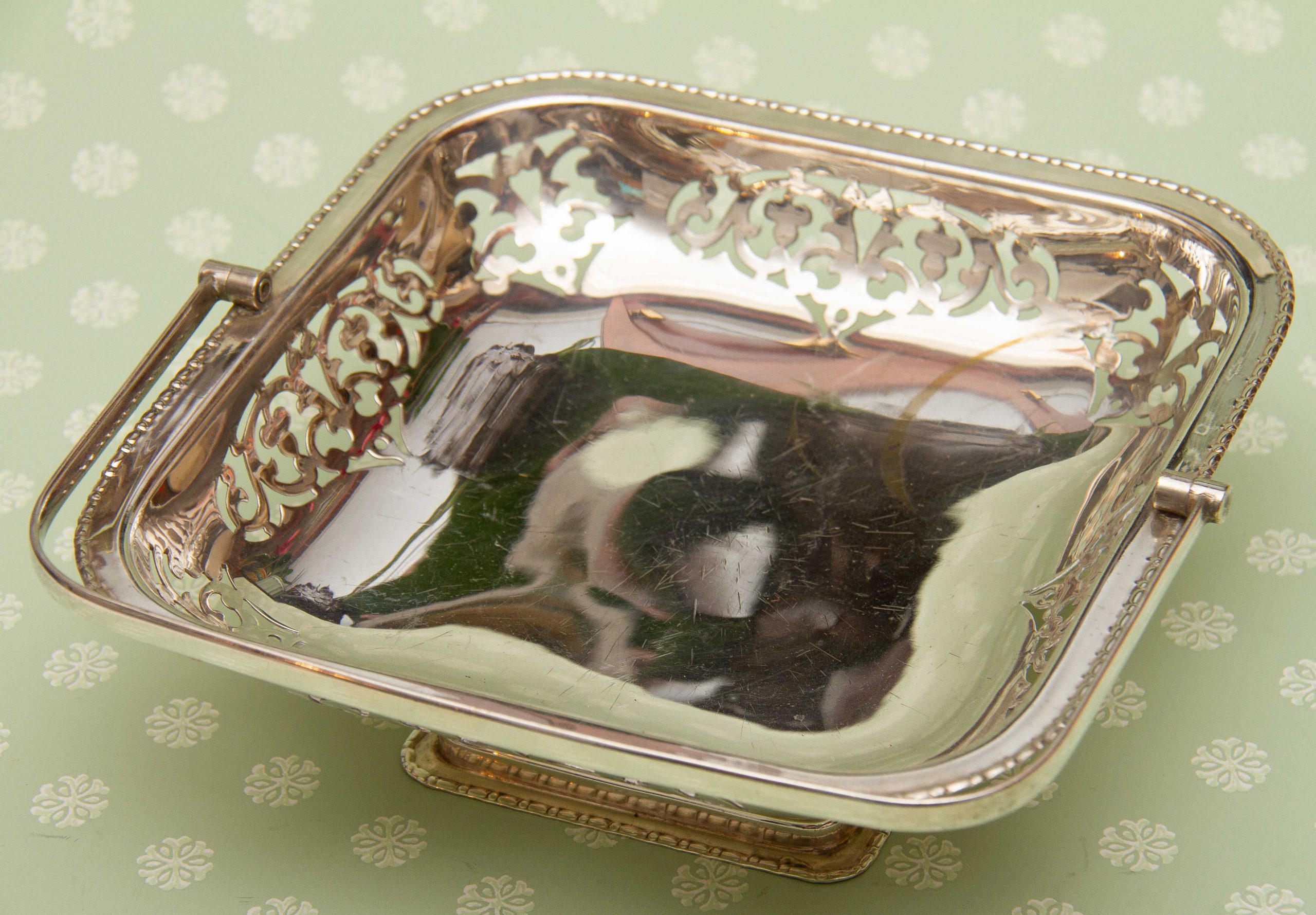 A Birmingham Handicrafts Ltd silver plated footed square dish. With decorative openwork on each side and a folding handle. Stamped BH Ld EPNS. Dating from the early 1900’s.