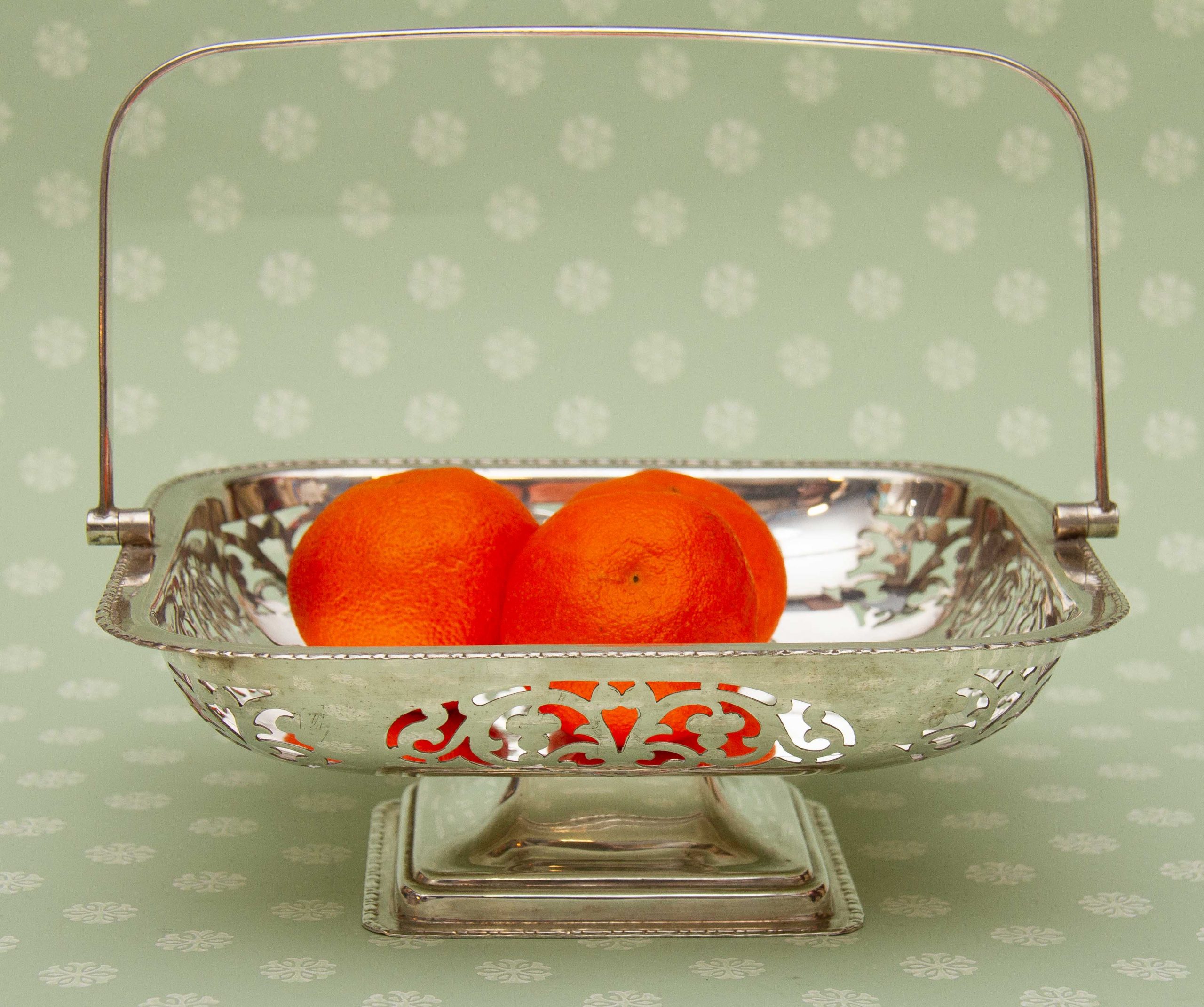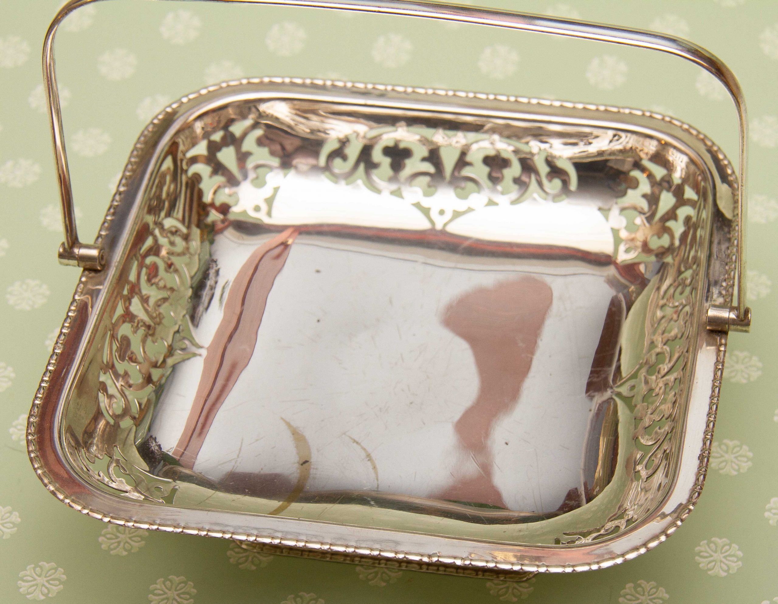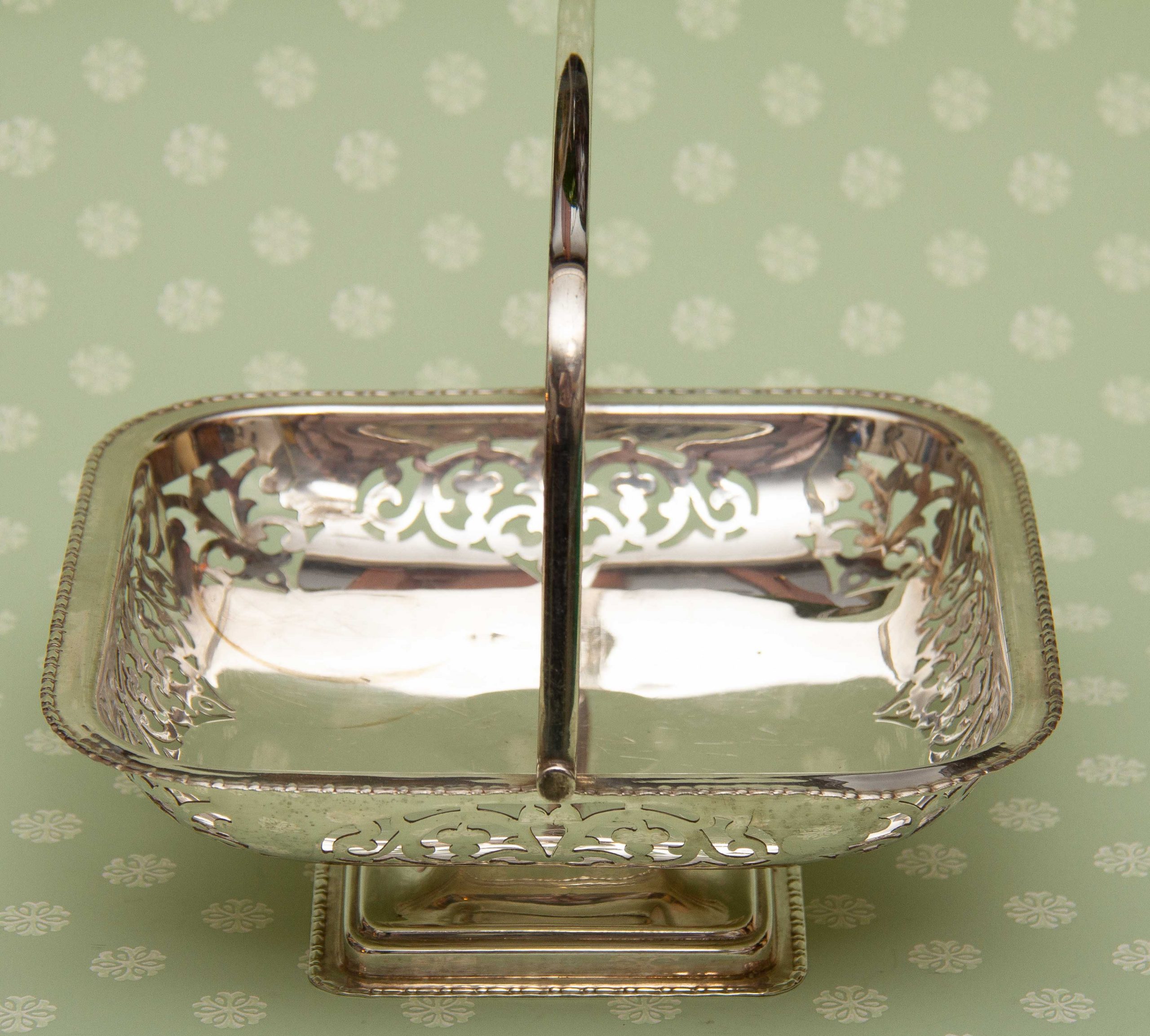 A Birmingham Handicrafts Ltd silver plated footed square dish. With decorative openwork on each side and a folding handle. Stamped BH Ld EPNS. Dating from the early 1900’s.