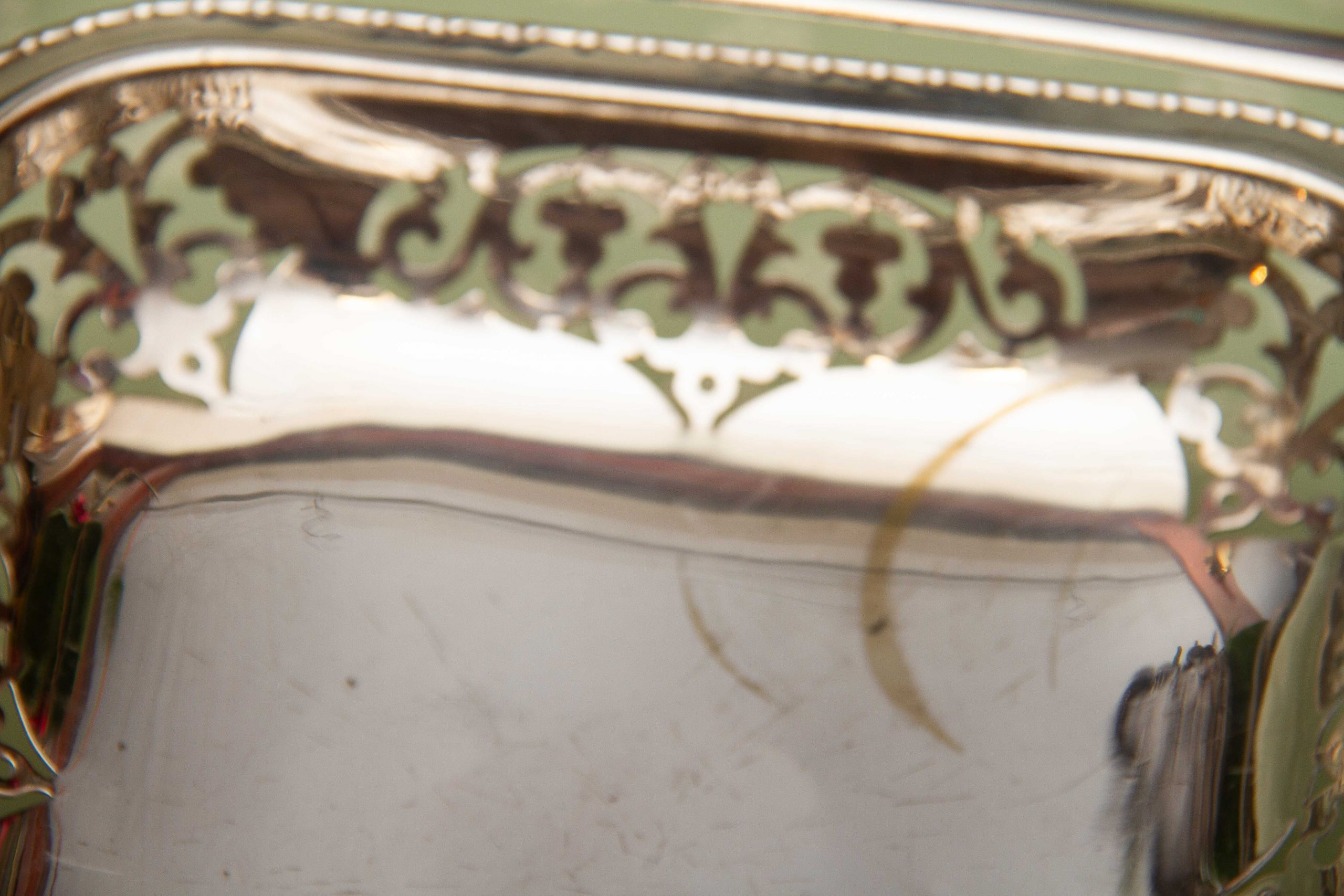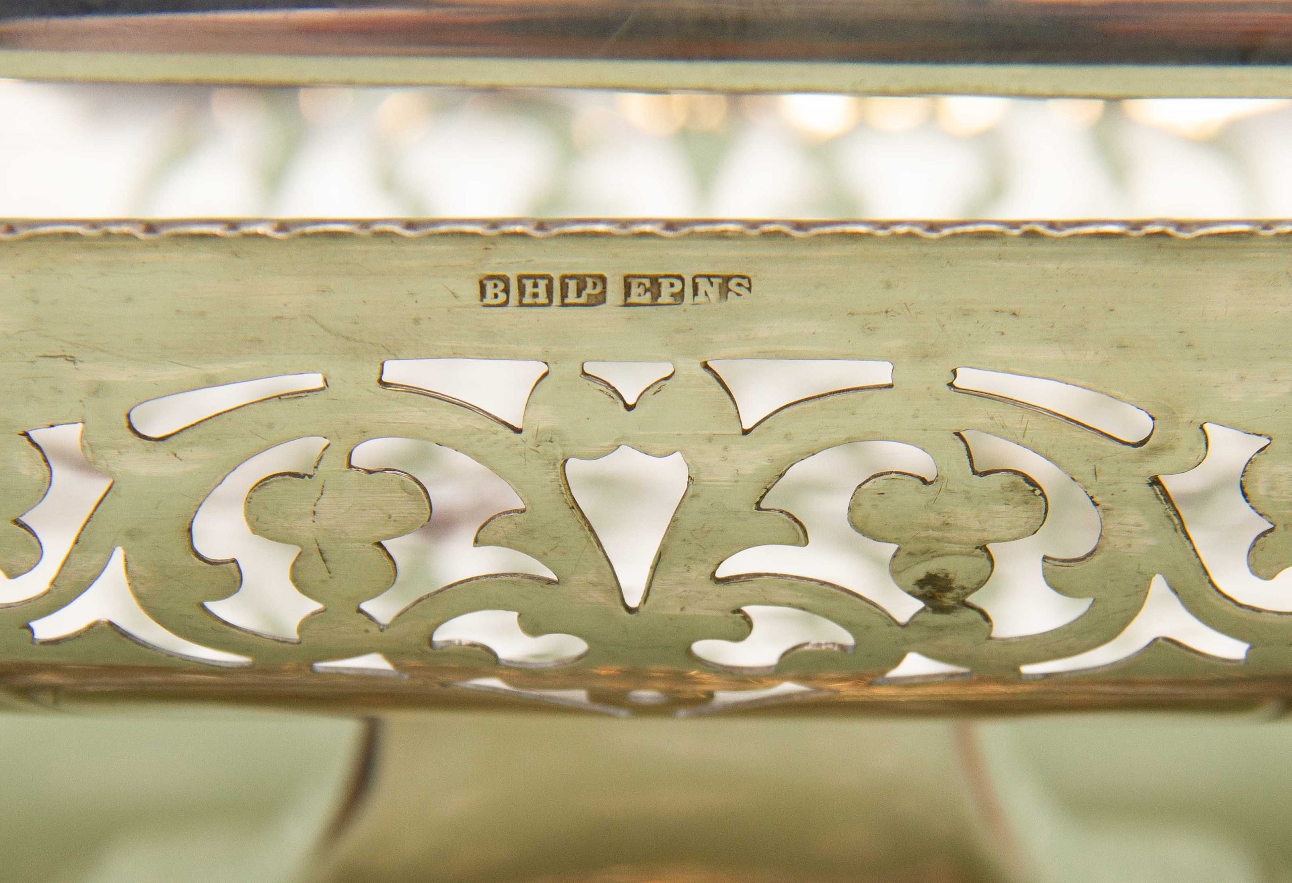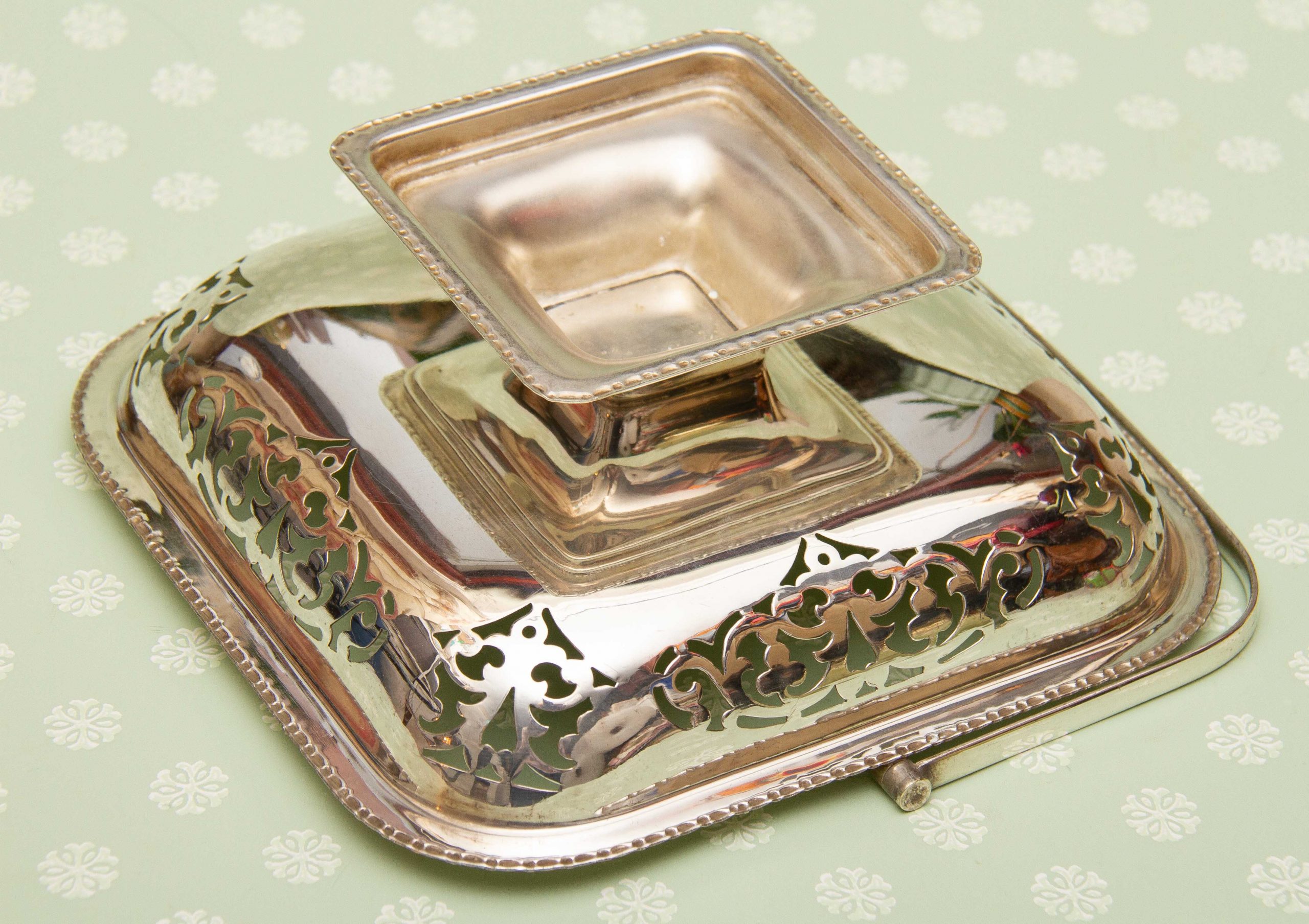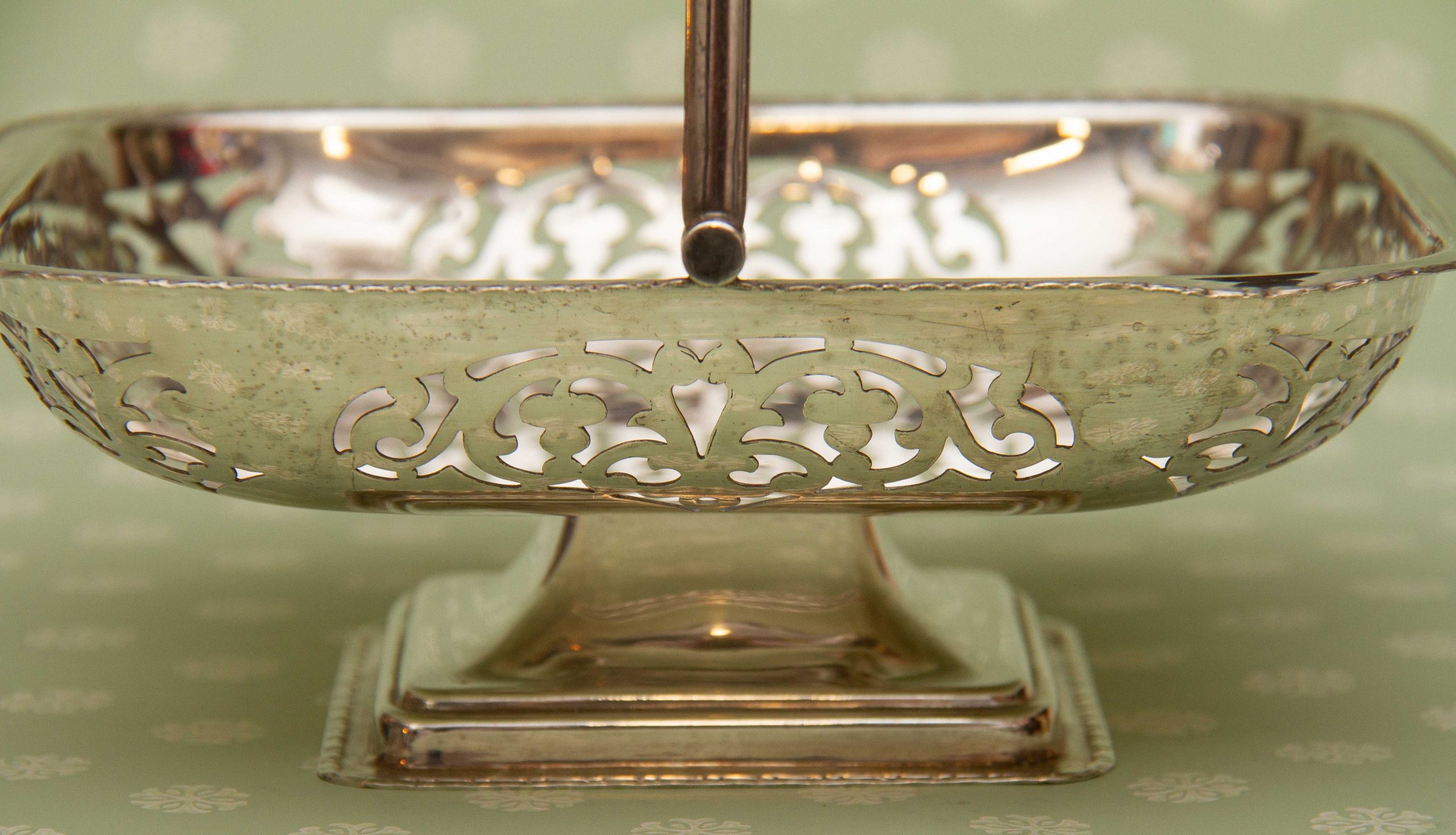 A Birmingham Handicrafts Ltd silver plated footed square dish. With decorative openwork on each side and a folding handle. Stamped BH Ld EPNS. Dating from the early 1900’s.