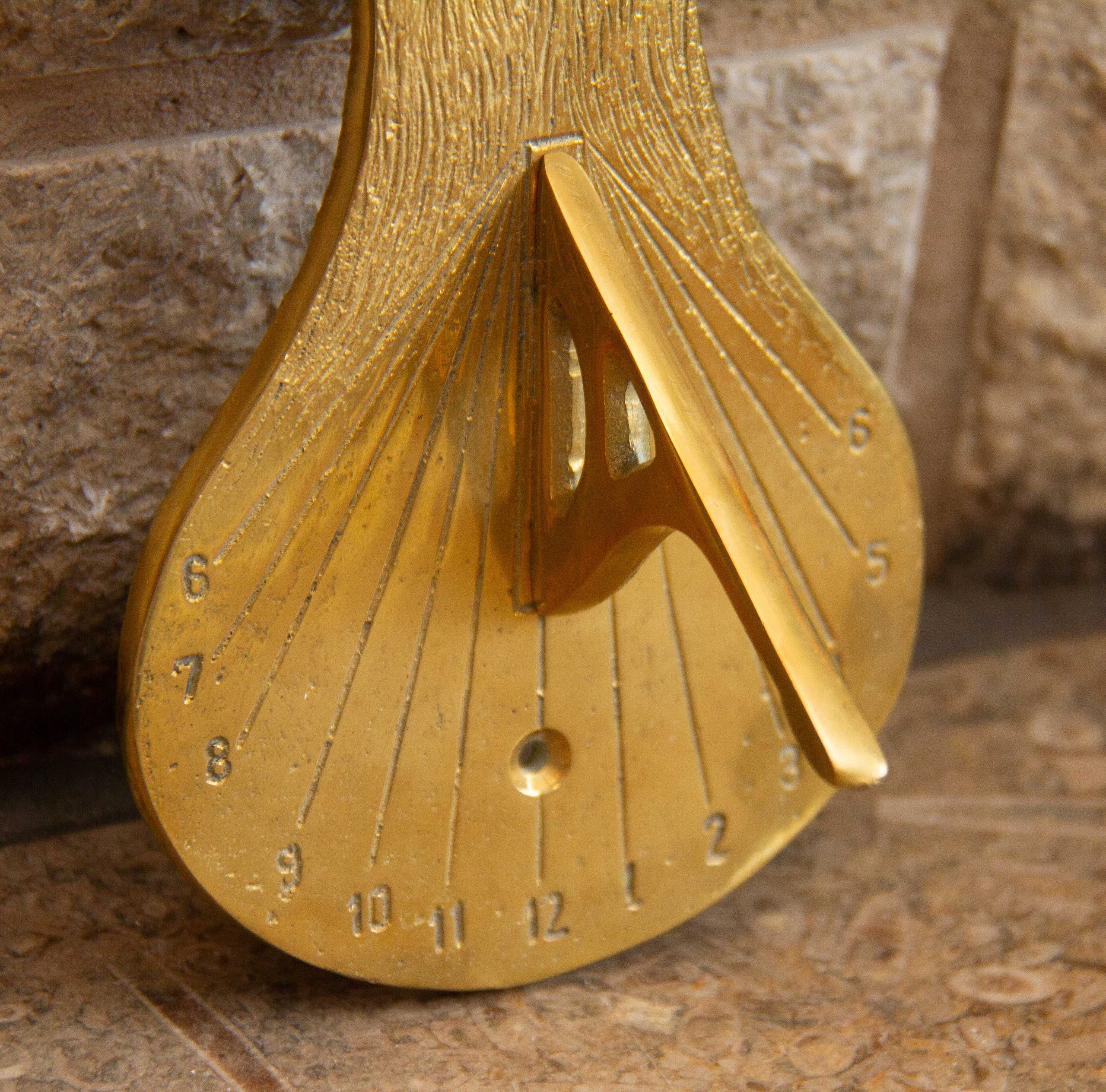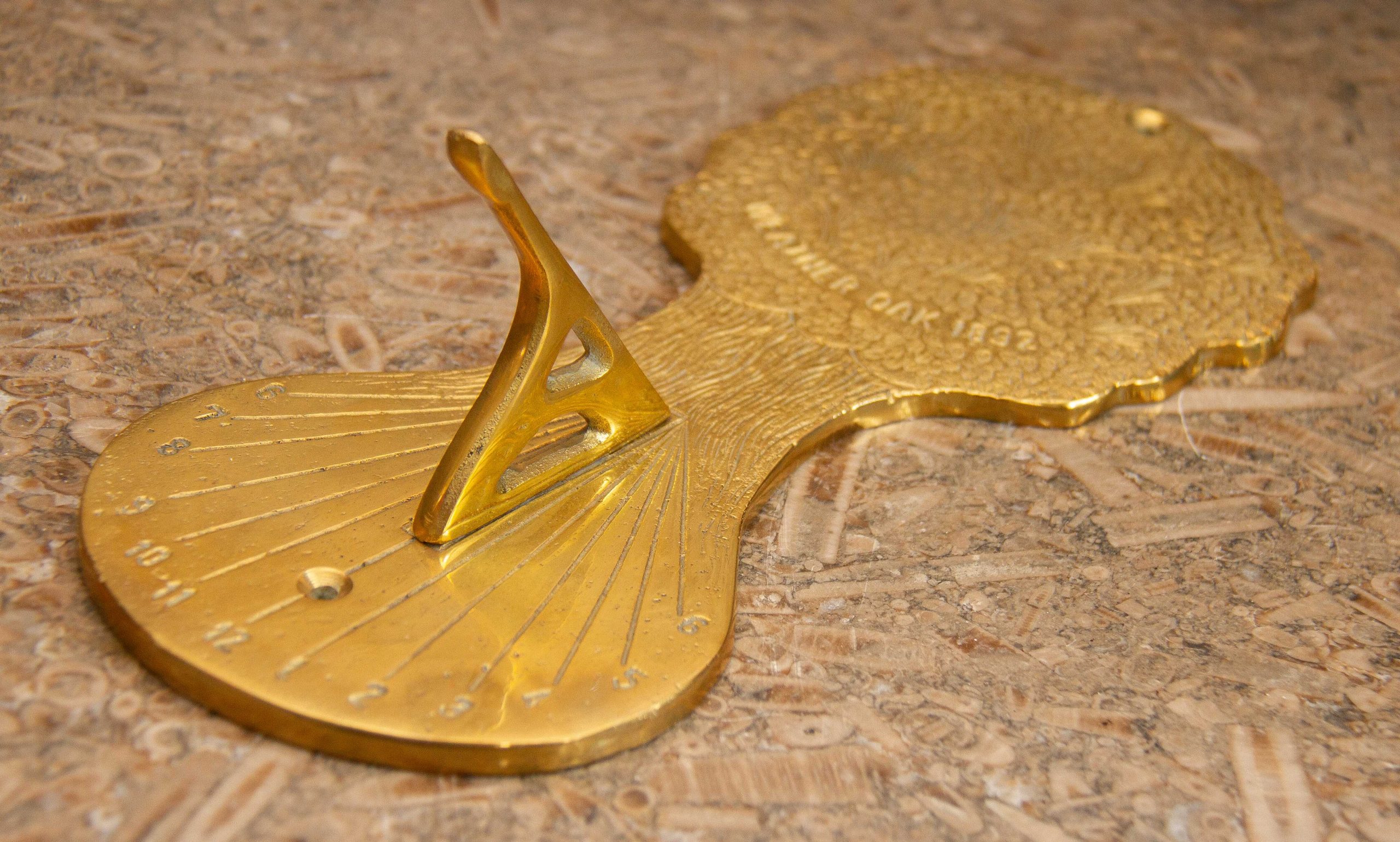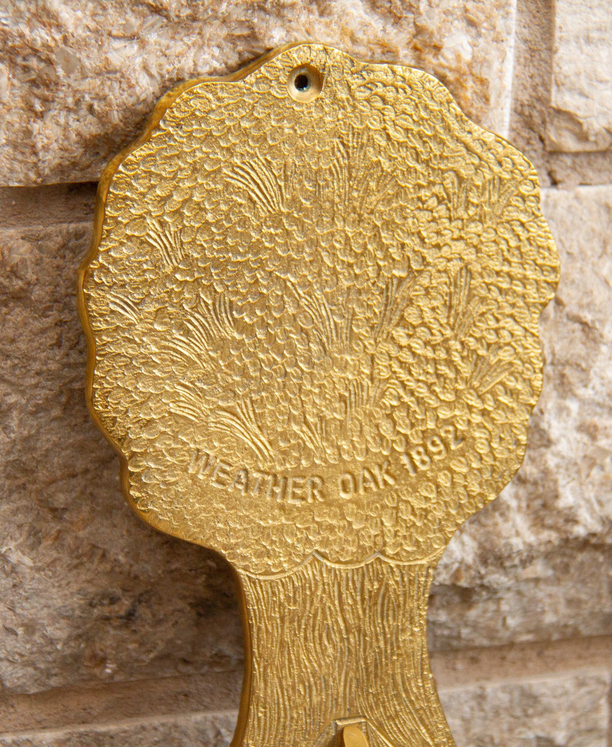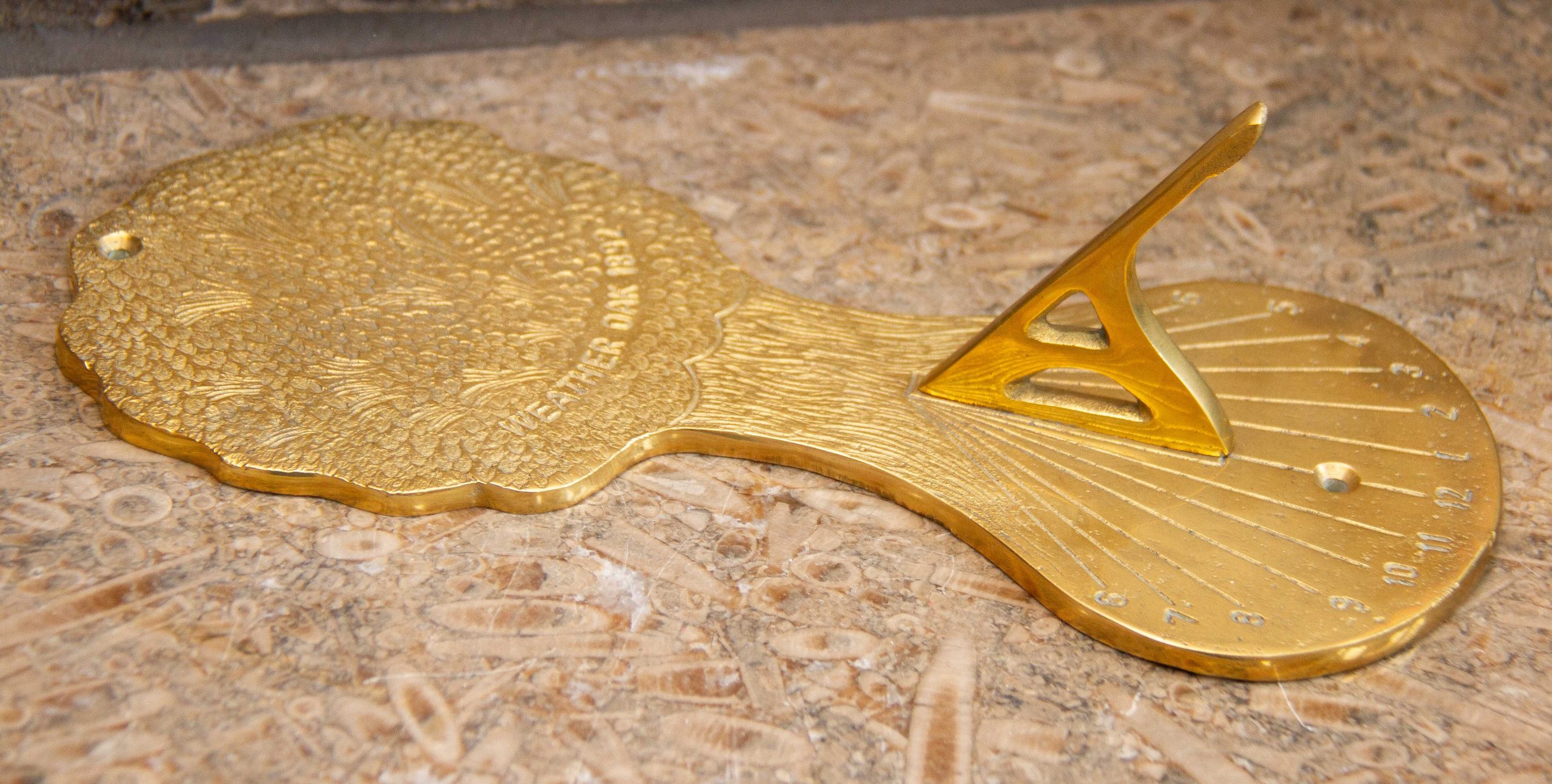 A vintage brass sundial in a tree design with the words “Weather Oak 1892” impressed on. There are 2 pre-drilled holes ready for fixing to a wall or stand