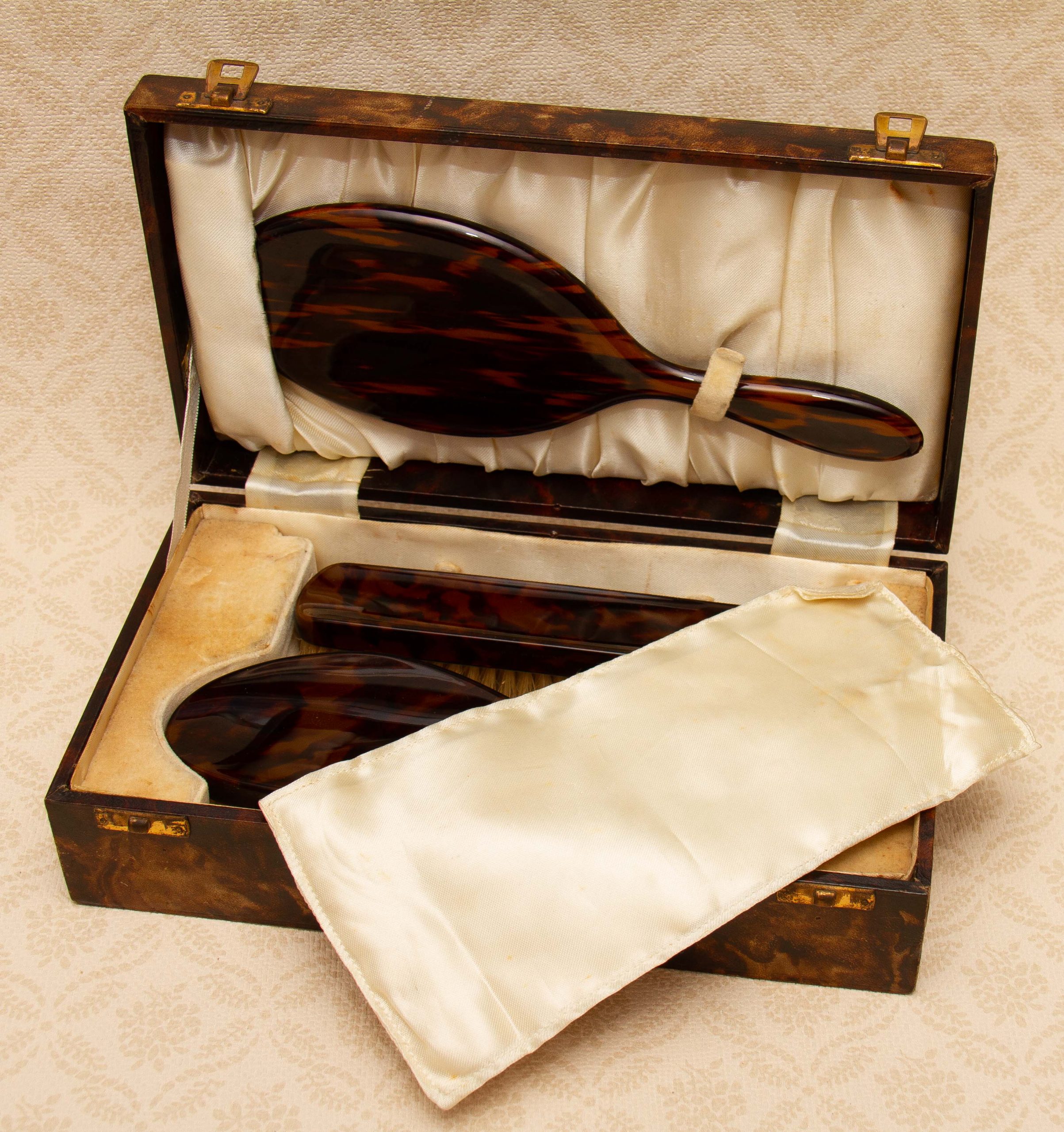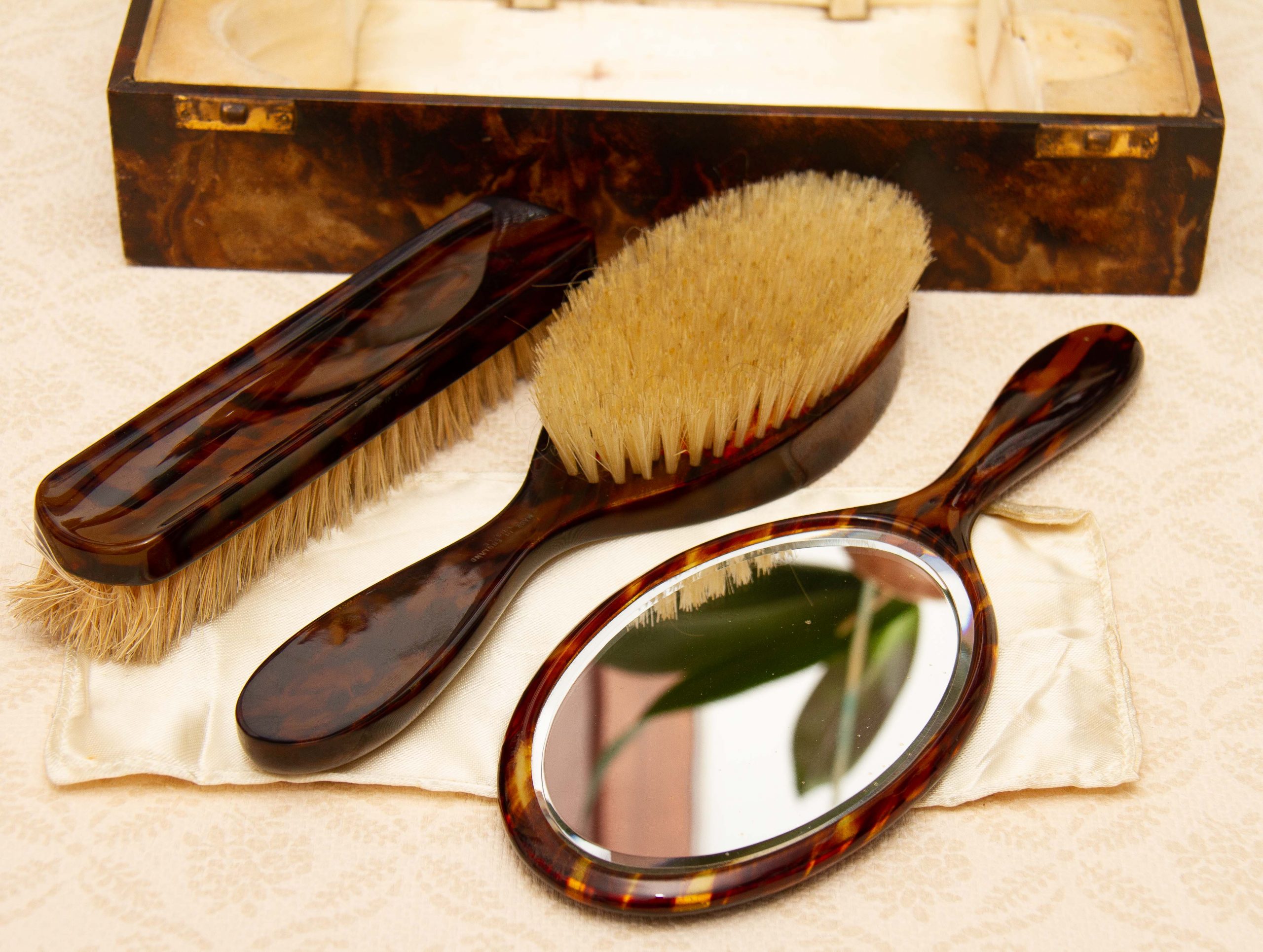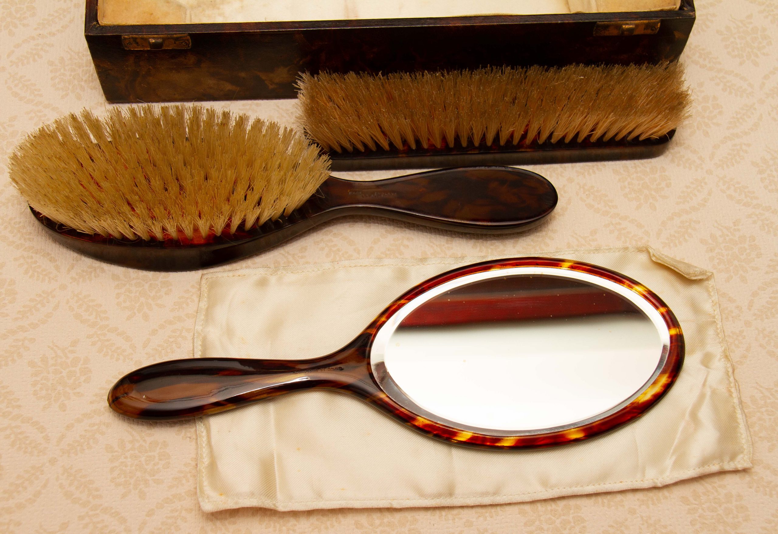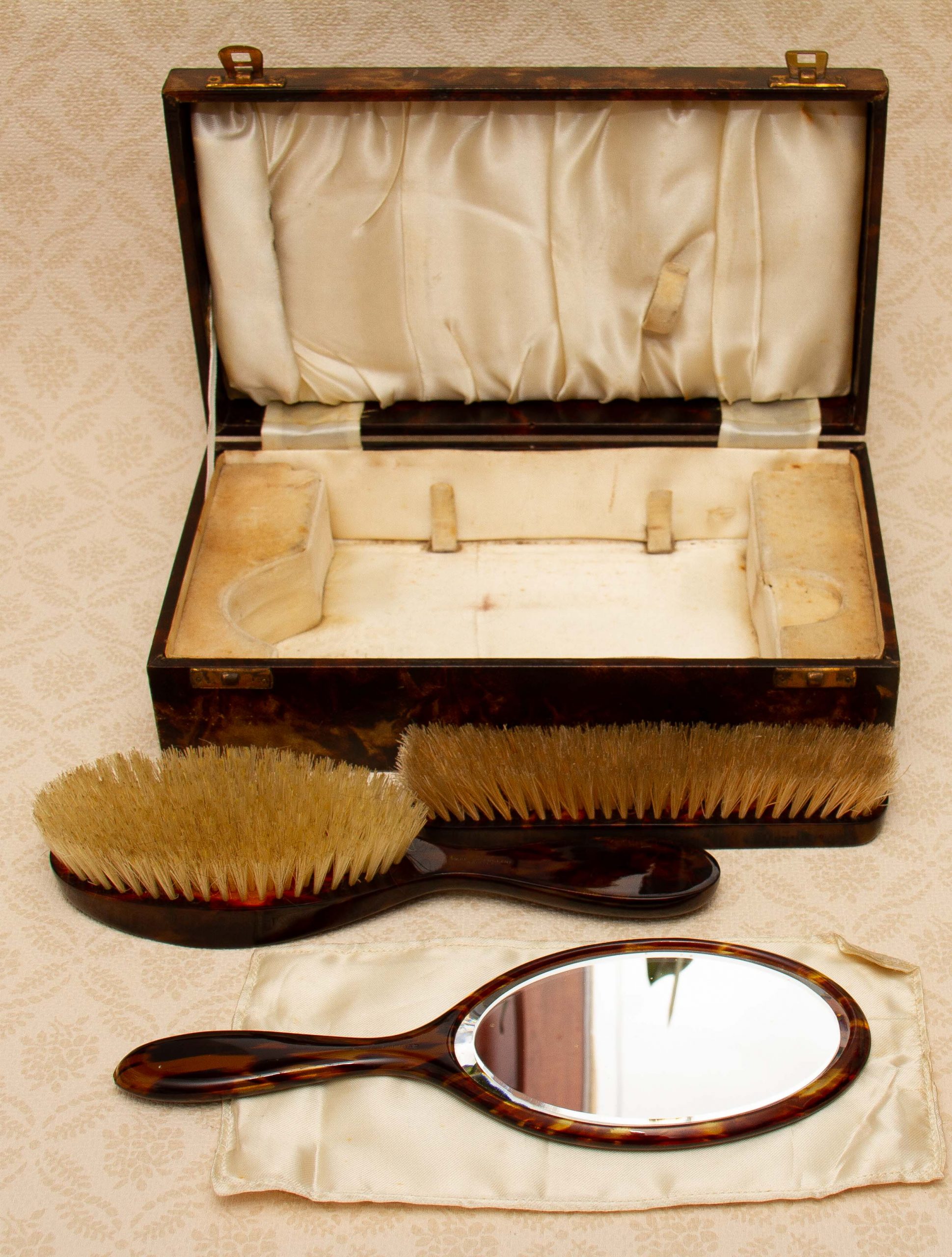 A vintage faux tortoiseshell vanity dressing table set in a leather look case. This satin lined case houses a hand mirror and 2 brushes, one with a handle. The brushes are all pure bristle and each item has Made in England imprinted on it.