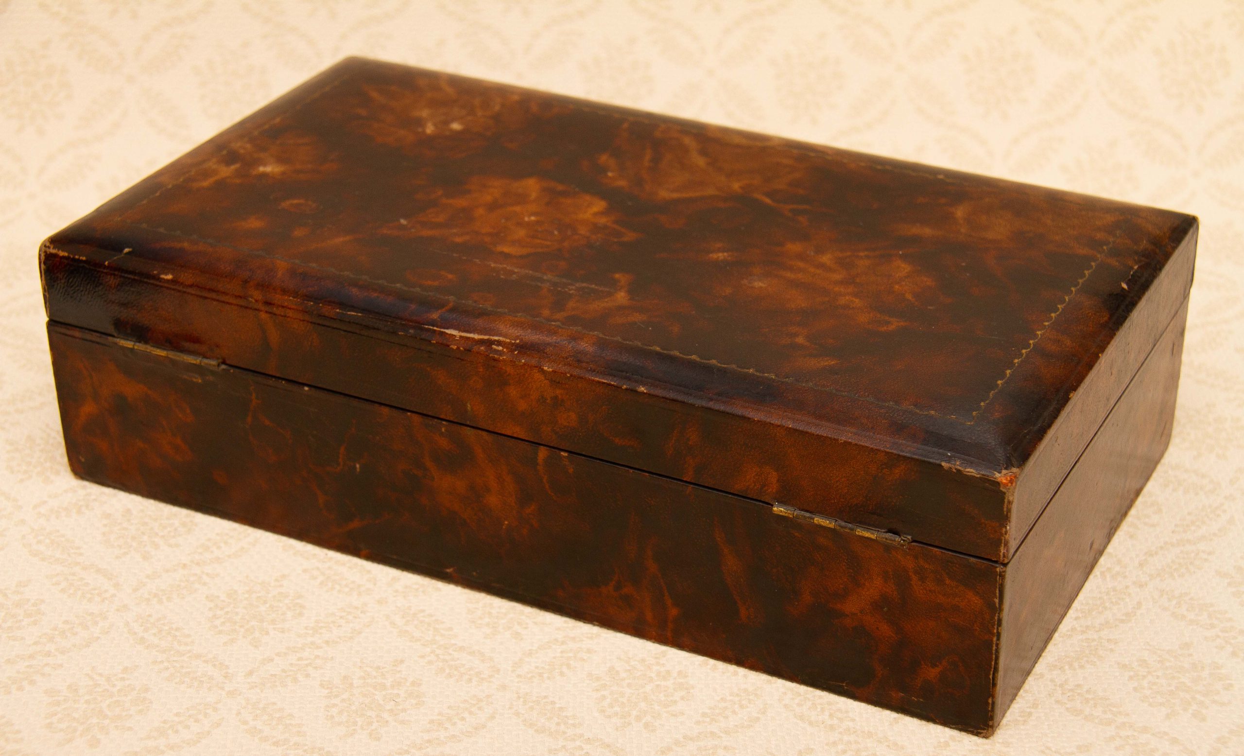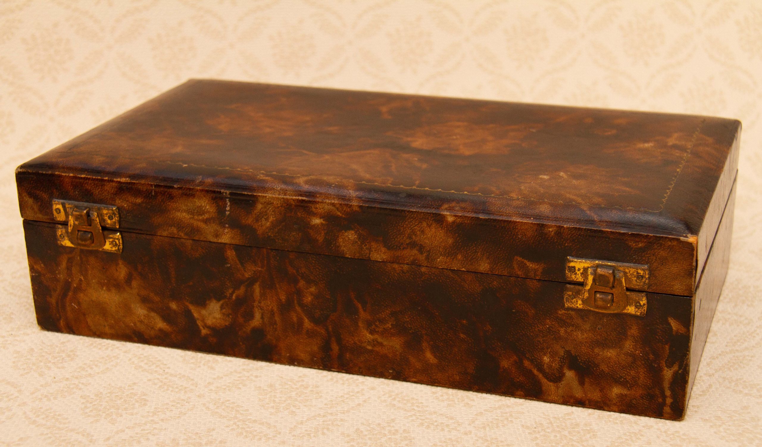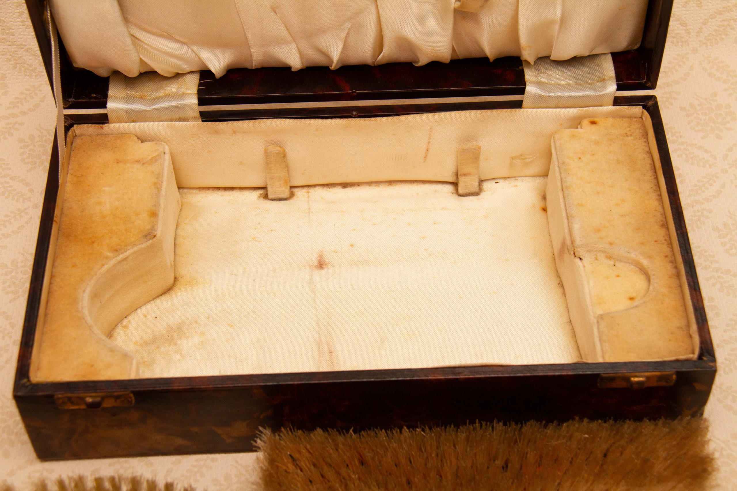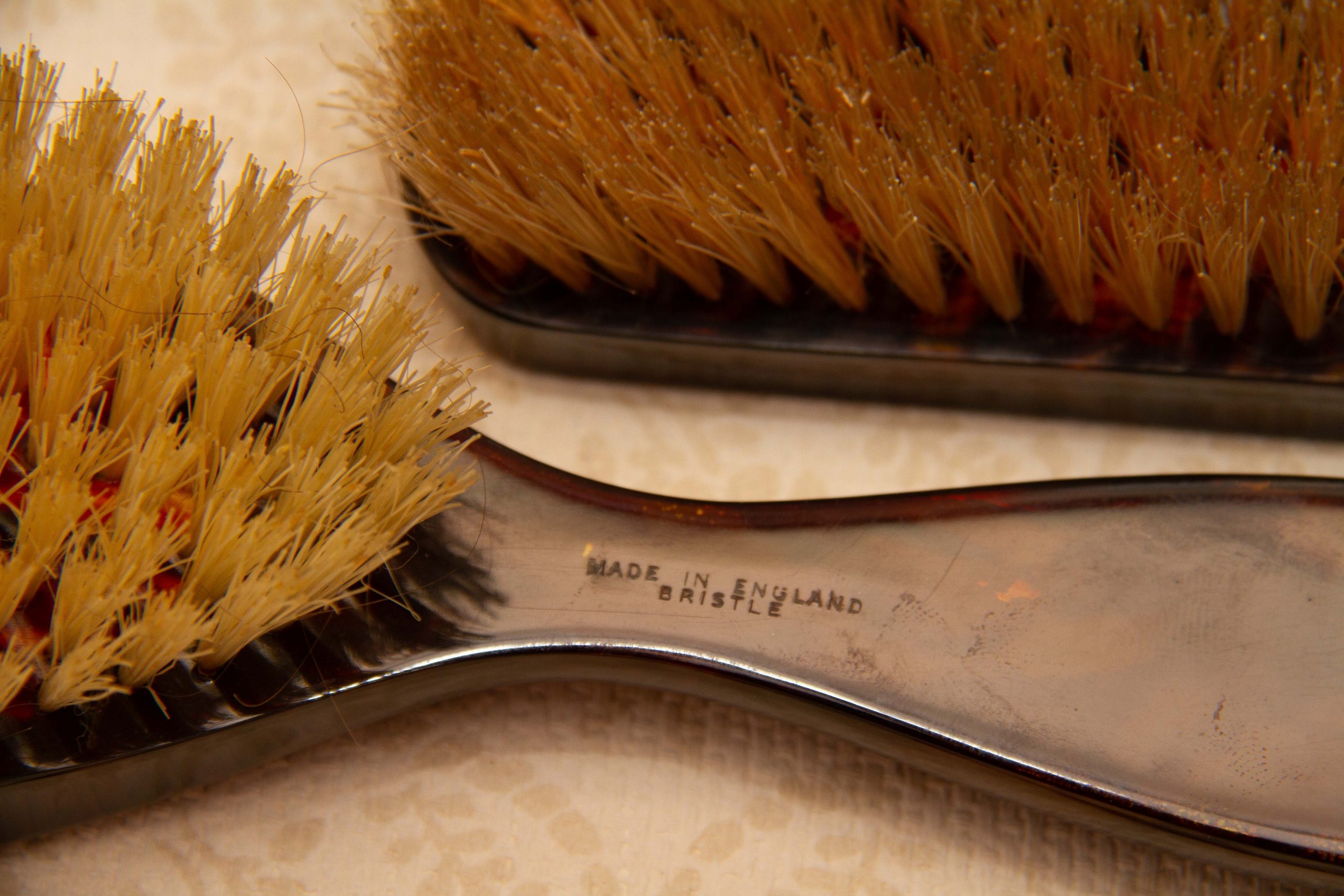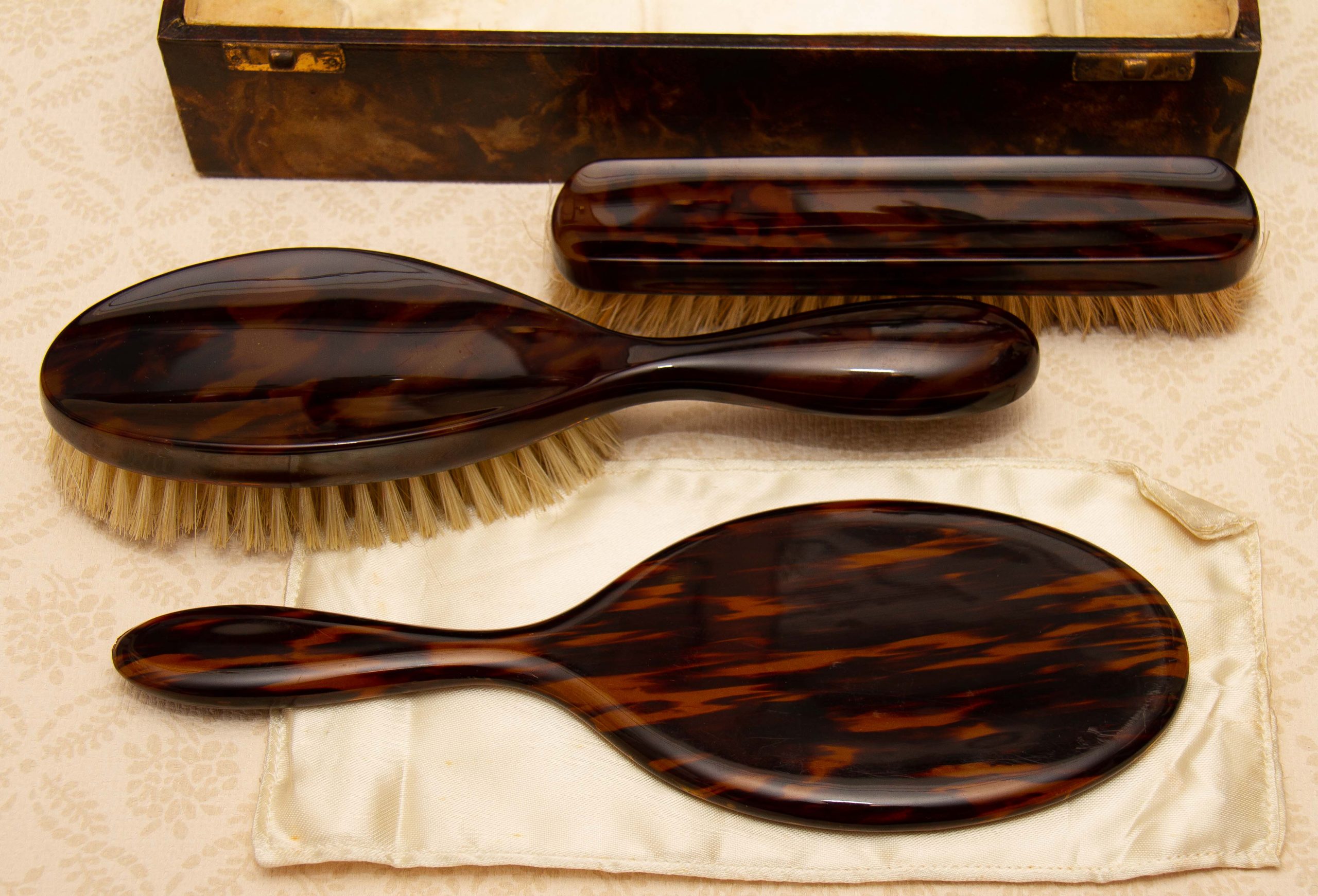 A vintage faux tortoiseshell vanity dressing table set in a leather look case. This satin lined case houses a hand mirror and 2 brushes, one with a handle. The brushes are all pure bristle and each item has Made in England imprinted on it.