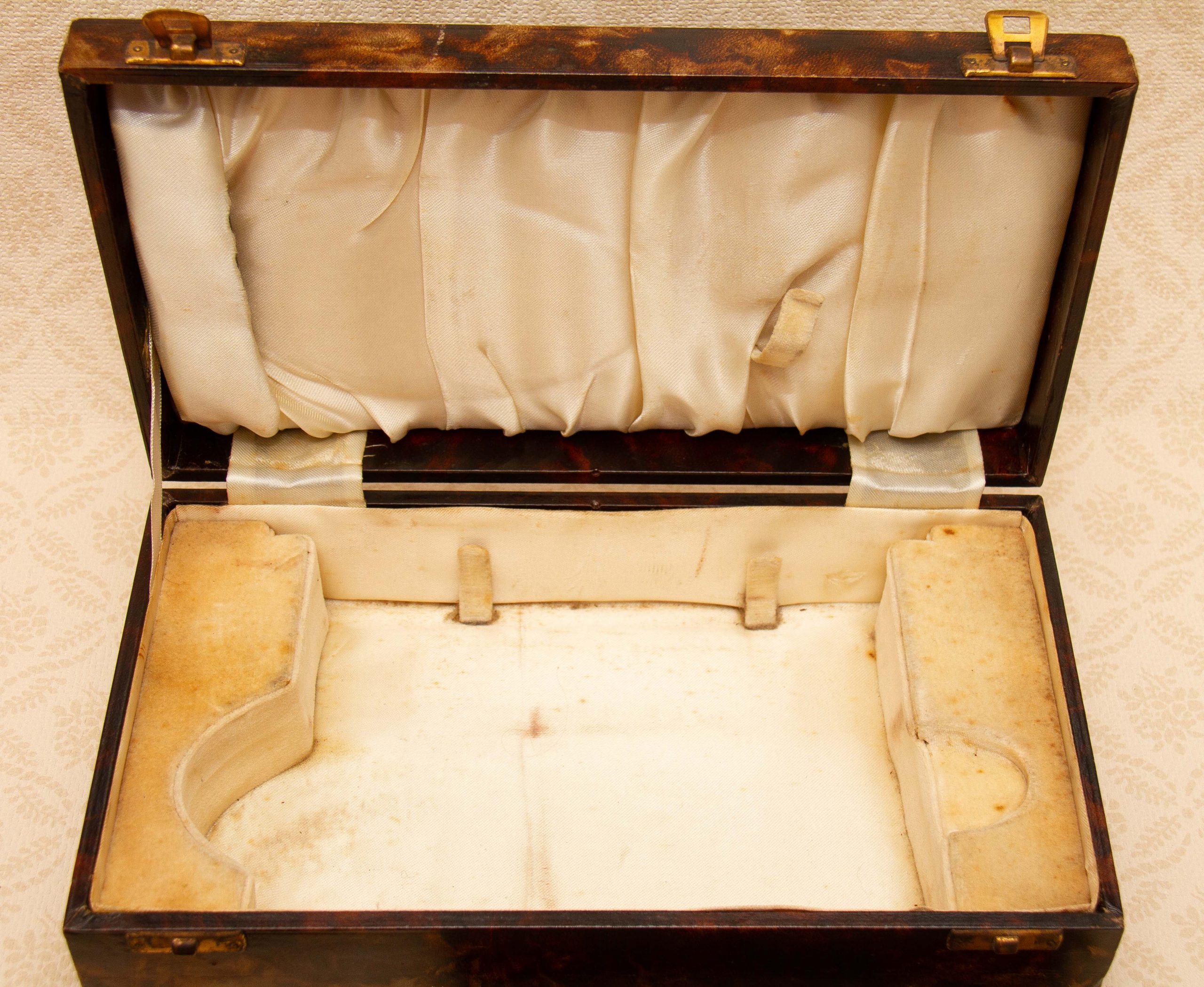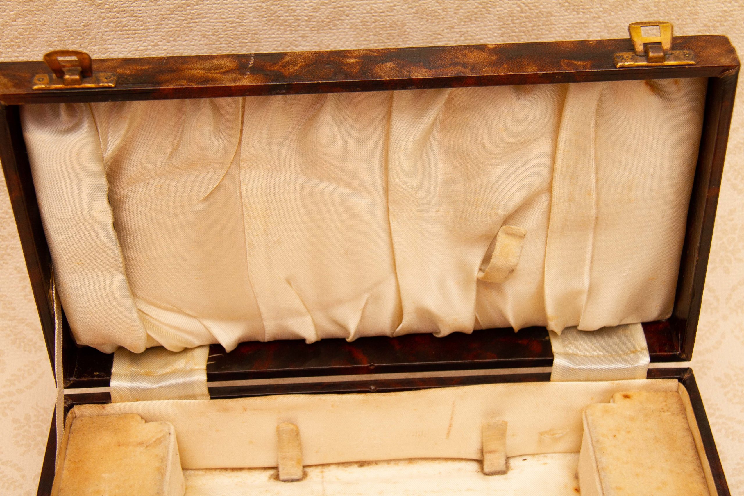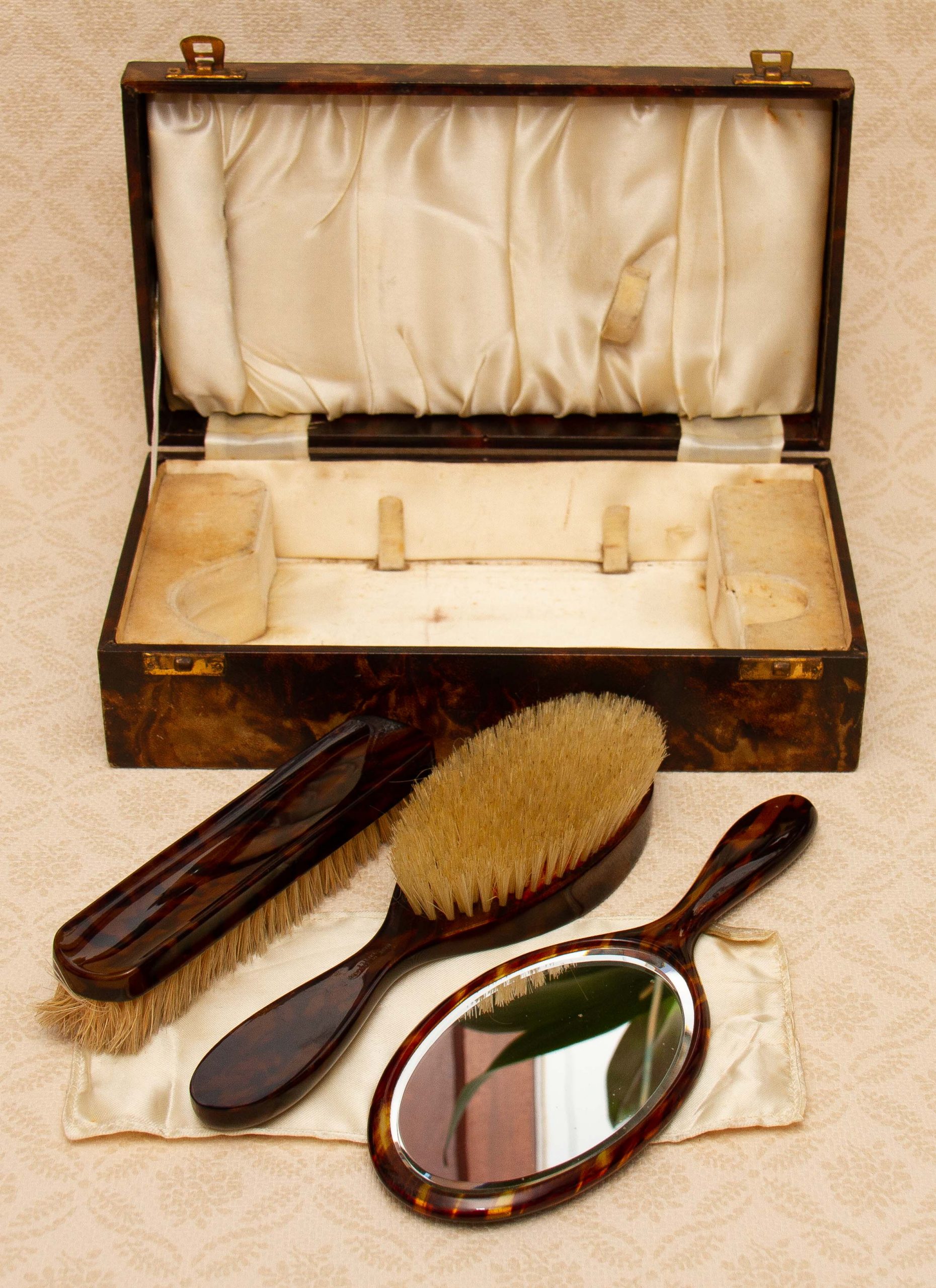 Vintage Faux Tortoiseshell Vanity Set in Case Mirror and 2 Brushes Dressing Table Set In Box