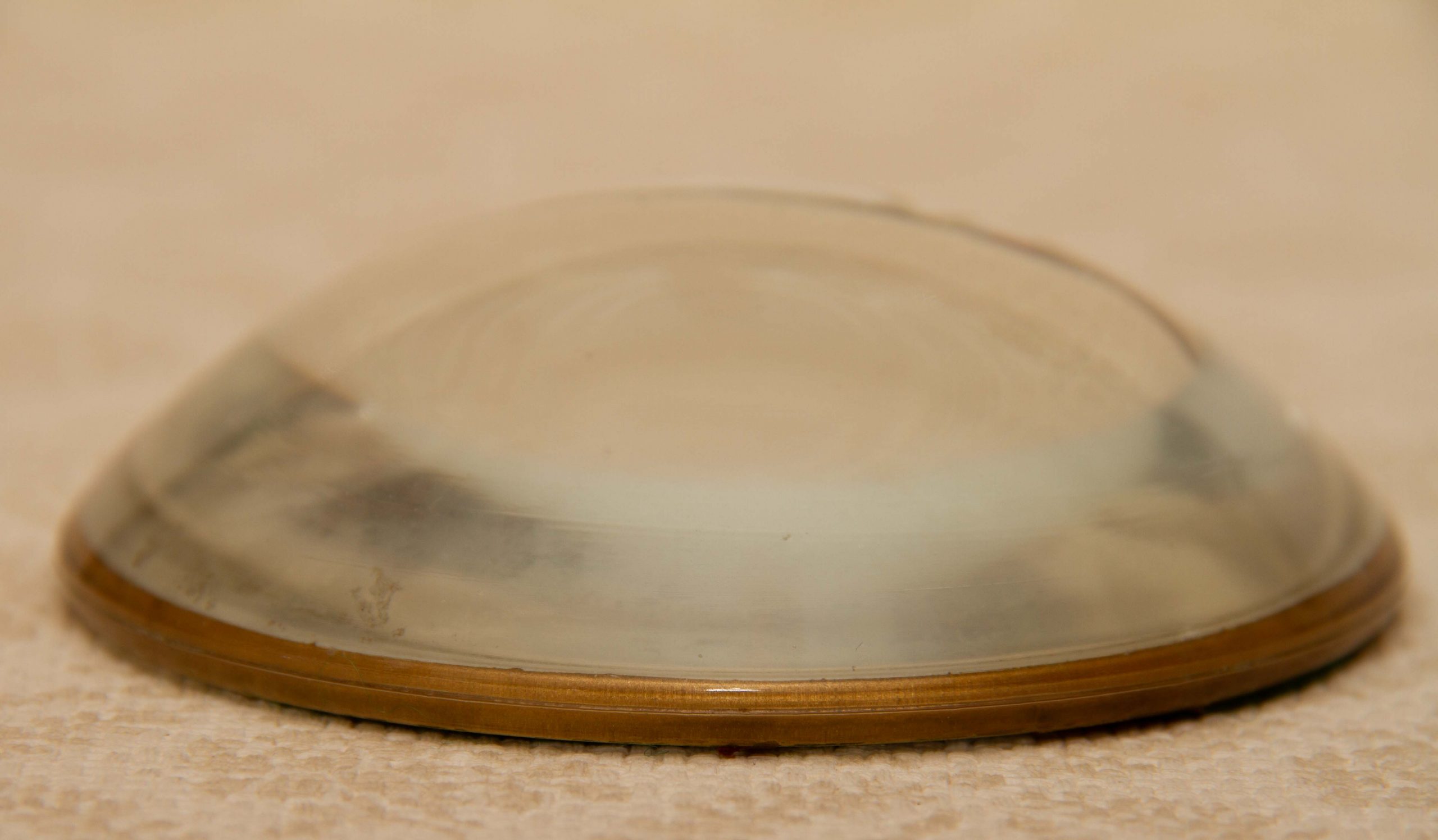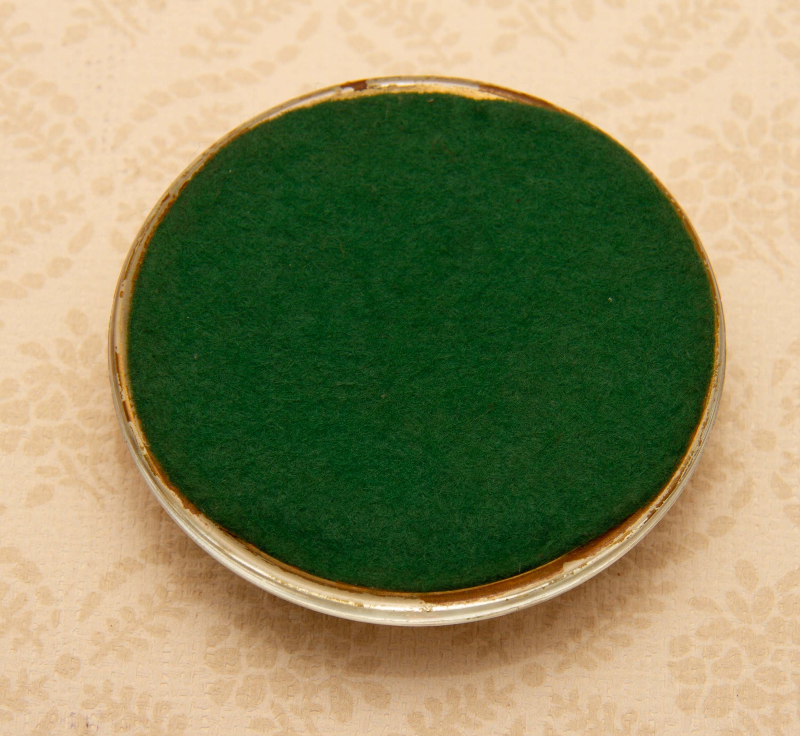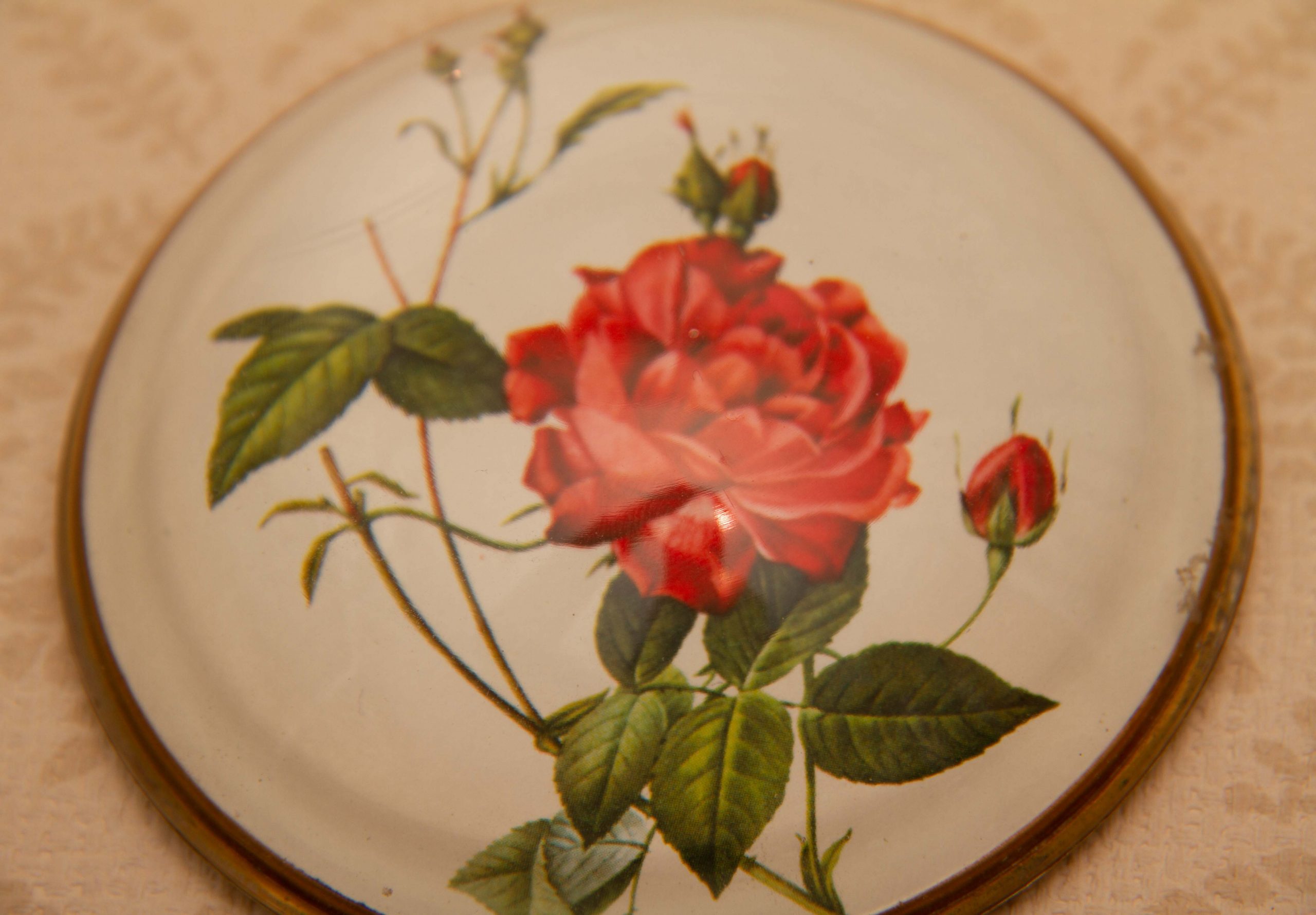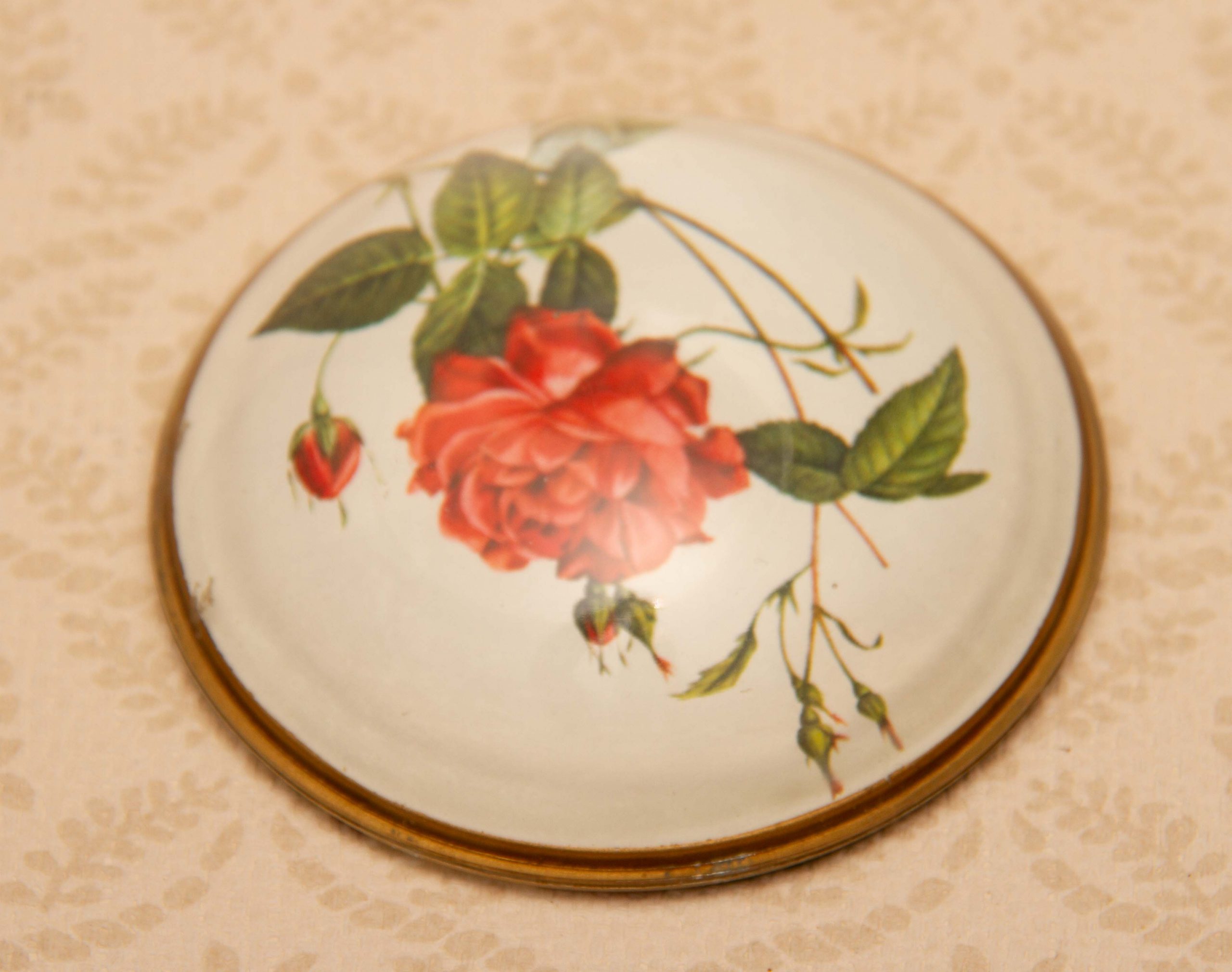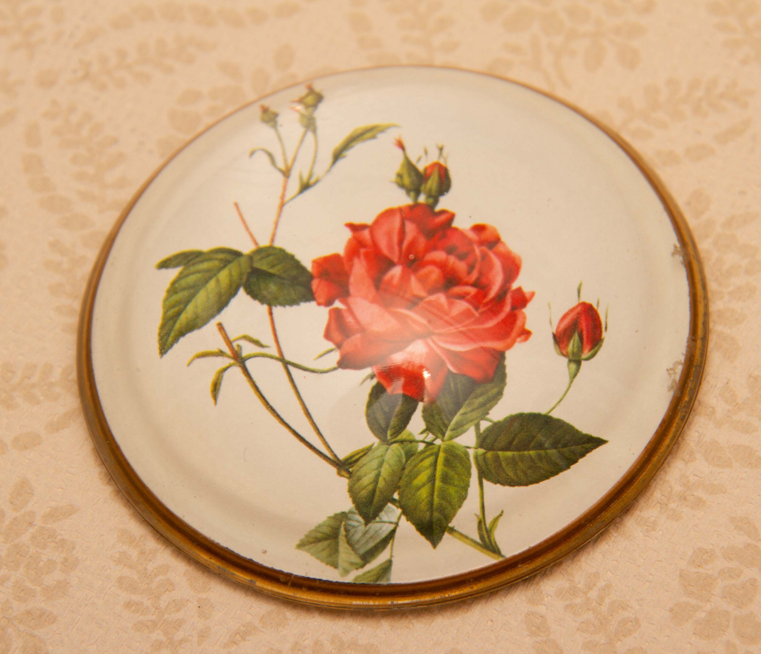A decorative glass dome paperweight with a kitsch red rose design, and a green baize base and gilt metal edge around the base. Vintage 1960’s