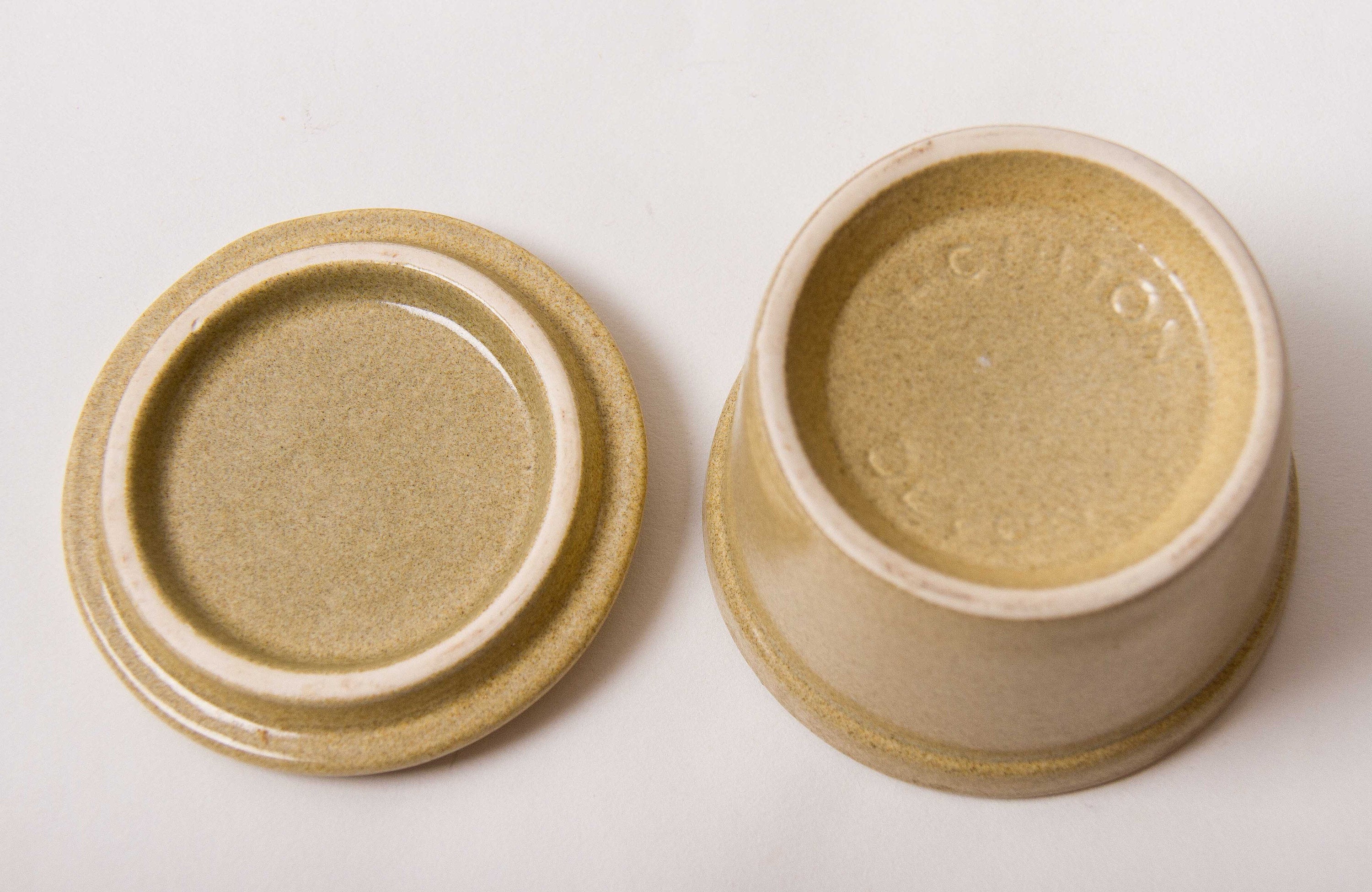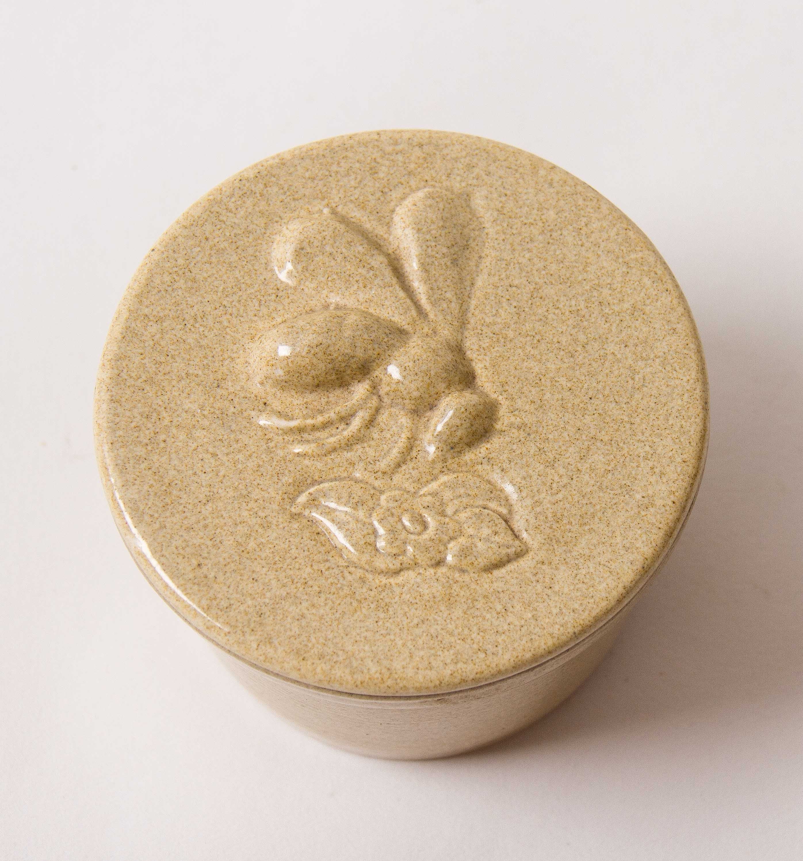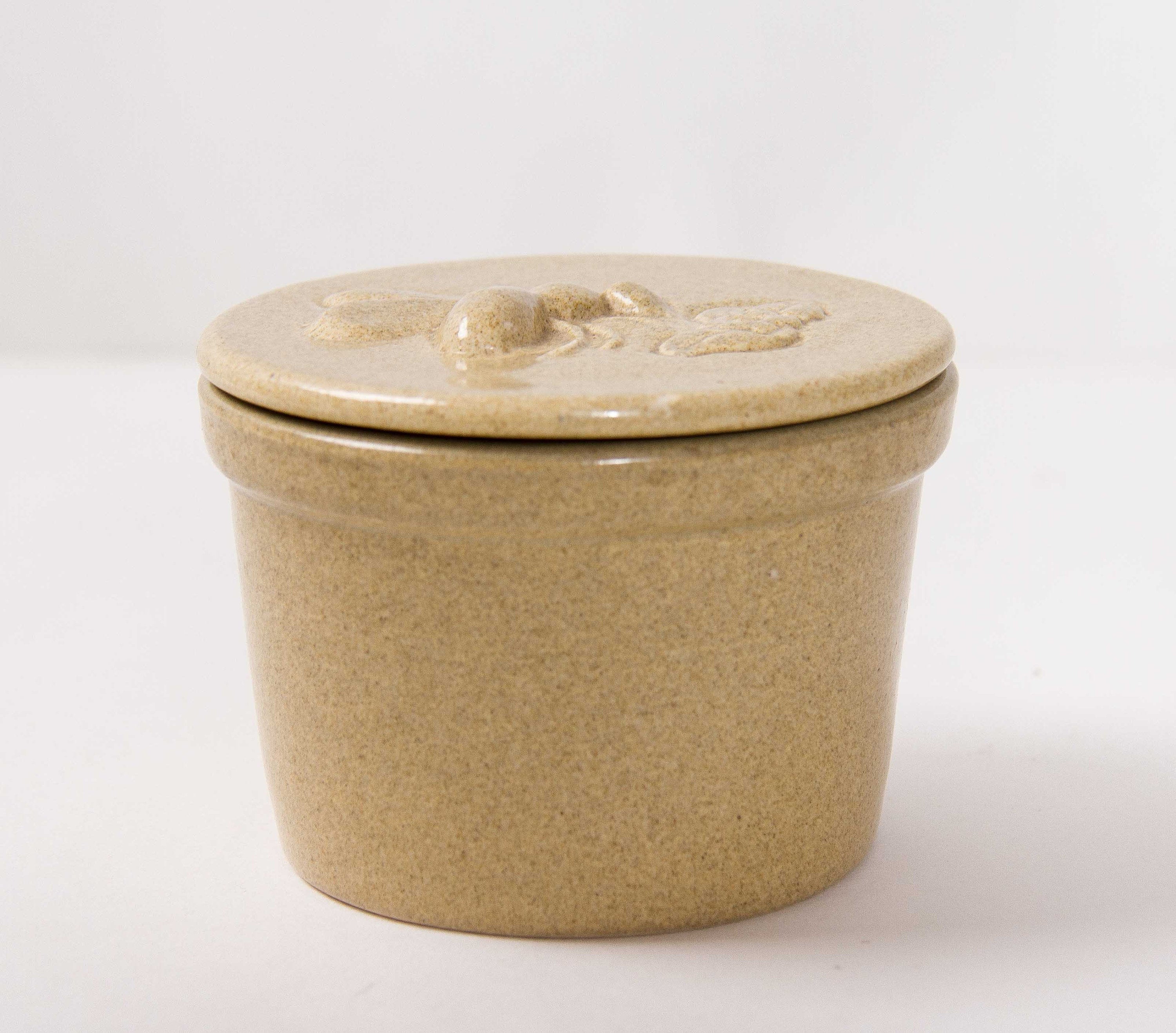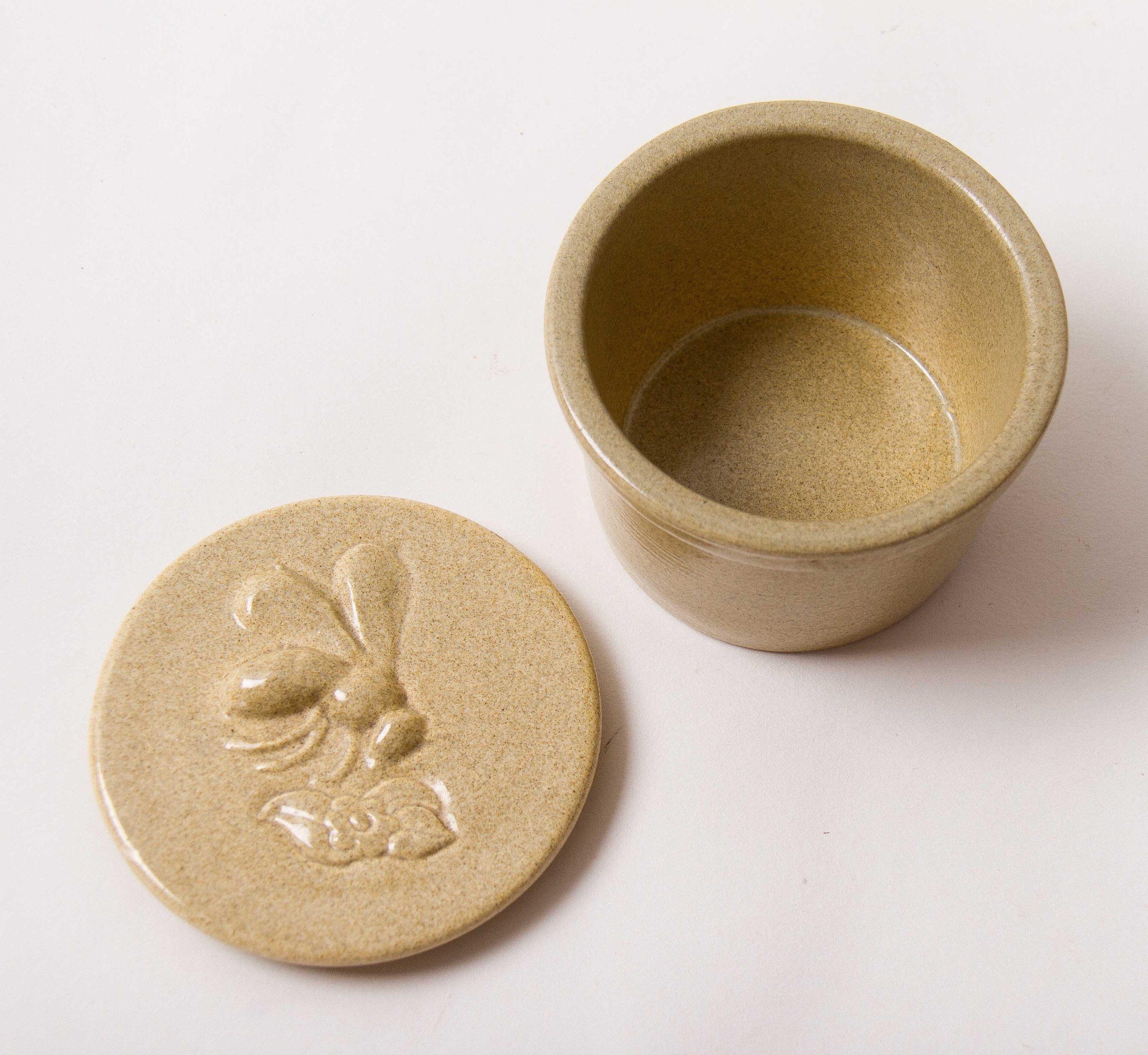 STUDIO HONITON DEVON POTTERY HONEY POT A sweet little stoneware honey pot with lid in sand colour. The lid has an embossed bee going about gathering pollen from a flower with leaves.