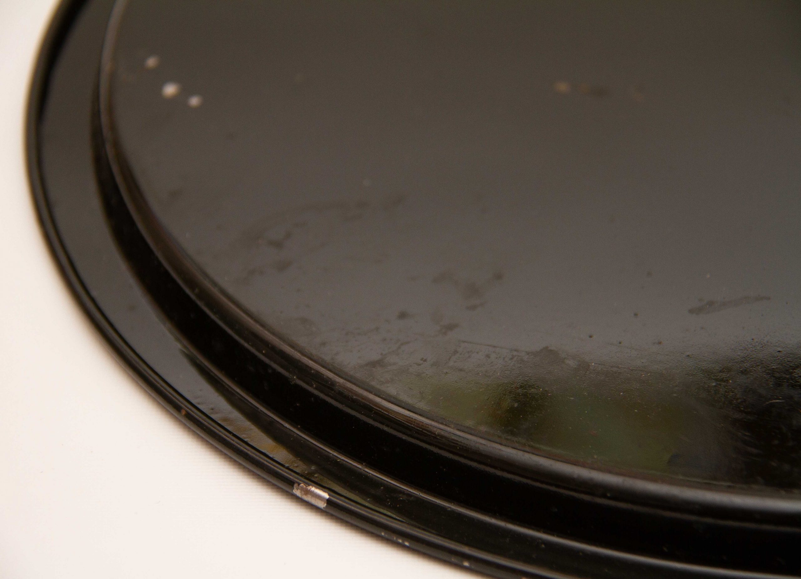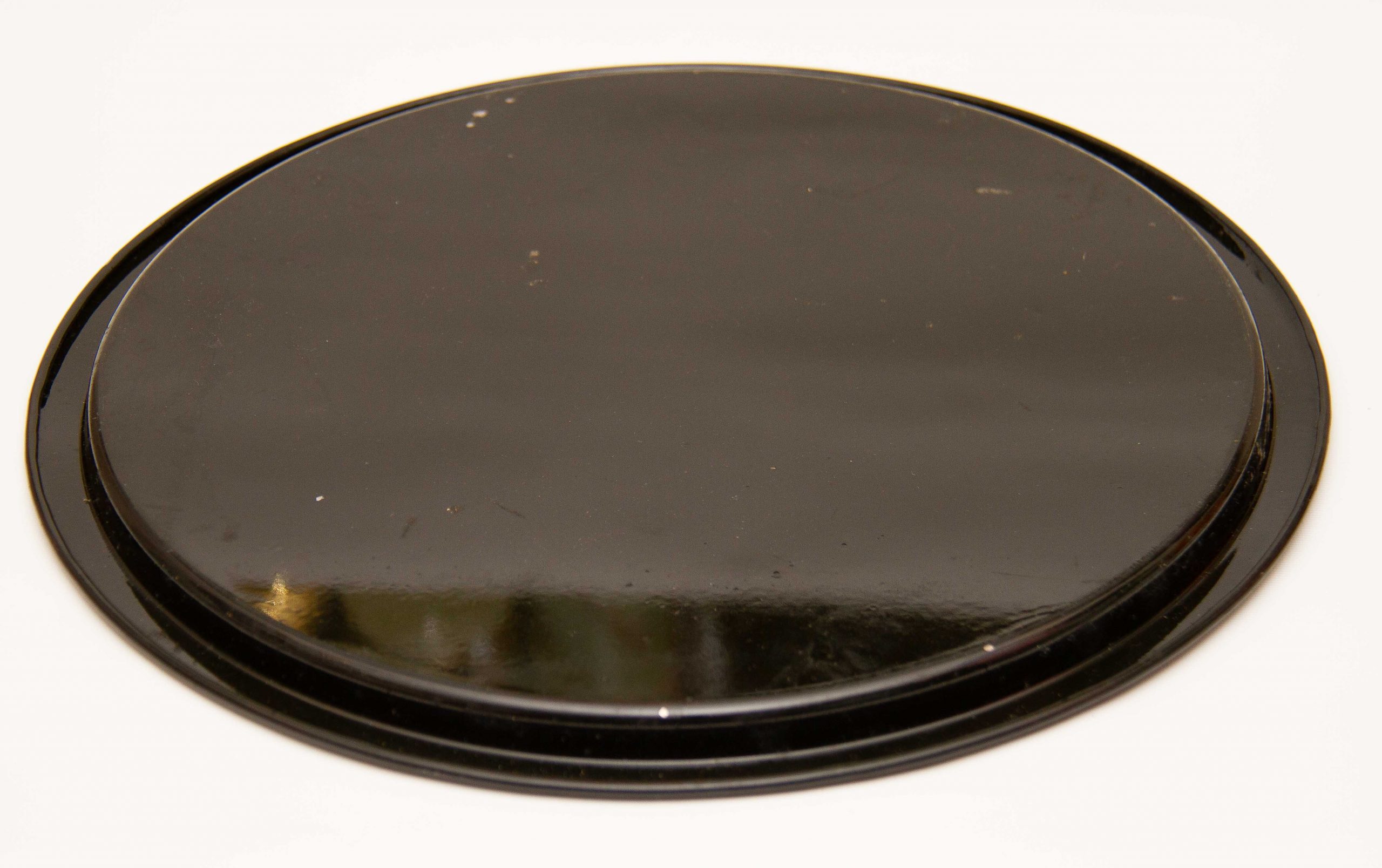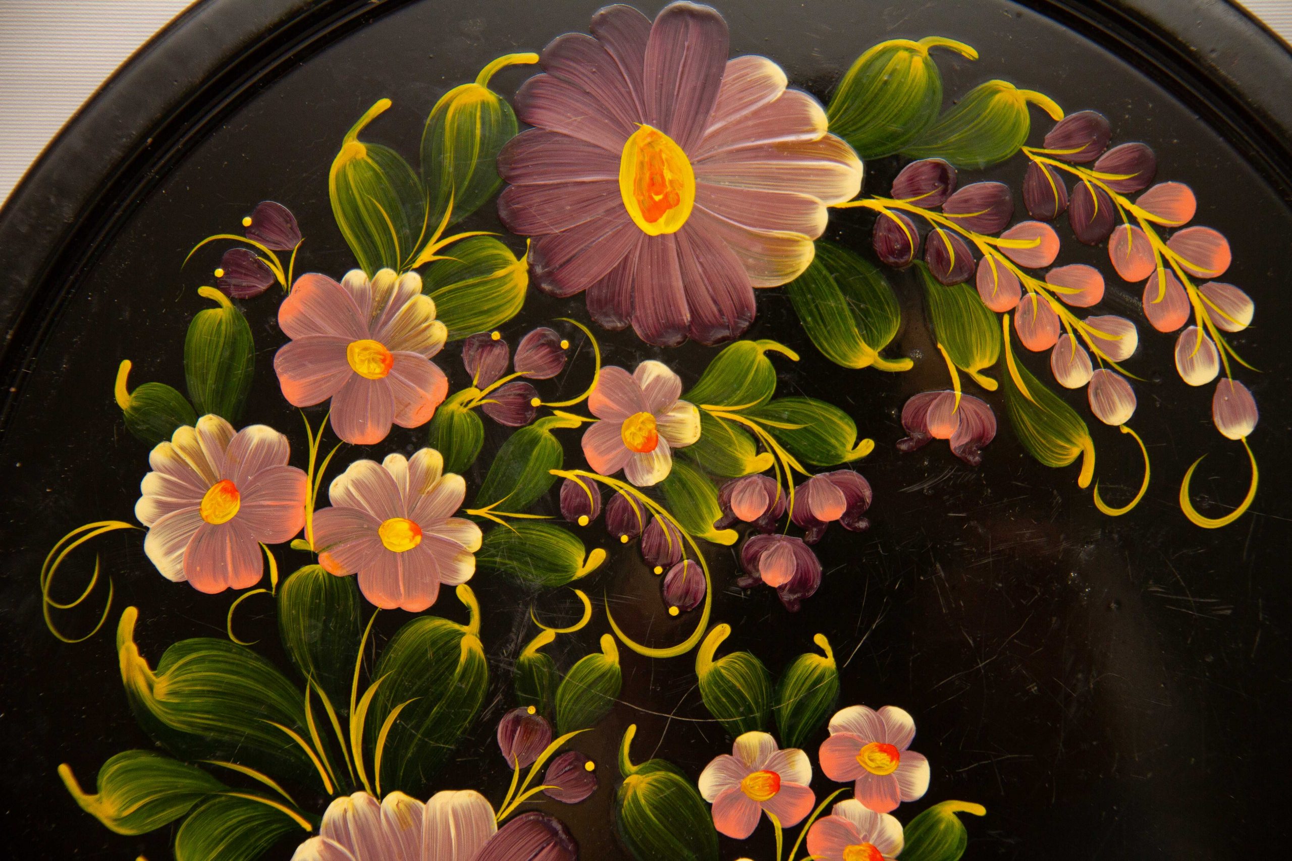 An vintage round metal tray in black with hand painted flowers on.