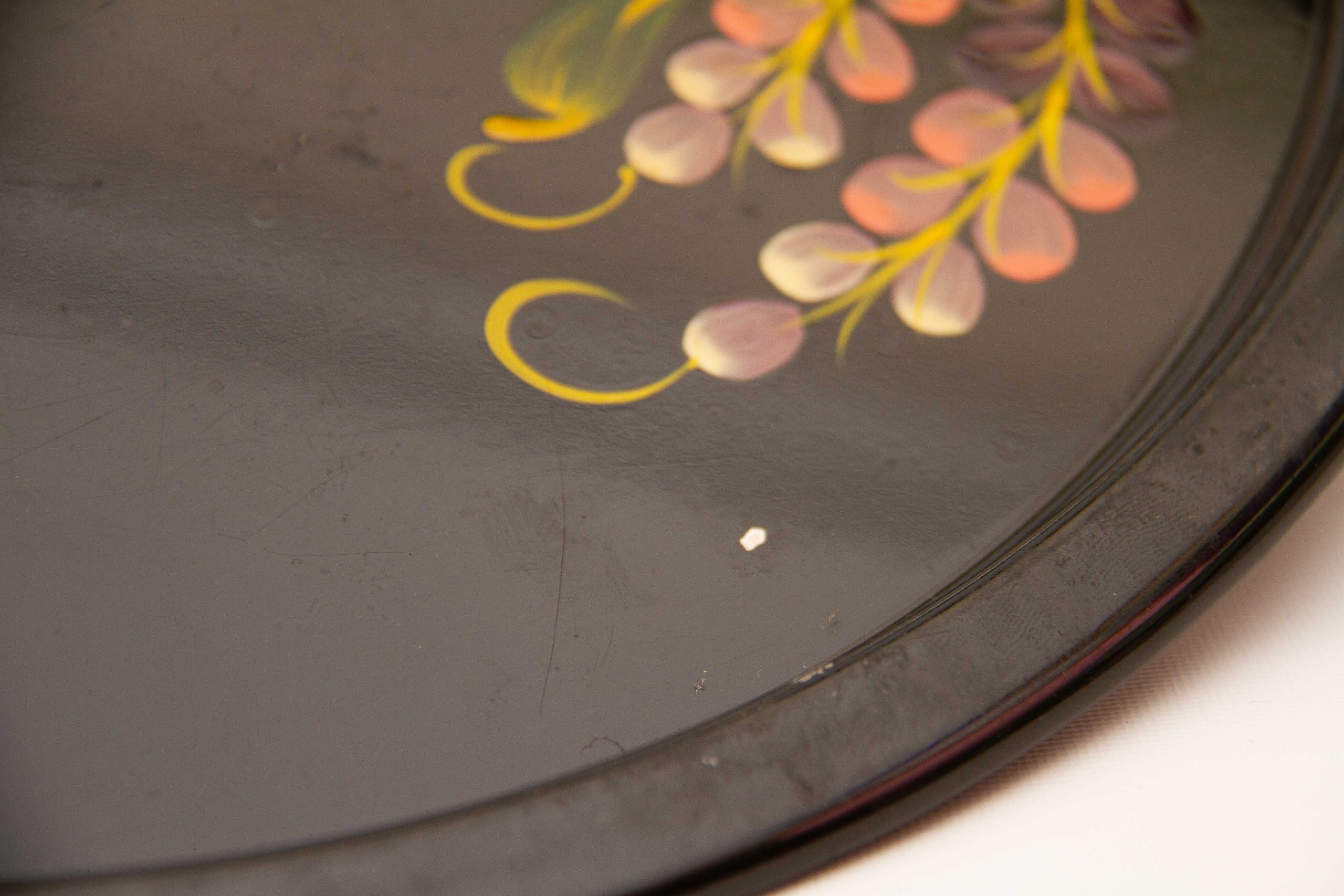 Vintage Round Black Painted Metal Tray Floral Pattern, Toleware
