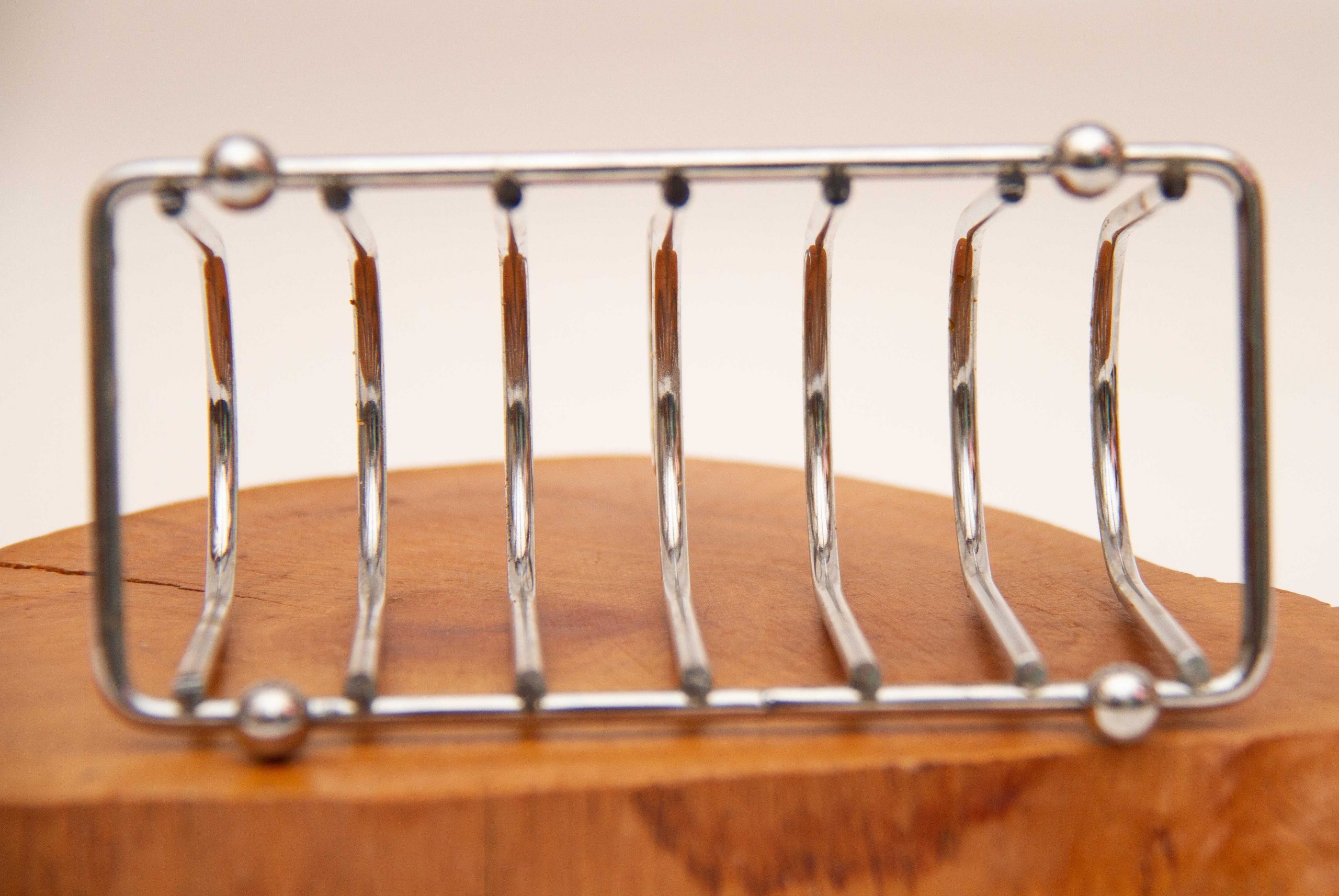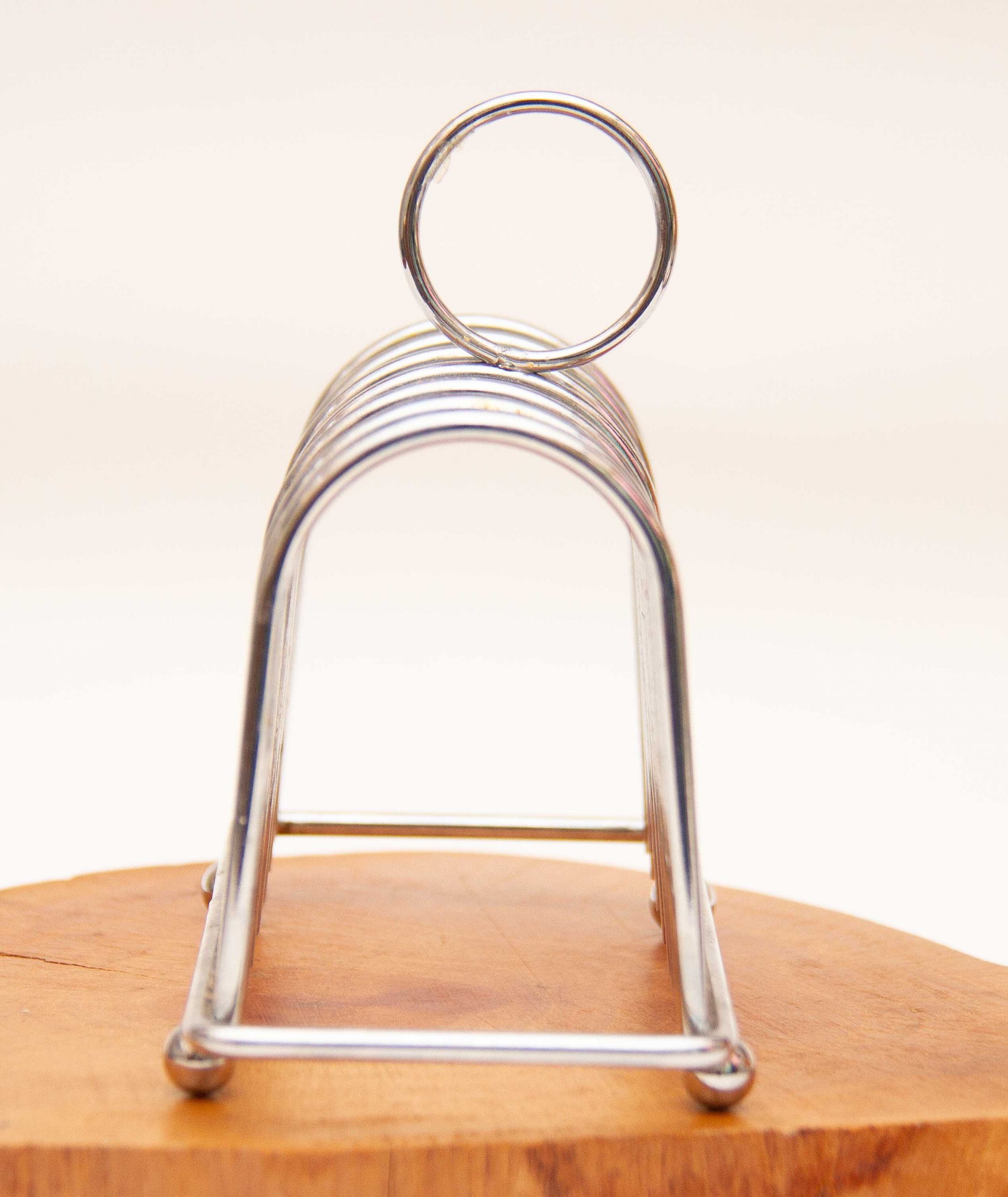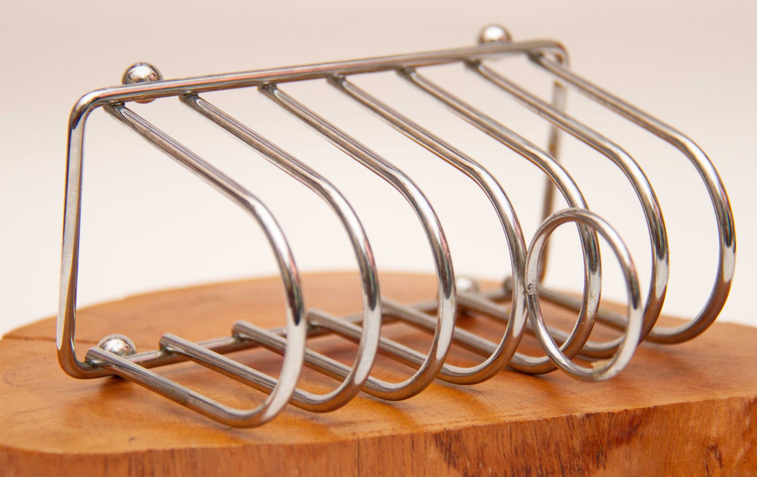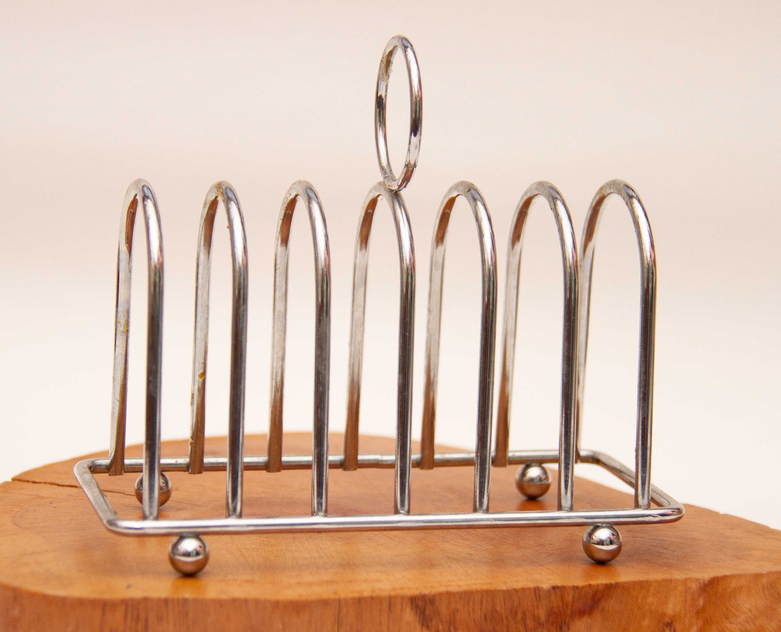 A vintage metal toast rack in silver tone metal, raised on ball feet.