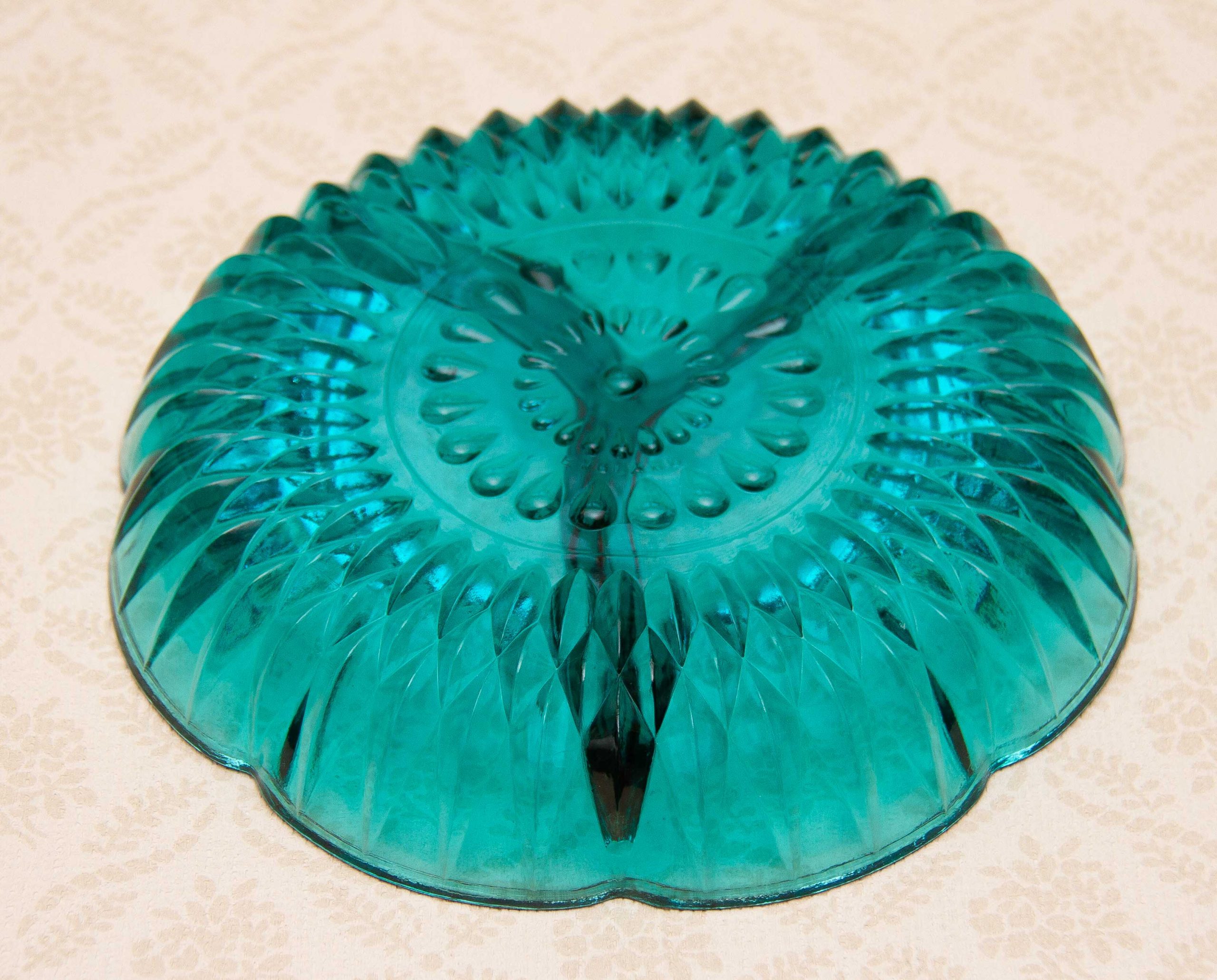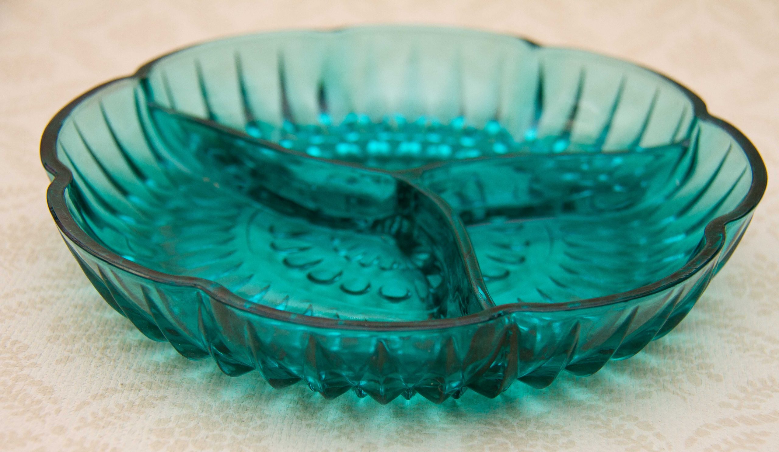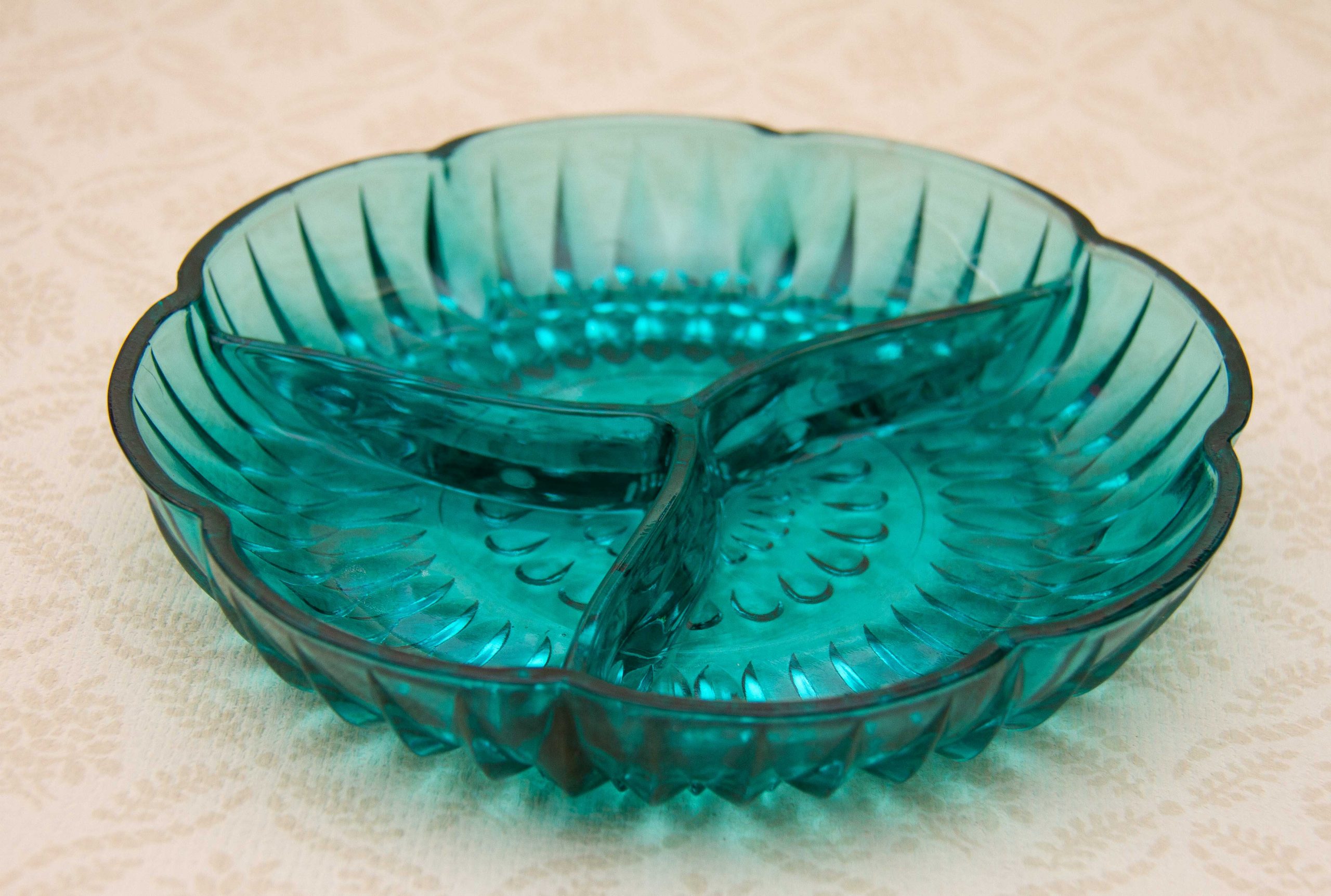 A Davidson glass turquoise 3 section divided class serving dish. Suitable for nuts and snacks, or as a trinket dish.