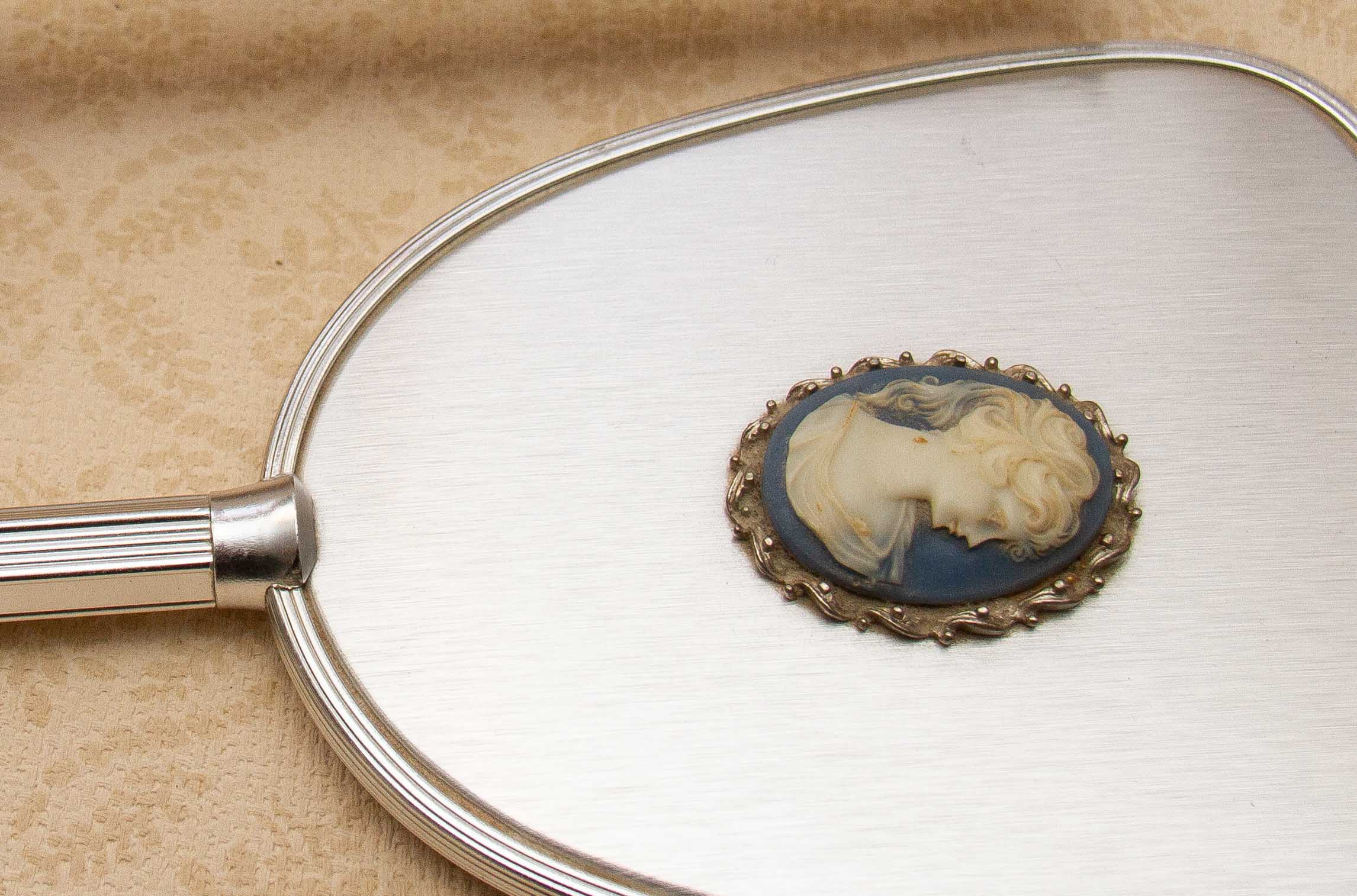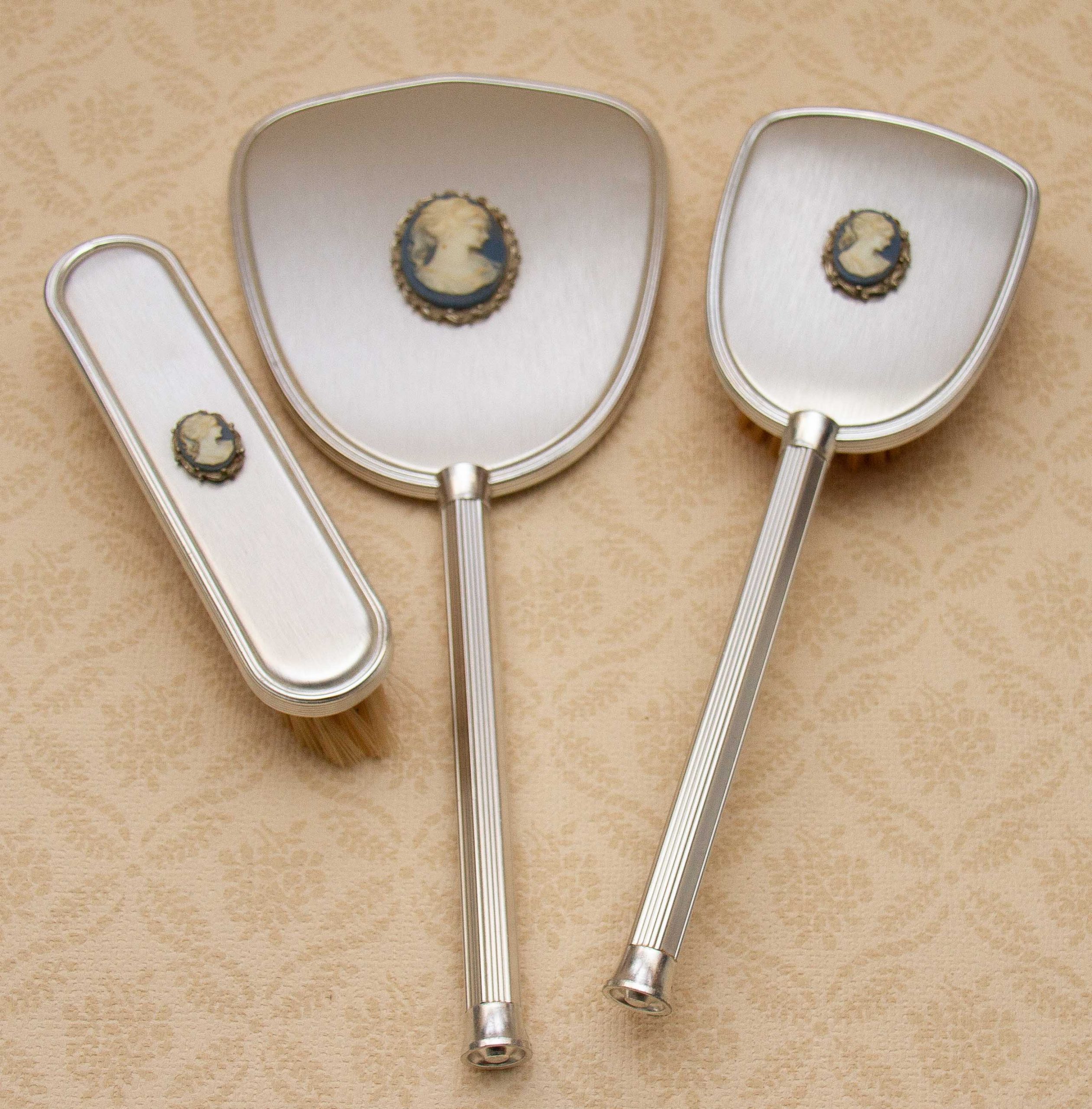 A beautiful vintage dressing table vanity grooming set comprising of a hand mirror a brush with a handle and s small brush. All are in a silver tone metal and each item features a beautiful cameo.