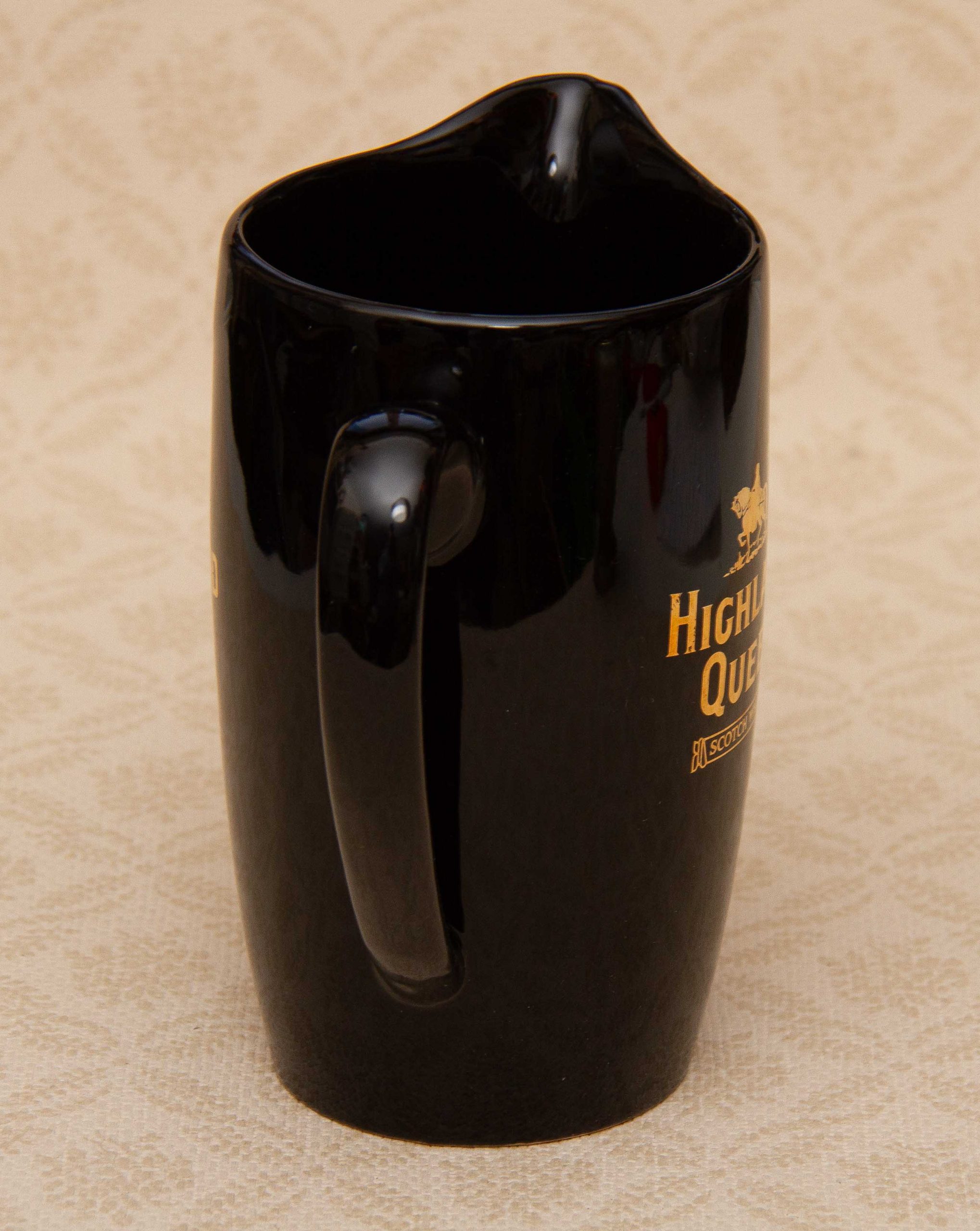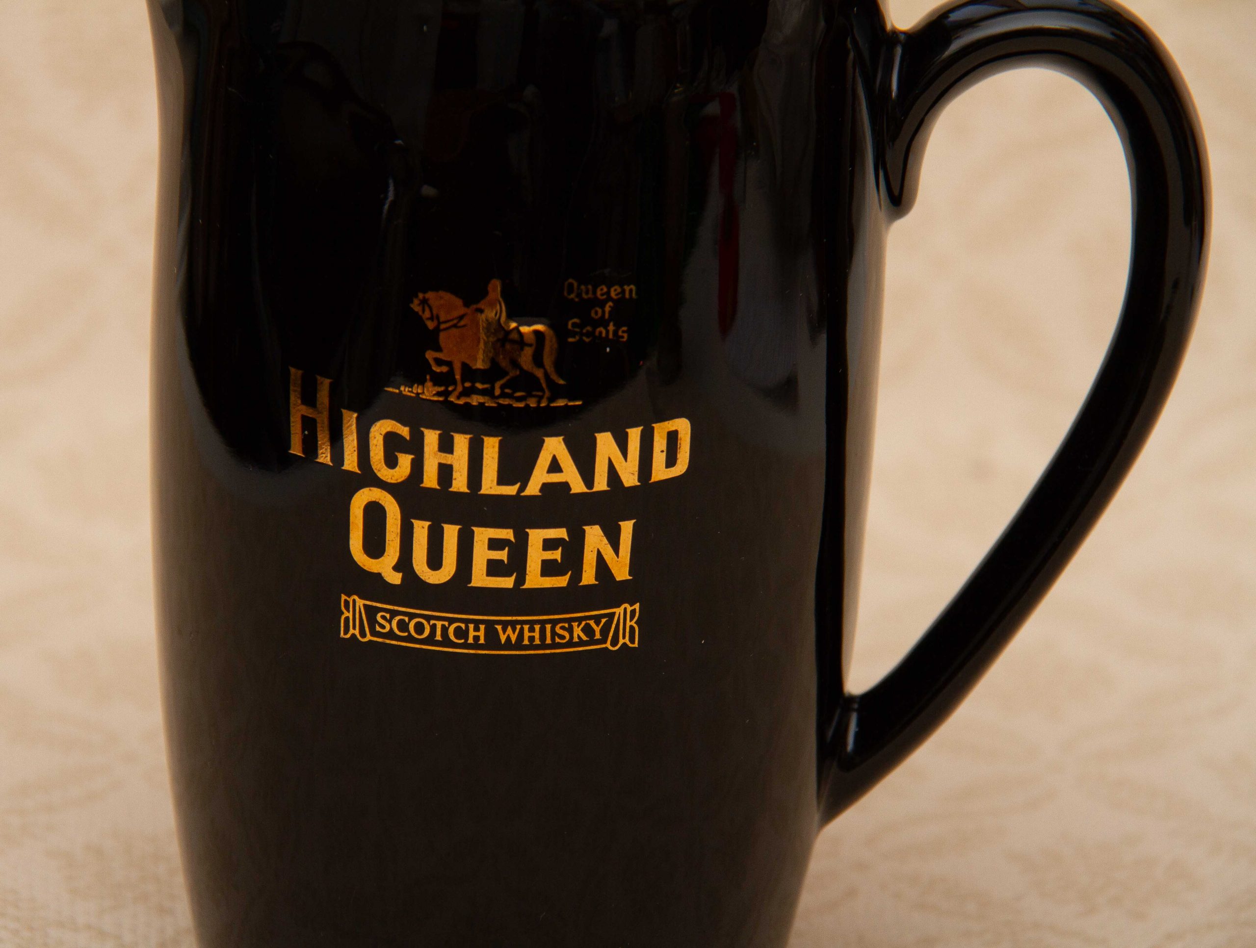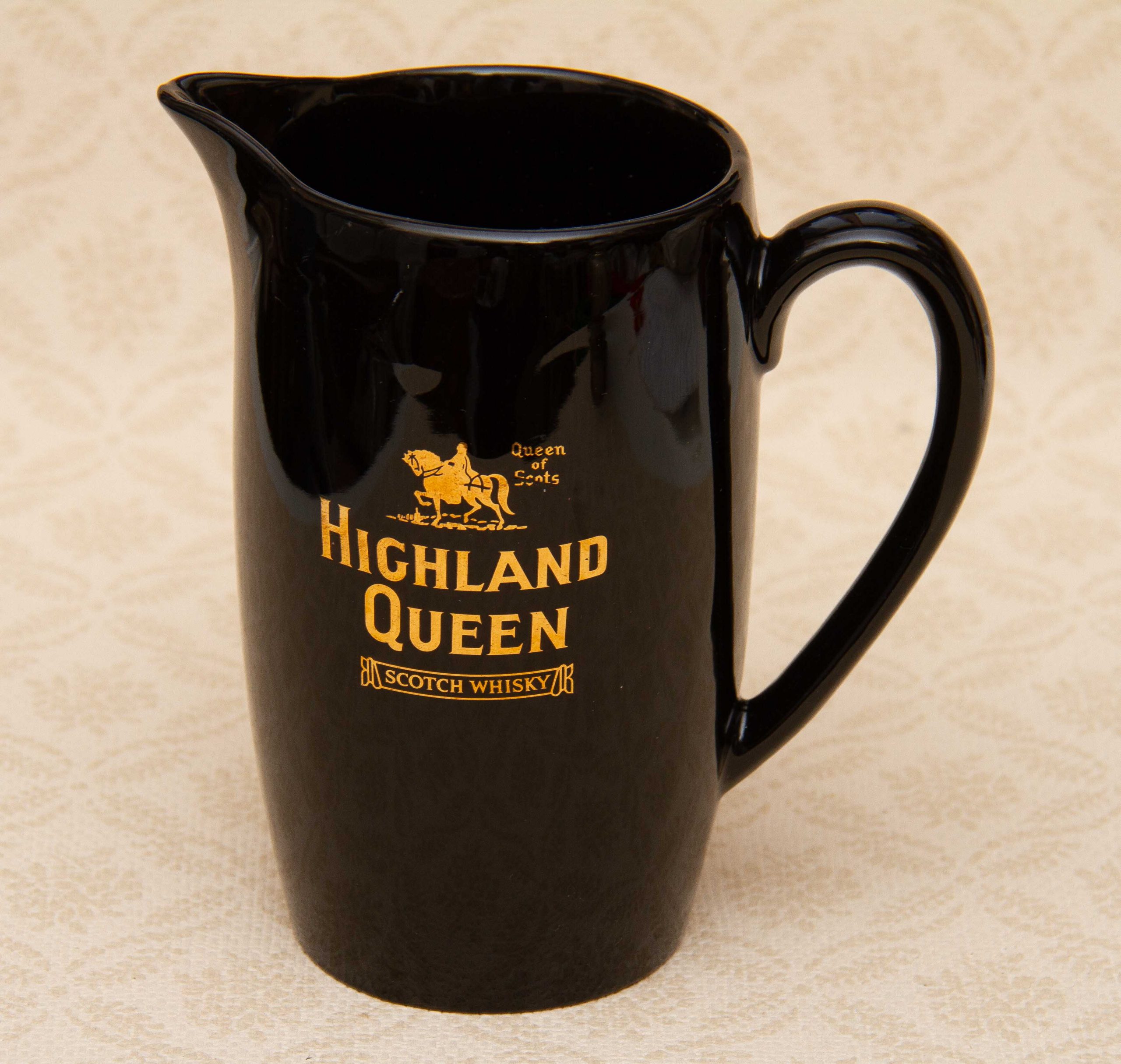 A tall black and gold Highland Queen Scotch Whisky pub jug. Suitable as water pitcher or vase. Made by Wade, England.