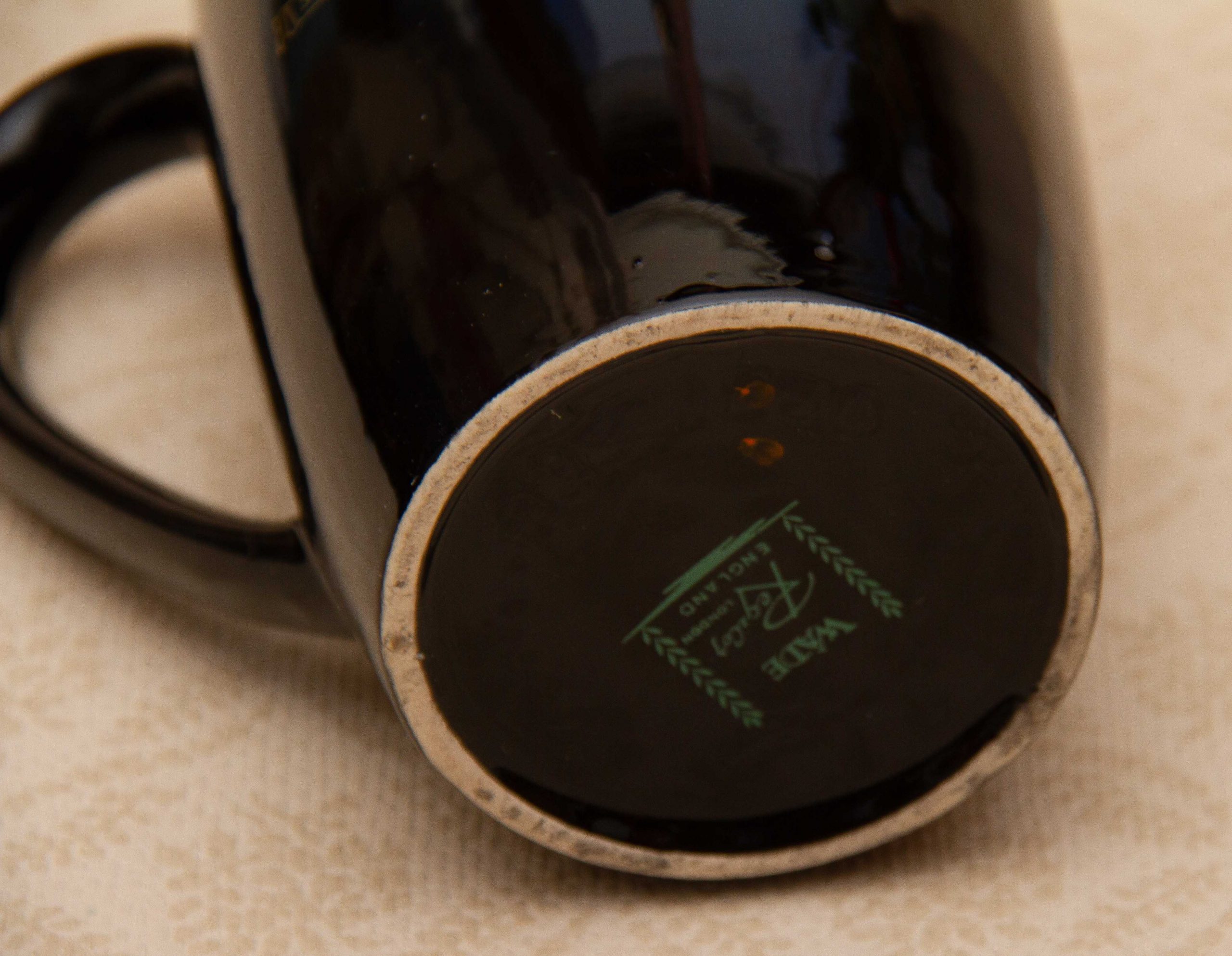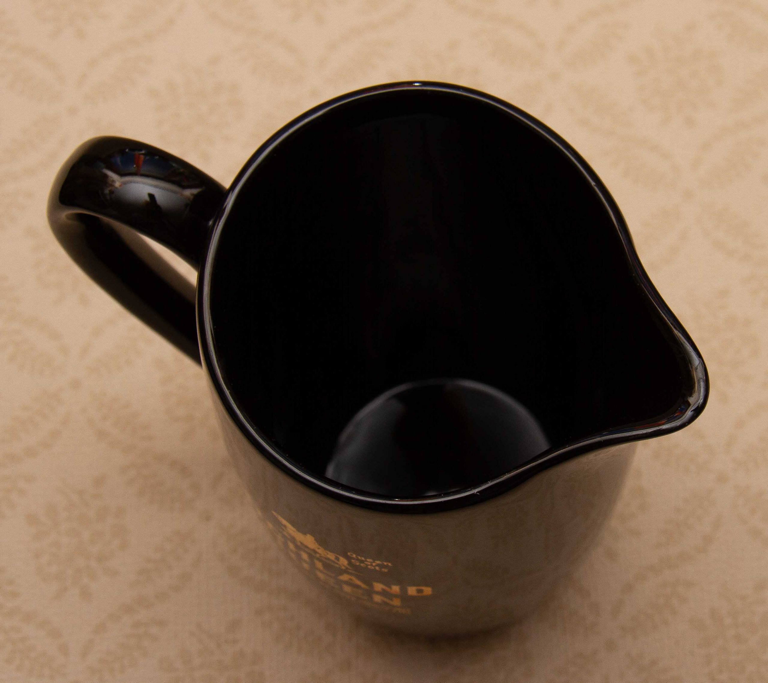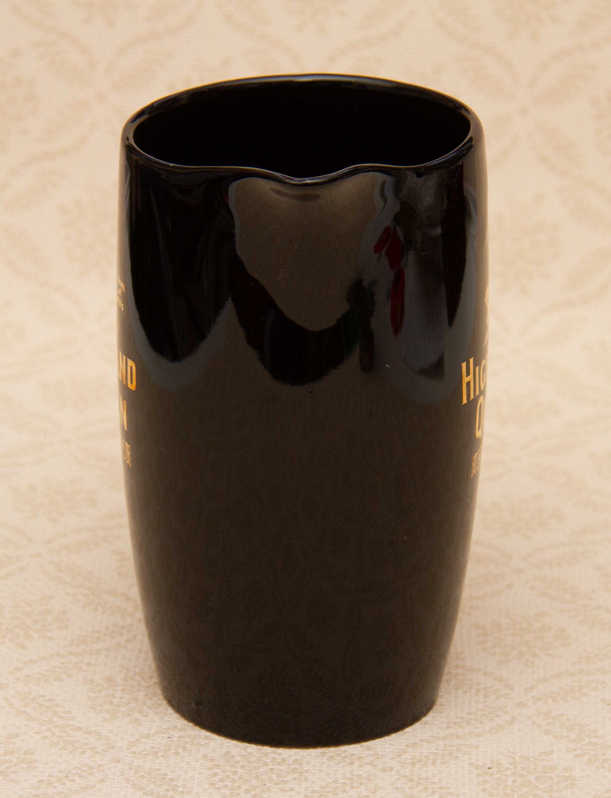 A tall black and gold Highland Queen Scotch Whisky pub jug. Suitable as water pitcher or vase. Made by Wade, England.