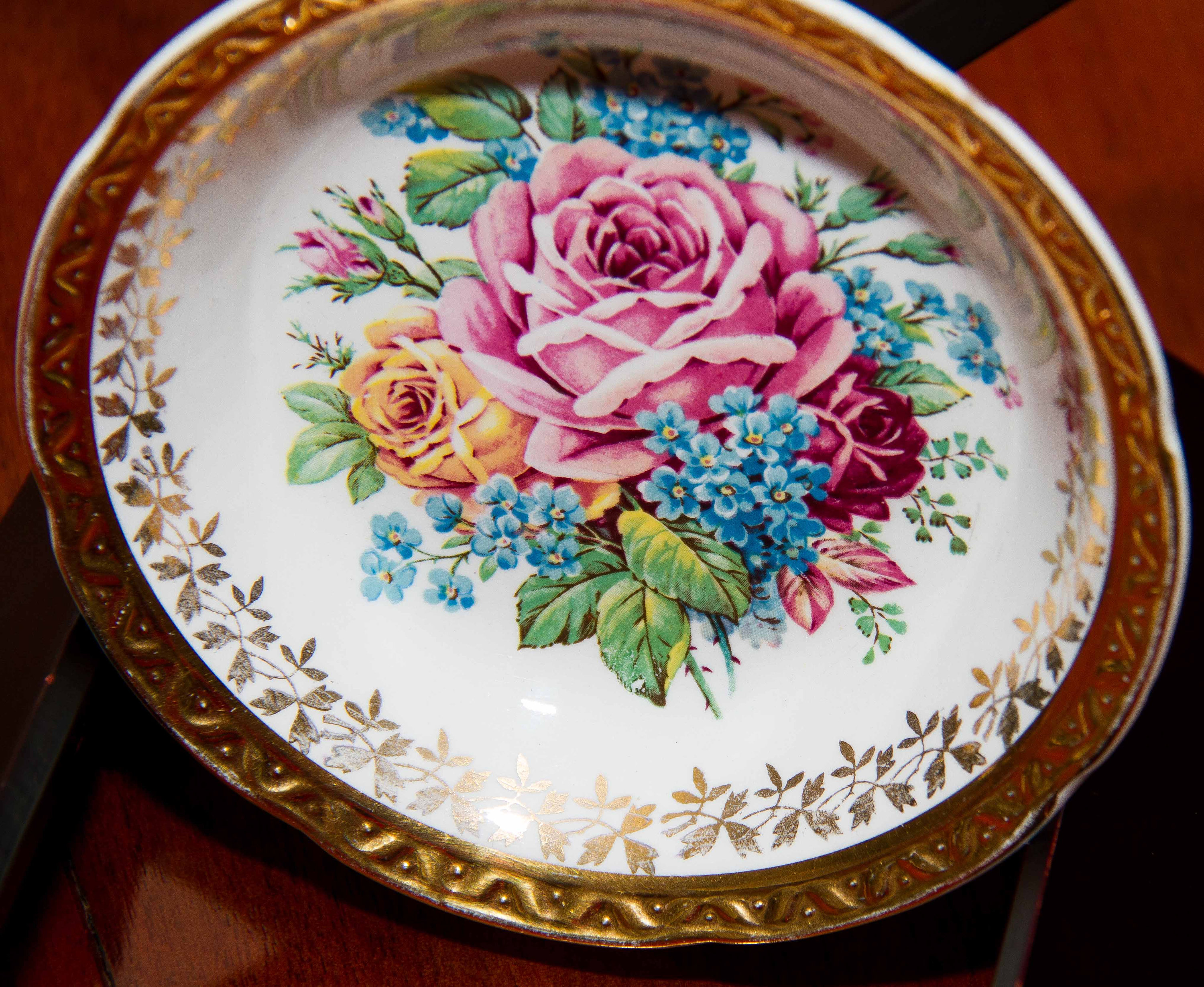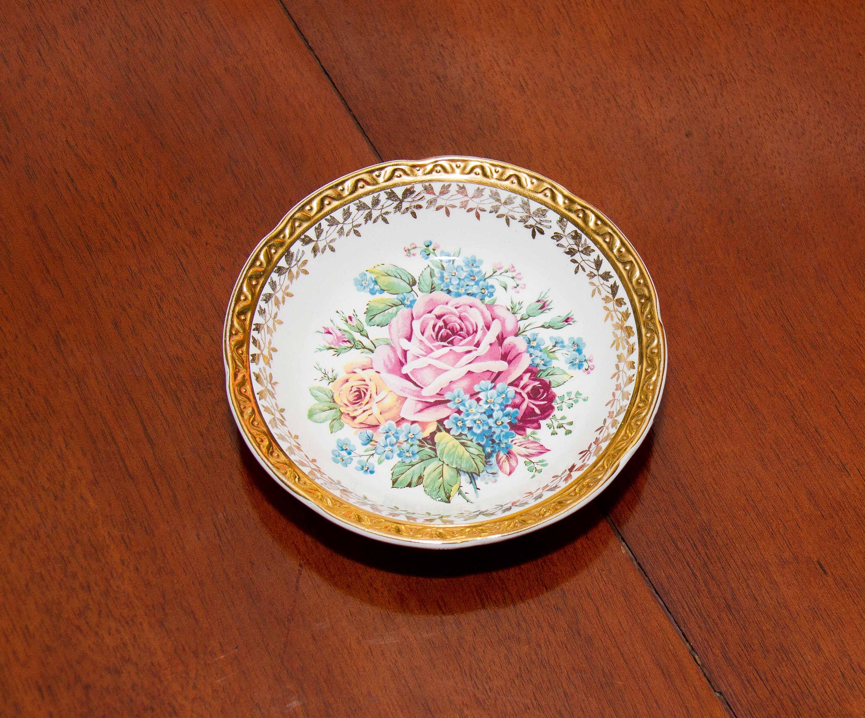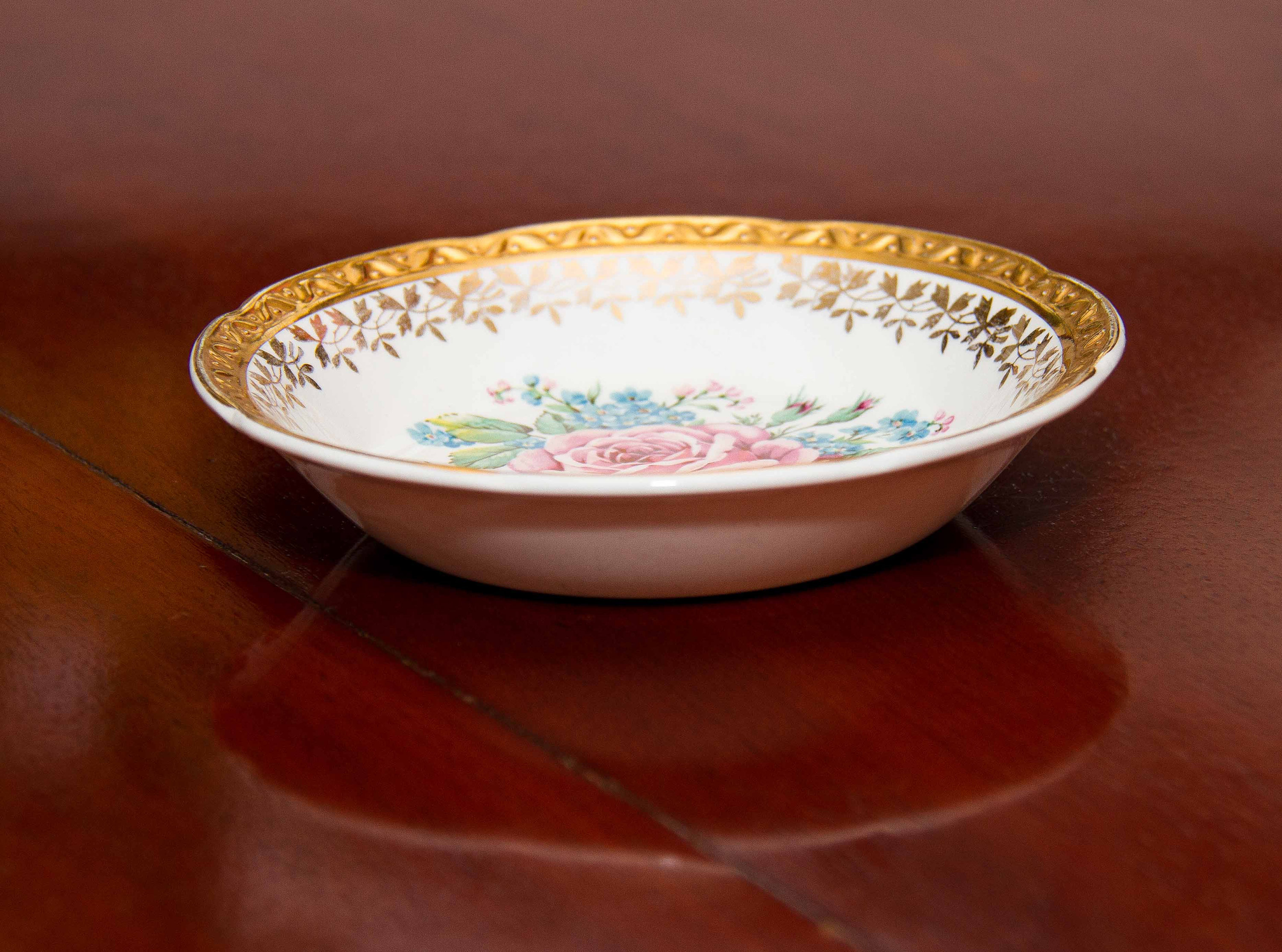 Weatherby Hanley Royal Falcon Ware small dish. With embossed gold edge and large rose pattern.