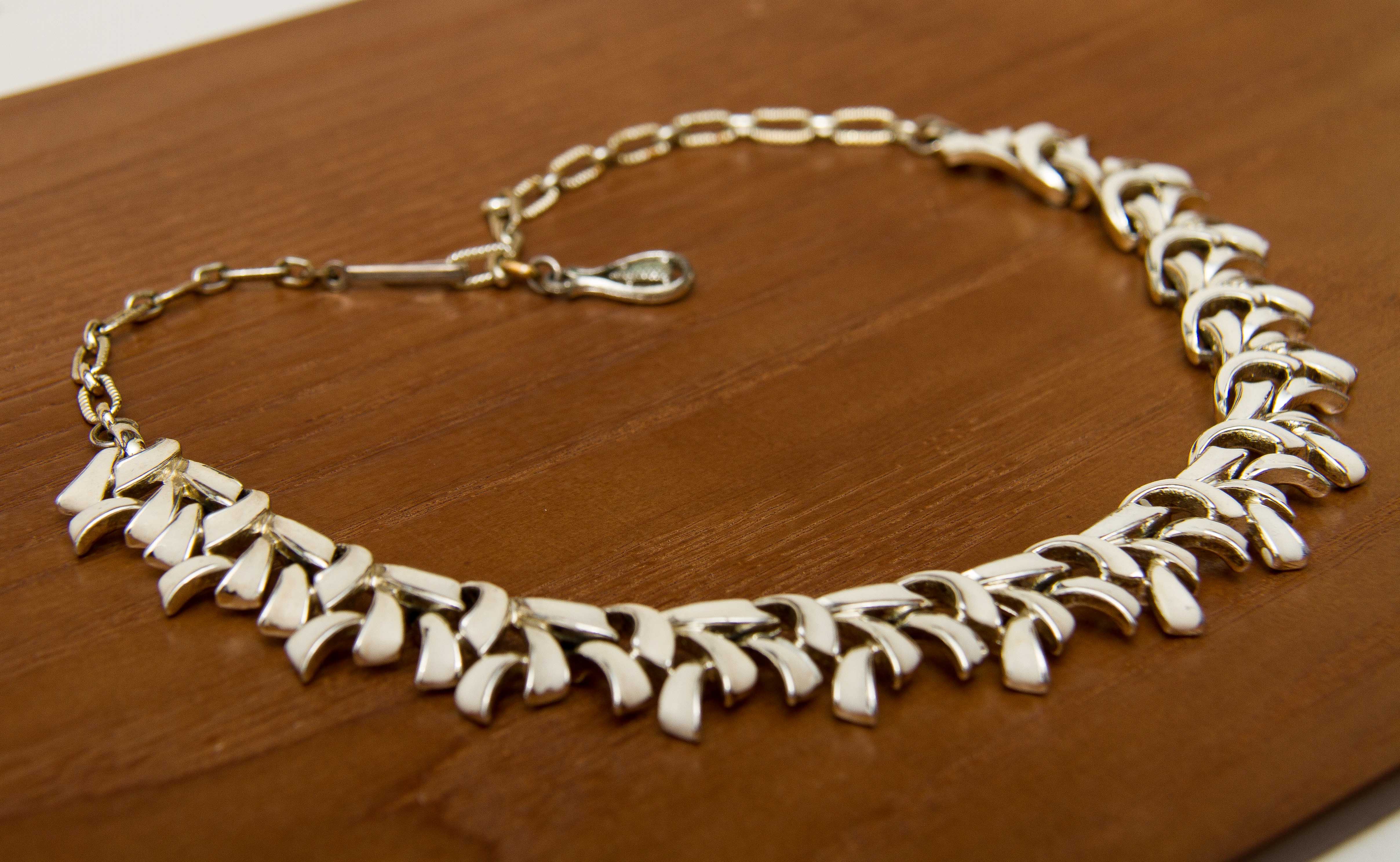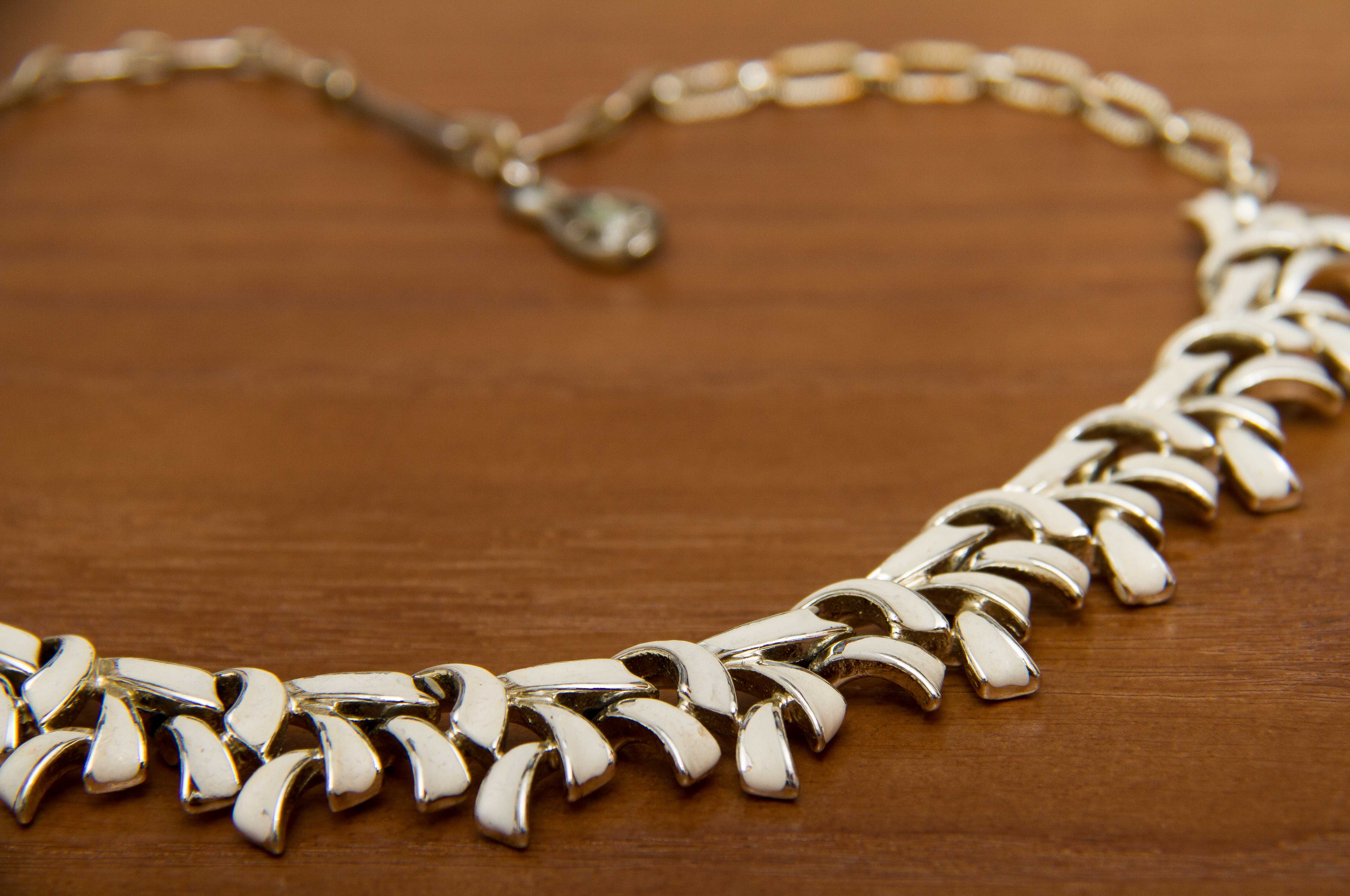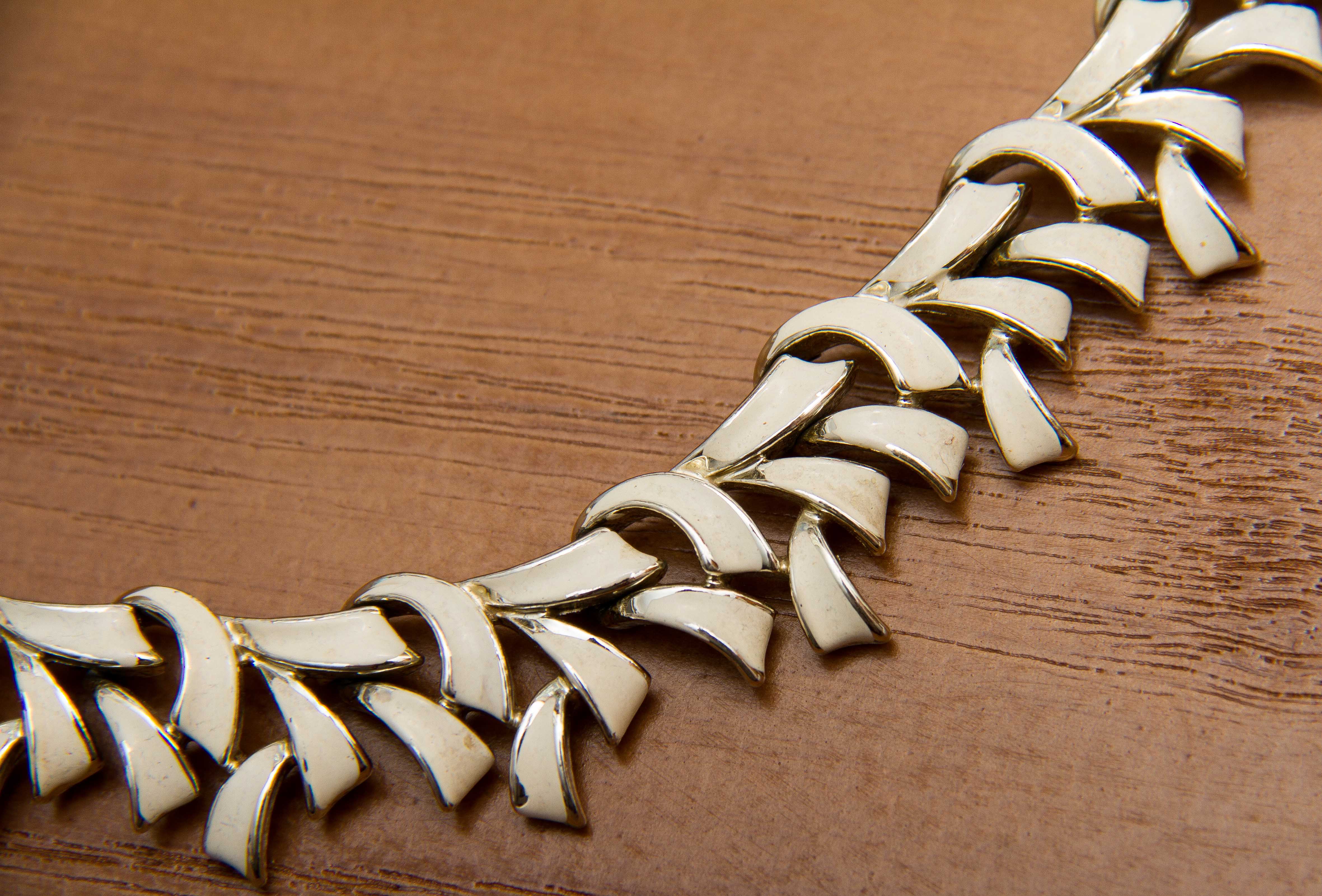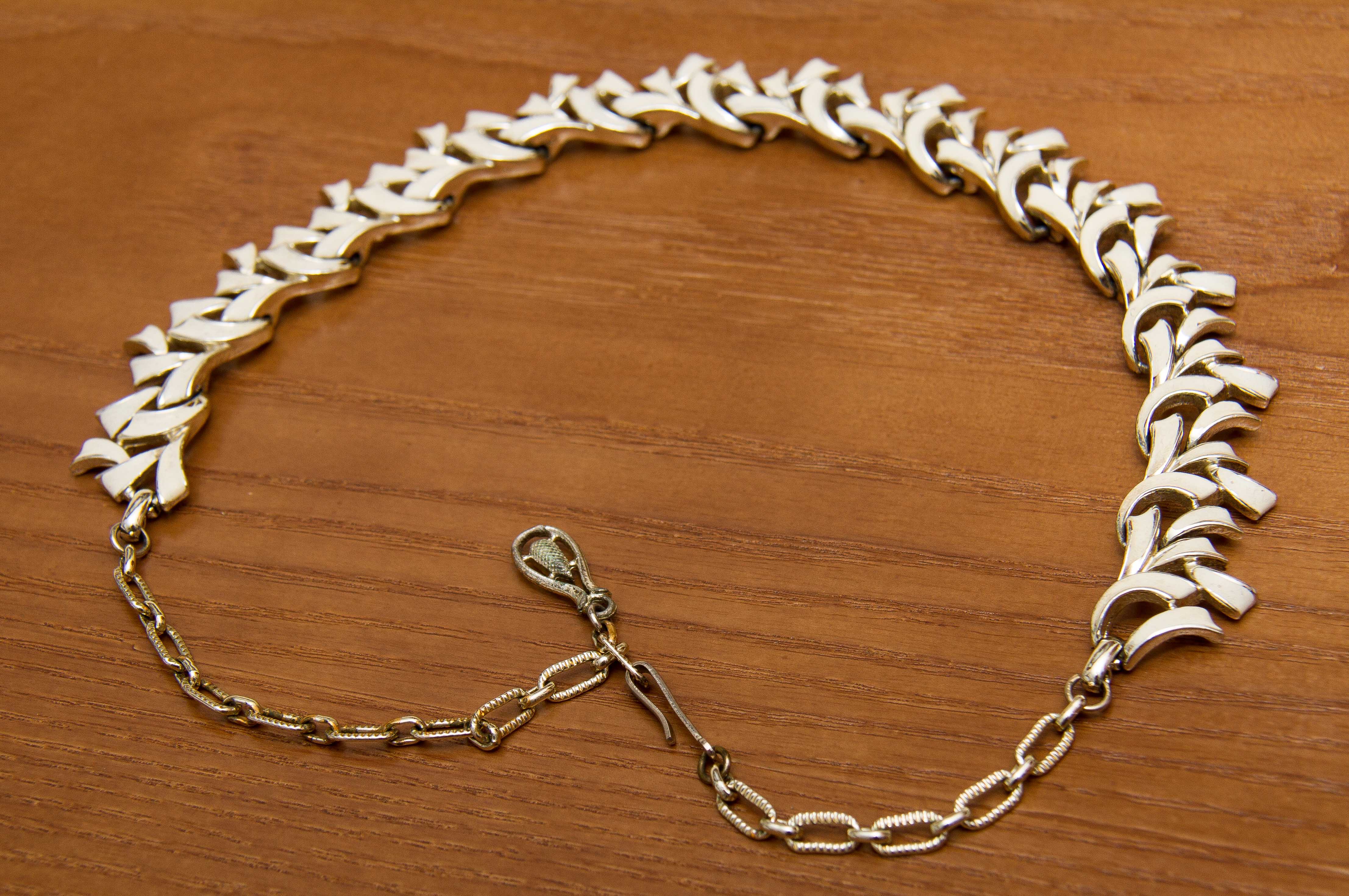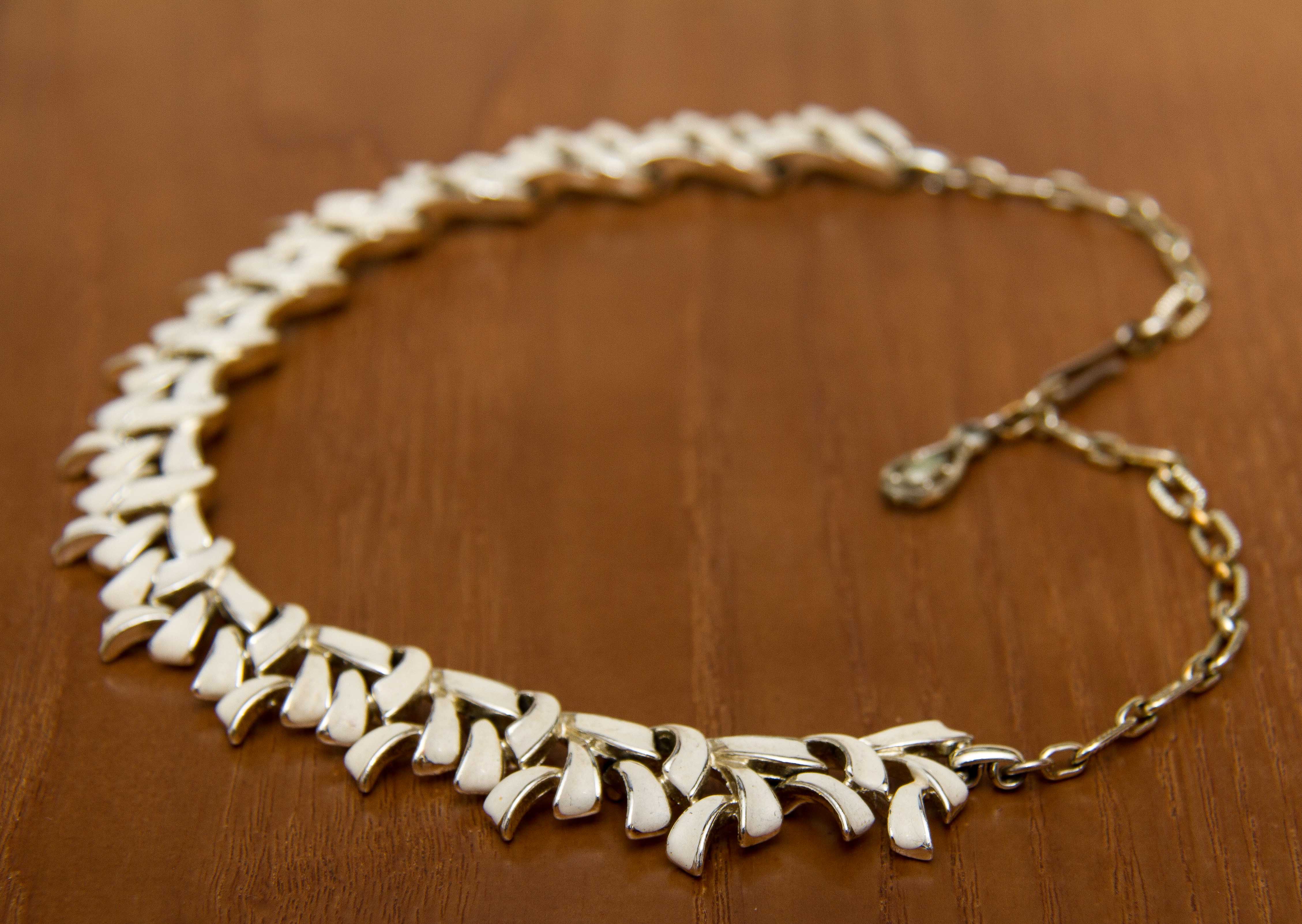 A vintage necklace, white metal with white enamel. Adjustable, with a hook fastening.